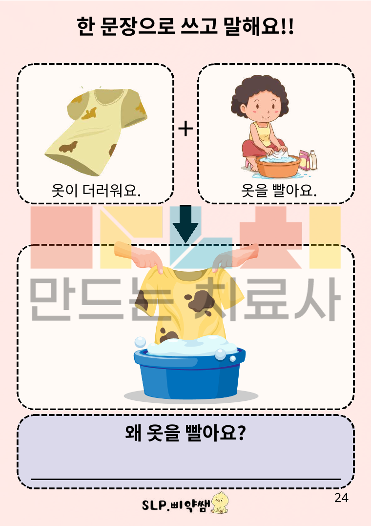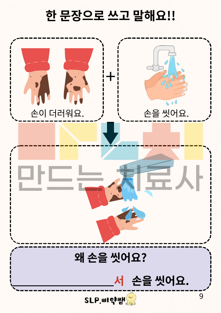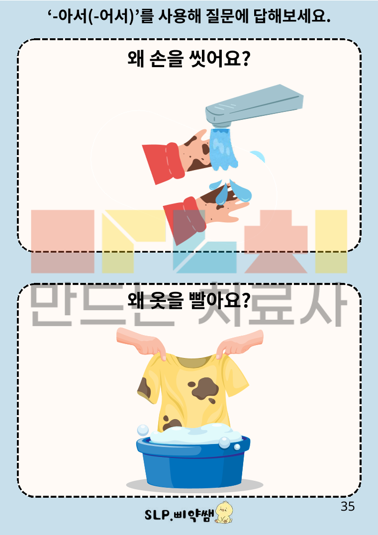 안녕하세요 삐약쌤입니다^^ '왜'의문사를 이해하고, 그 질문에 적절하게 '~해서(아서/어서)' 연결어미를 사용해 대답할 수 있도록 구성한 자료입니다. 기본적으로 '왜'질문을 이해하고, '~해서(아서/어서)' 연결어미 사용을 이해 및 표현하는데 중점을 두었으므로 쉬운 내용으로 구성하였습니다. (추후 추론을 해야 하는 '왜'질문과 대답을 포함하는 내용도 추가 구상중입니다^^)