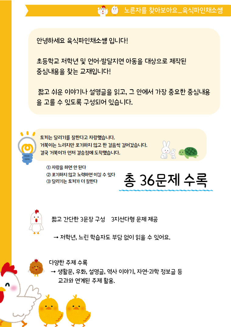 초등 저학년과 언어·발달지연 아동을 위한 교재입니다. 짧은 글을 읽고 3지선다 중에서 중심내용을 고르는 활동으로, 글의 핵심을 파악하는 능력을 길러 줍니다. 이 교재는 생활문, 우화, 역사 이야기, 자연·과학 정보글 등 다양한 주제를 다루며, 간단한 3문장 구성으로 누구나 부담 없이 활용할 수 있습니다.