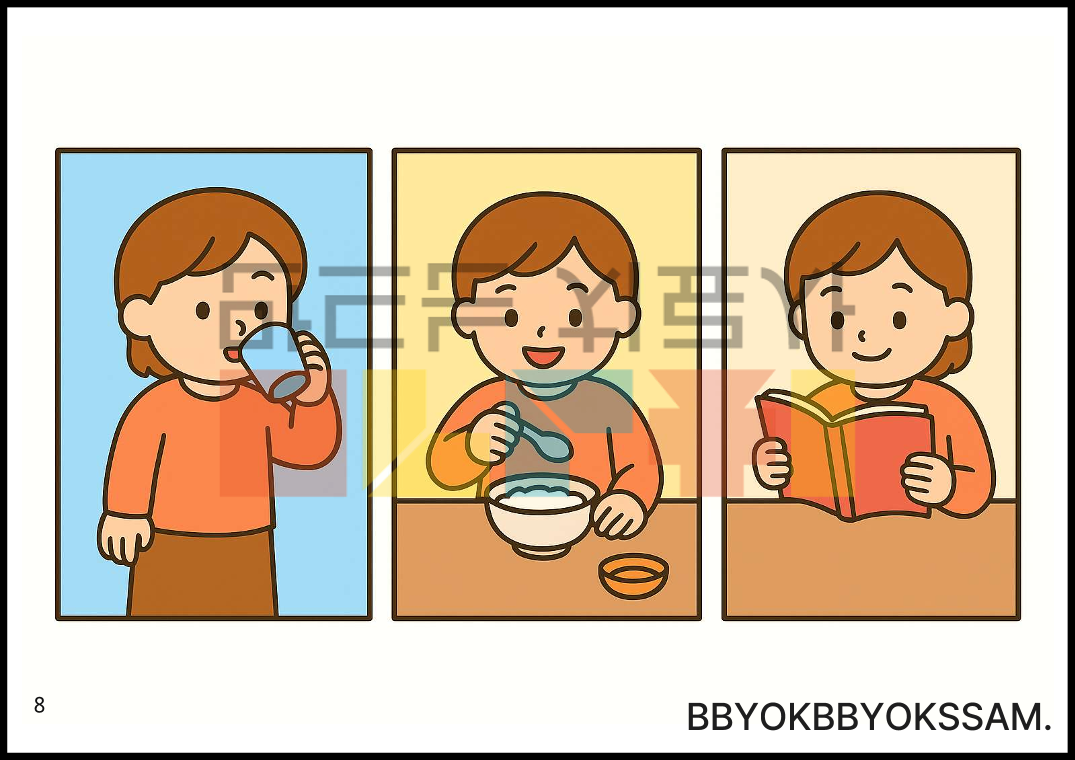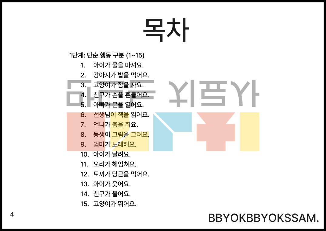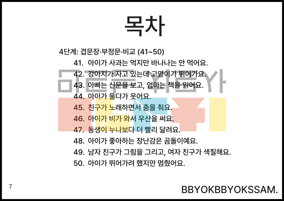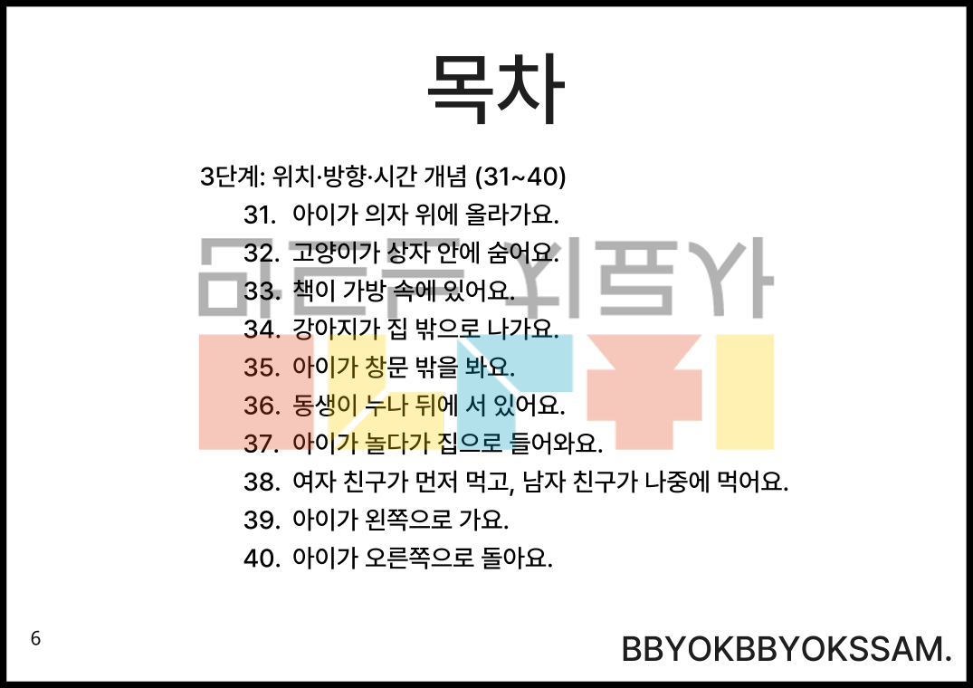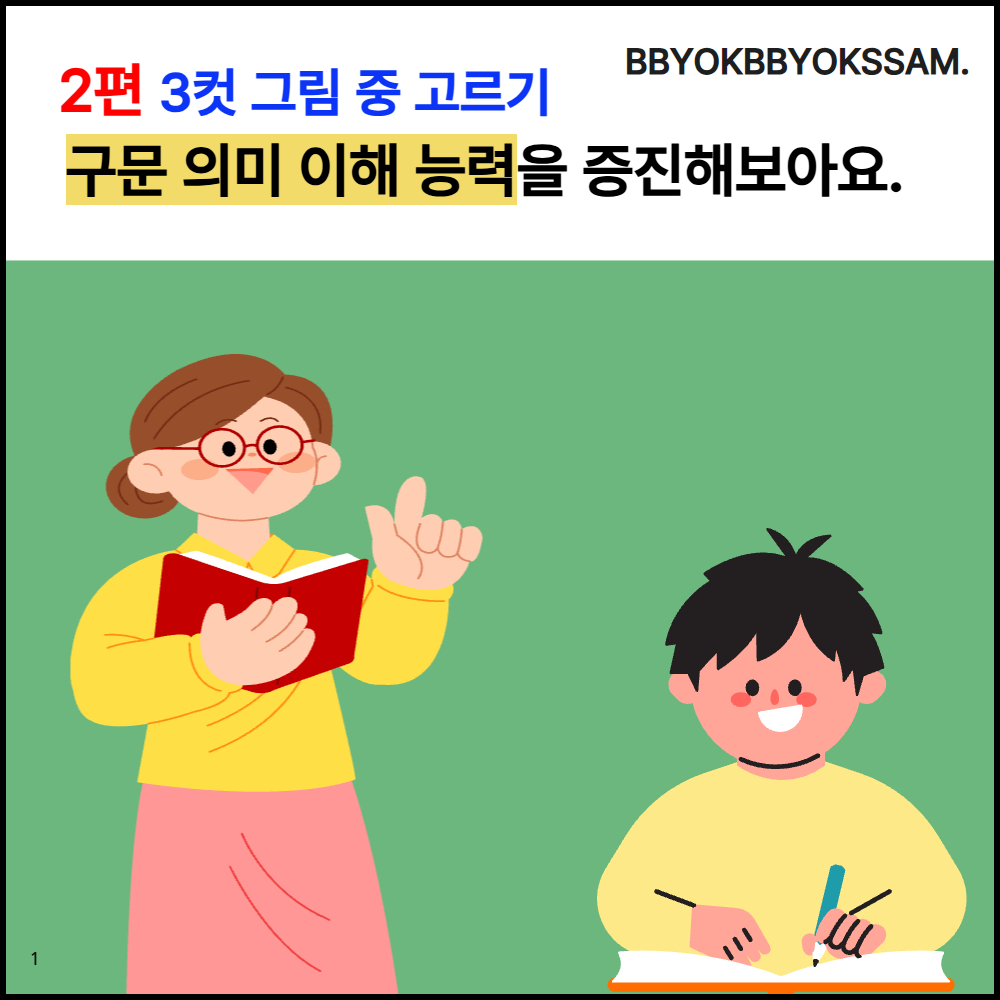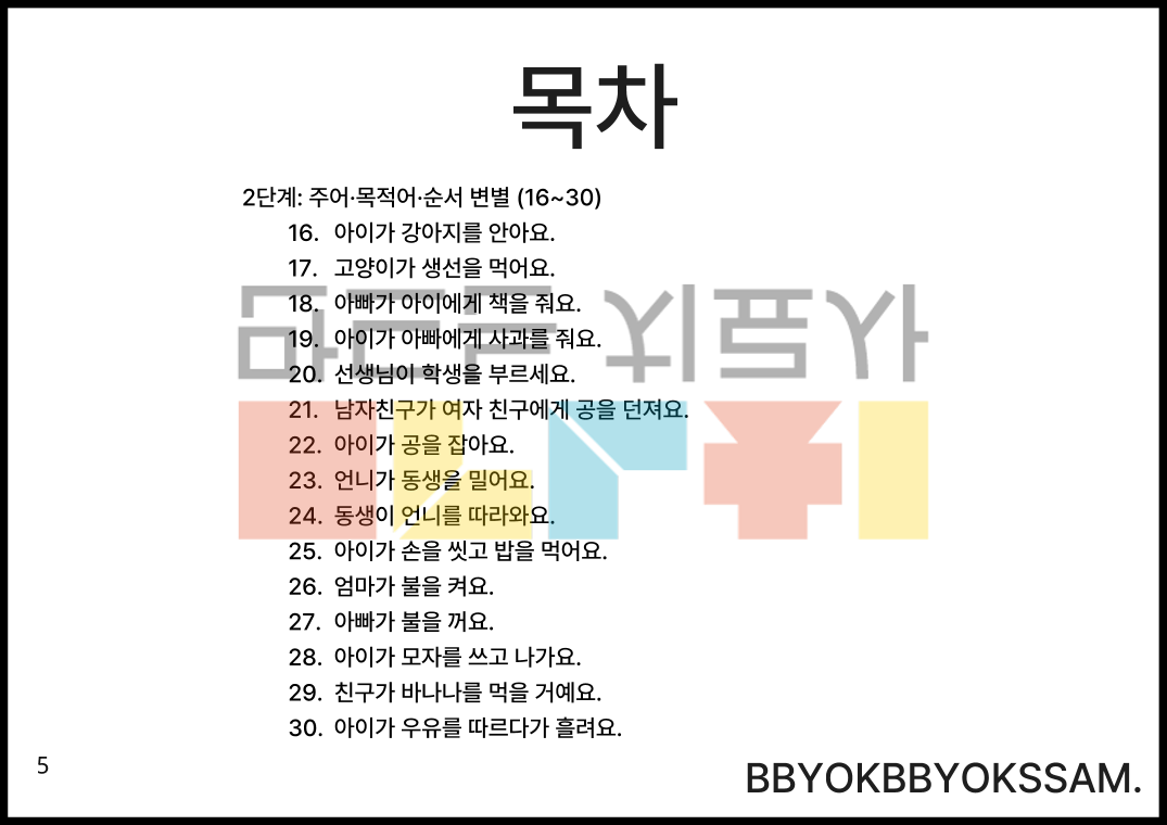 이번 교재는 상담사가 들려준 구문/문장을 듣고 3컷 그림 중 해당하는 그림 1가지를 선택하는 것으로 제작하였습니다. 단순 행동 구분 15문항, 주어 목적어 순서 변별 15문항, 위치 방향 시간 개념 10문항, 겹문장 부정문 비교 10문항으로 총 50가지 상황으로 제작하였습니다.