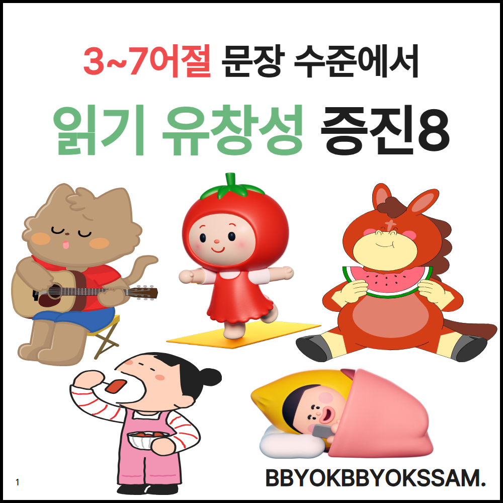 그림을 보고 3어절~7어절 문장 수준에서 유창성 증진 목표로 제작하였습니다. 5가지 상황으로 1 상황 당 10장면으로 구성되어 있습니다.
