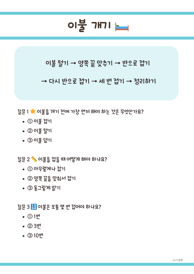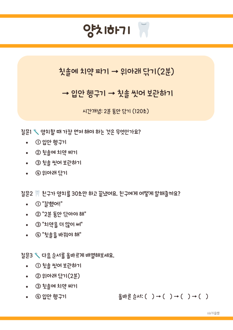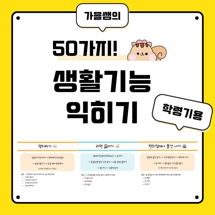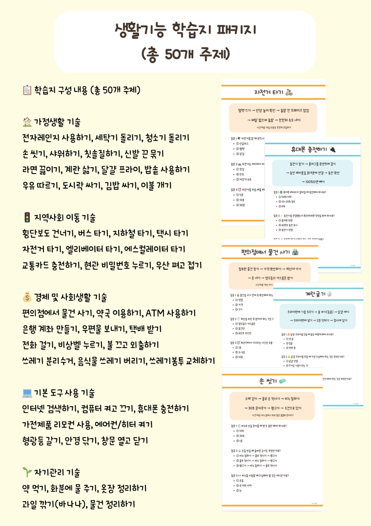 *가을쌤의 50가지 생활기능 순서와 질문 학습지입니다 *총 50페이지입니다. 1️⃣ 실생활 중심의 50가지 주제 횡단보도 건너기부터 ATM 사용하기까지, 실제 생활에서 꼭 필요한 기능들을 엄선했습니다. 2️⃣ 명확한 순서도 제시 각 활동마다 단계별 순서도를 제공하여 아이들이 순차적 사고를 학습할 수 있습니다. 3️⃣ 3단계 확인 질문 각 주제마다 3개의 질문으로 이해도를 즉시 확인하고, 반복 학습을 유도합니다. 4️⃣ 시간 개념 통합(주황페이지 30쪽은 시간개념 수록) 실제 소요 시간, 대기 시간 등을 제시하여 시간 인지 능력도 자연스럽게 향상됩니다. *기대 효과 ✔️ 독립적 생활 능력 향상 ✔️ 순차적 사고력 발달 ✔️ 안전 의식 강화 ✔️ 시간 개념 형성 ✔️ 자존감 및 성취감 증진 ✔️ 전환기 교육 준비 📋 학습지 구성 내용 (총 50개 주제) 🏠 가정생활 기술 전자레인지 사용하기, 세탁기 돌리기, 청소기 돌리기 손 씻기, 샤워하기, 칫솔질하기, 신발 끈 묶기 라면 끓이기, 계란 삶기, 달걀 프라이, 밥솥 사용하기 우유 따르기, 도시락 싸기, 김밥 싸기, 이불 개기 🚦 지역사회 이동 기술 횡단보도 건너기, 버스 타기, 지하철 타기, 택시 타기 자전거 타기, 엘리베이터 타기, 에스컬레이터 타기 교통카드 충전하기, 현관 비밀번호 누르기, 우산 펴고 접기 💰 경제 및 사회생활 기술 편의점에서 물건 사기, 약국 이용하기, ATM 사용하기 은행 계좌 만들기, 우편물 보내기, 택배 받기 전화 걸기, 비상벨 누르기, 불 끄고 외출하기 쓰레기 분리수거, 음식물 쓰레기 버리기, 쓰레기봉투 교체하기 💻 기본 도구 사용 기술 인터넷 검색하기, 컴퓨터 켜고 끄기, 휴대폰 충전하기 가전제품 리모컨 사용, 에어컨/히터 켜기 형광등 갈기, 안경 닦기, 창문 열고 닫기 🌱 자기관리 기술 약 먹기, 화분에 물 주기, 옷장 정리하기 과일 깎기(바나나), 물건 정리하기