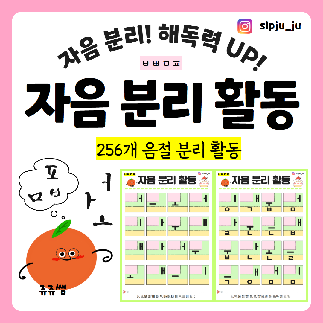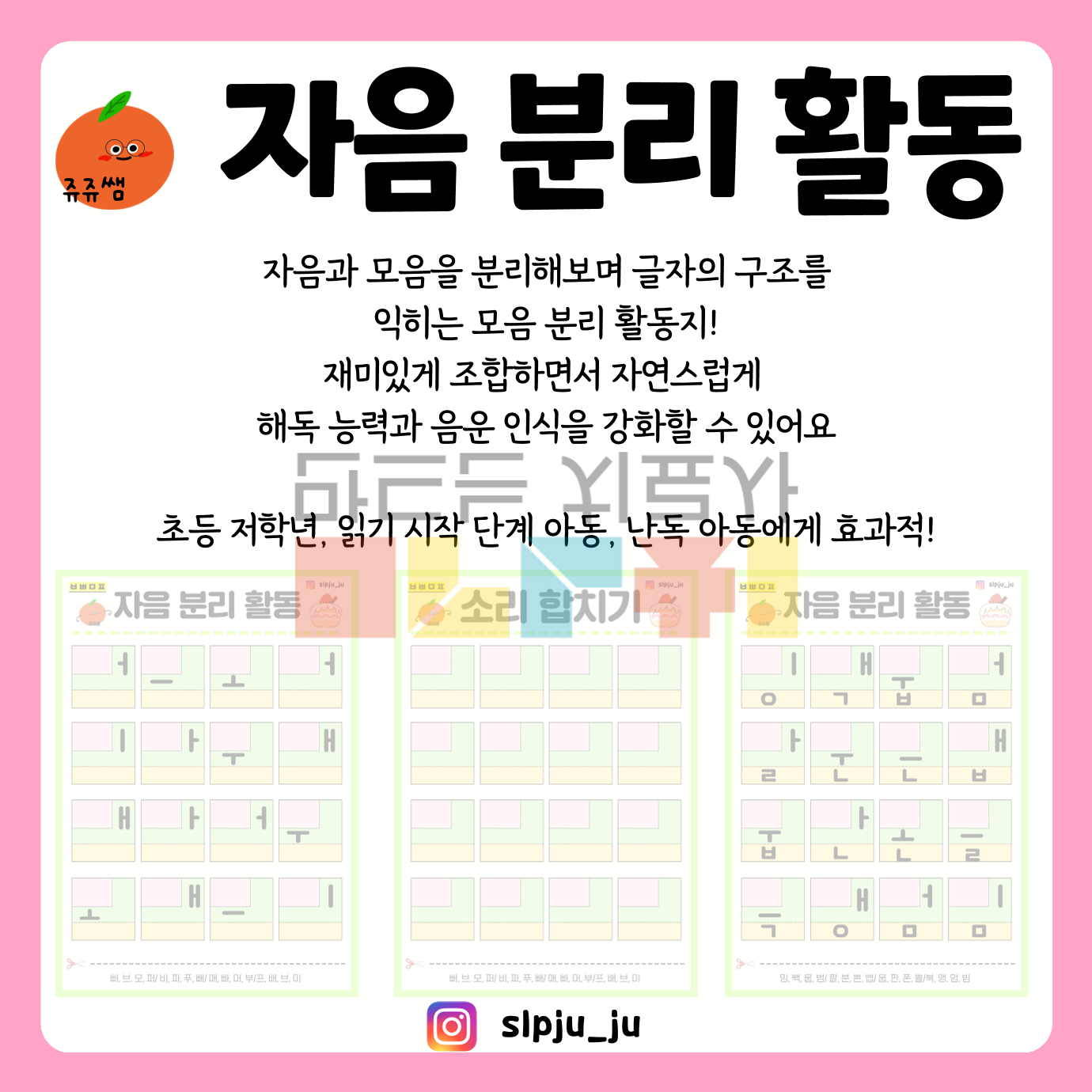 안녕하세요 쥬쥬쌤입니다. 자음과 모음을 분리해보며 글자의 구조를 익히는 자음 분리 활동지! 재미있게 조합하면서 자연스럽게 해독 능력과 음운 인식을 강화할 수 있어요 초등 저학년, 읽기 시작 단계 아동, 난독 아동에게 효과적!