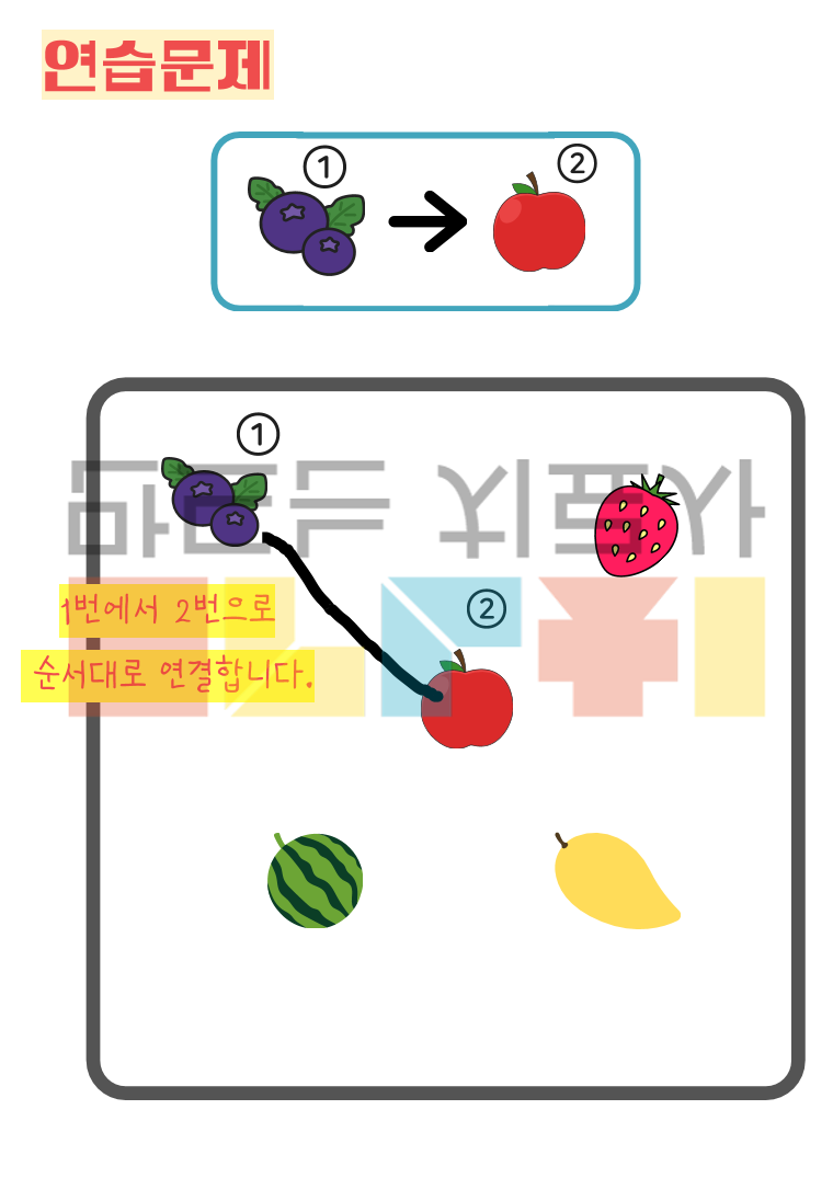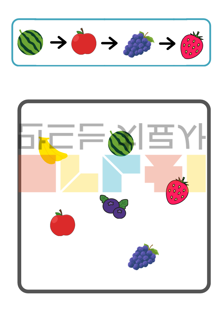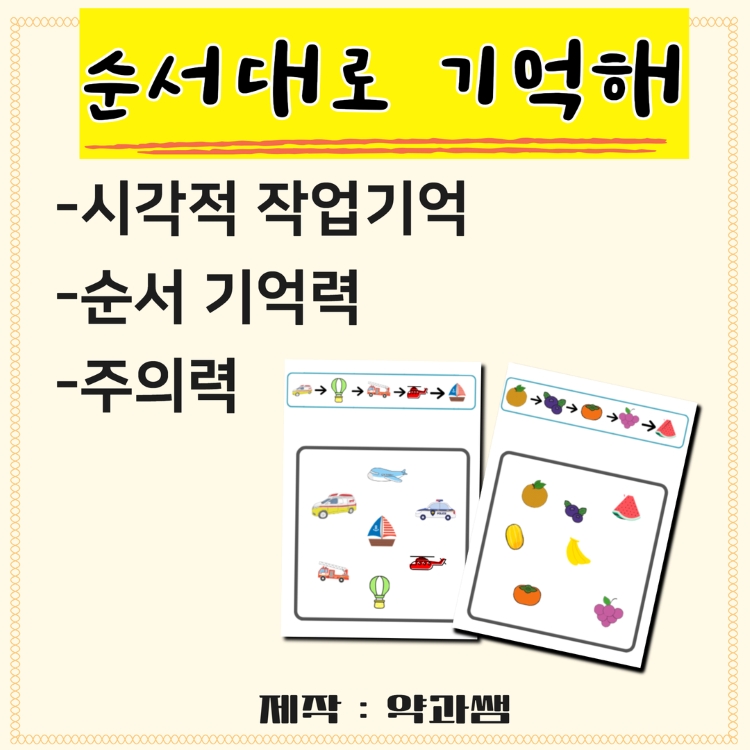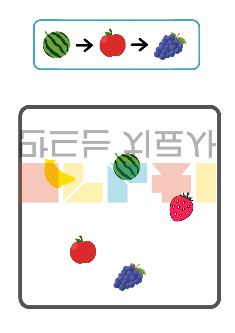 * 이 활동의 목적은 시각적 작업기억(Visual Working Memory) 과 순서 기억력(Sequential Memory), 주의력 을 향상시키는 것이다. * 범주화(과일, 탈것, 동물, 색깔, 모양)하여 단계적으로 이해하며 활동할 수 있도록 구성하였습니다. * 1단계 : 2개 연결/ 2단계 : 3개 연결/ 3단계 : 4개 연결 4단계 : 5개 연결