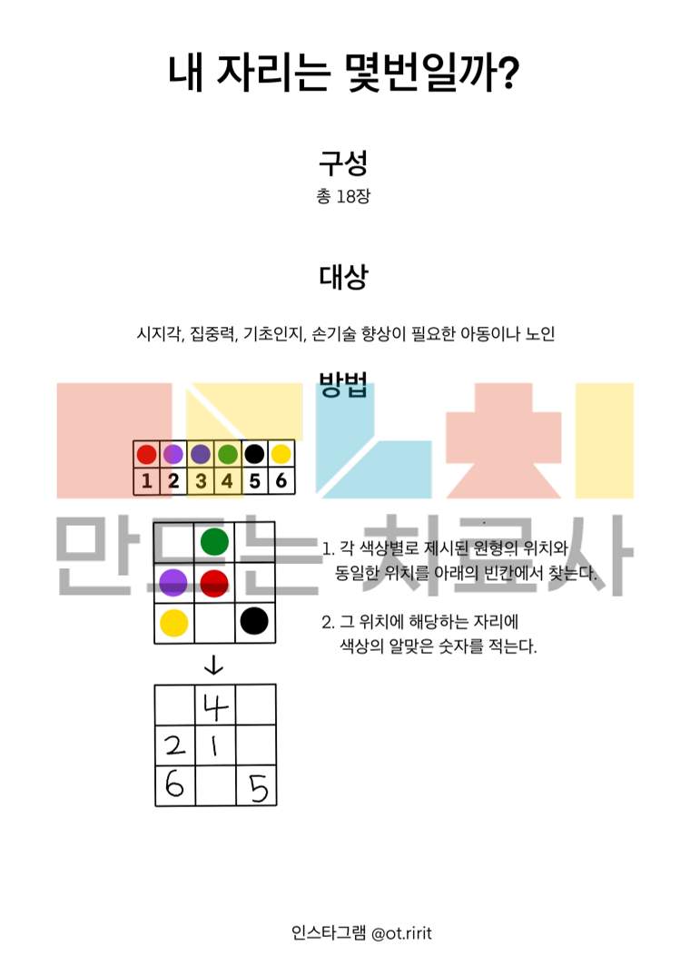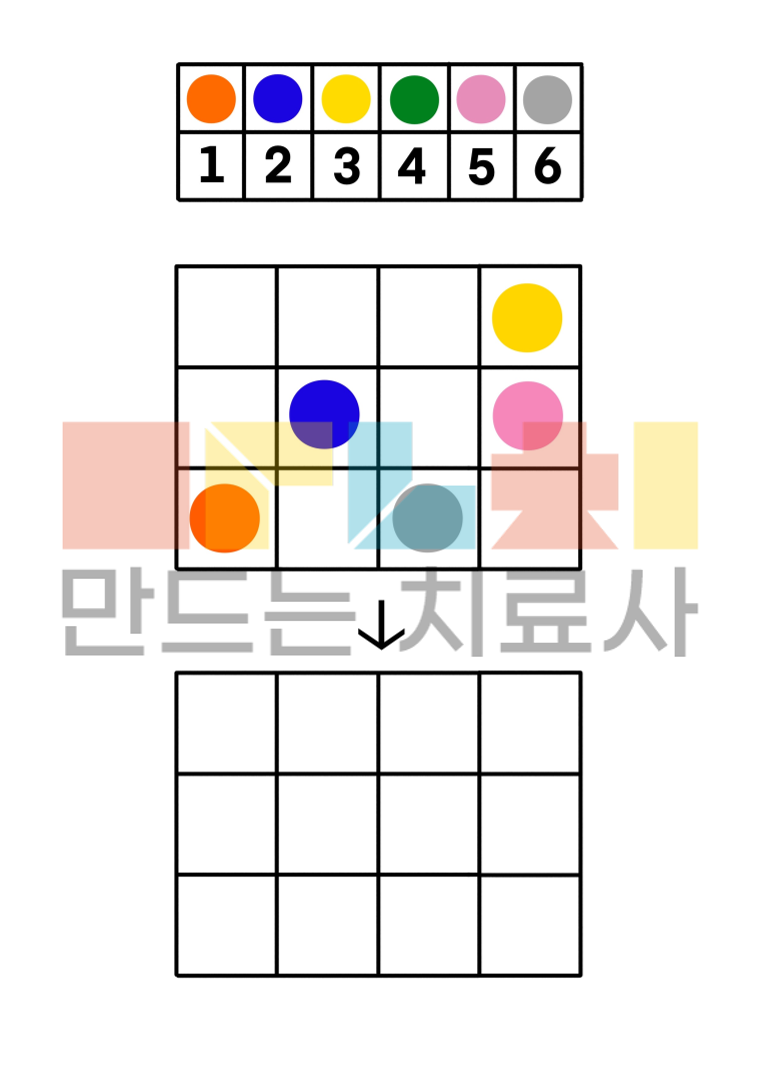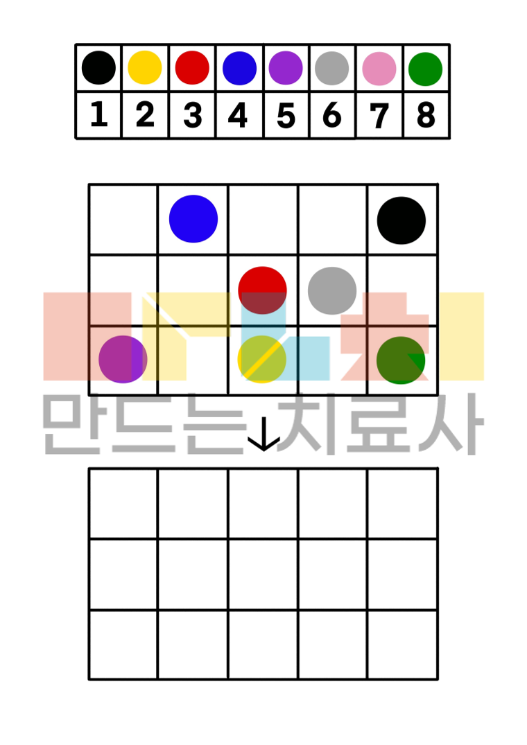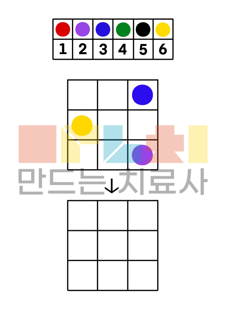 각 문제별로 색이 칠해진 원형의 위치와 동일한 위치를 아래의 빈칸에서 찾아 그 색상이 가지고 있는 숫자를 해당하는 자리에 찾아 적는다.