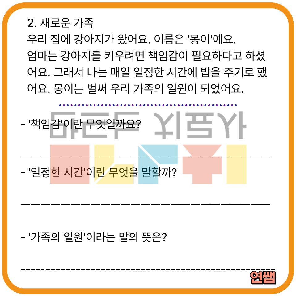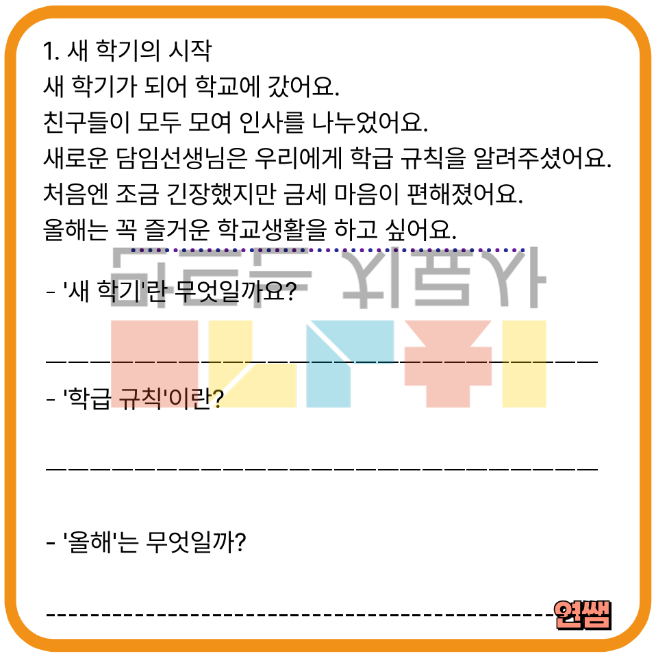 초등 3학년 수준의 한자어 포함된 짧은 글 입니다. 어휘를 가르칠 때 매우 유용한 자료가 될 것입니다.