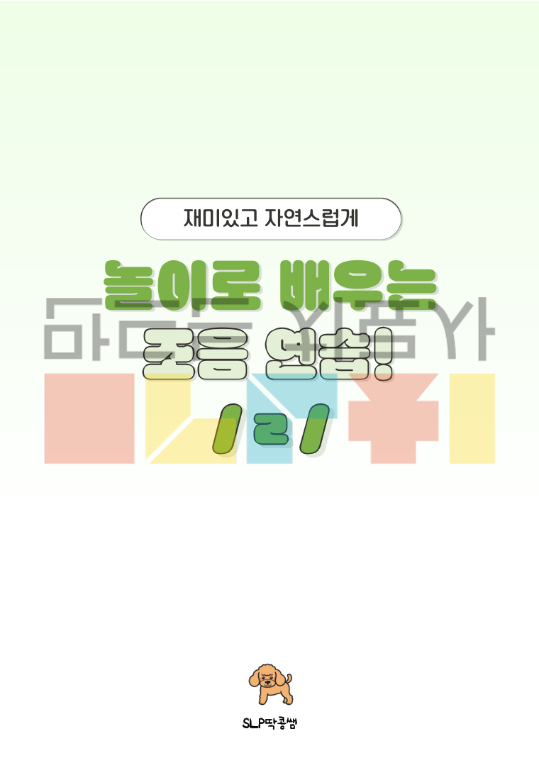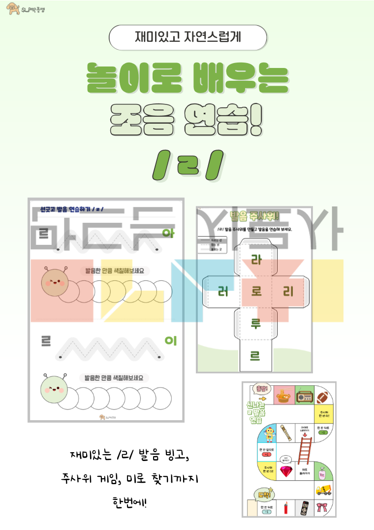 놀이로 배우는 조음 연습 /ㄹ/ *13p / pdf - 재미있는 놀이를 통해 /ㄹ/ 발음을 자연스럽게 연습해요! 모음-ㄹ음소 연결, 빙고게임, 주사위 만들기, 미로찾기, 노래부르기 등 아이들이 좋아하는 활동을 통해 반복적인 /ㄹ/ 조음 연습이 가능하도록 구성된 말소리 훈련 자료입니다. 단어 수준부터 문장 수준까지, 놀이 속에서 목표 음소를 즐겁게 익힐 수 있어요. 💡 도움되는 점 - 놀이 기반 접근으로 아이의 흥미 유발 - 단순한 조음 반복에서 벗어나 게임과 만들기 활동을 활용하여 발음 연습의 높은 몰입도 - 단계적 연습 가능 (/ㄹ/ 소리가 들어간 단어를 다양하게 제시하여 모음/자음 결합까지 넓게 접근할 수 있도록 구성했어요.) *또한 주사위 만들기, 미로찾기 등 활동을 통해 손 근육 사용과 방향성 파악, 시공간 지각력까지 함께 자극할 수 있습니다. 치료실, 가정, 기관 어디서나 활용 가능하며 출력 후 바로 사용 가능한 워크북 형식으로 구성되어, 치료사뿐 아니라 보호자도 쉽게 활용할 수 있어요!