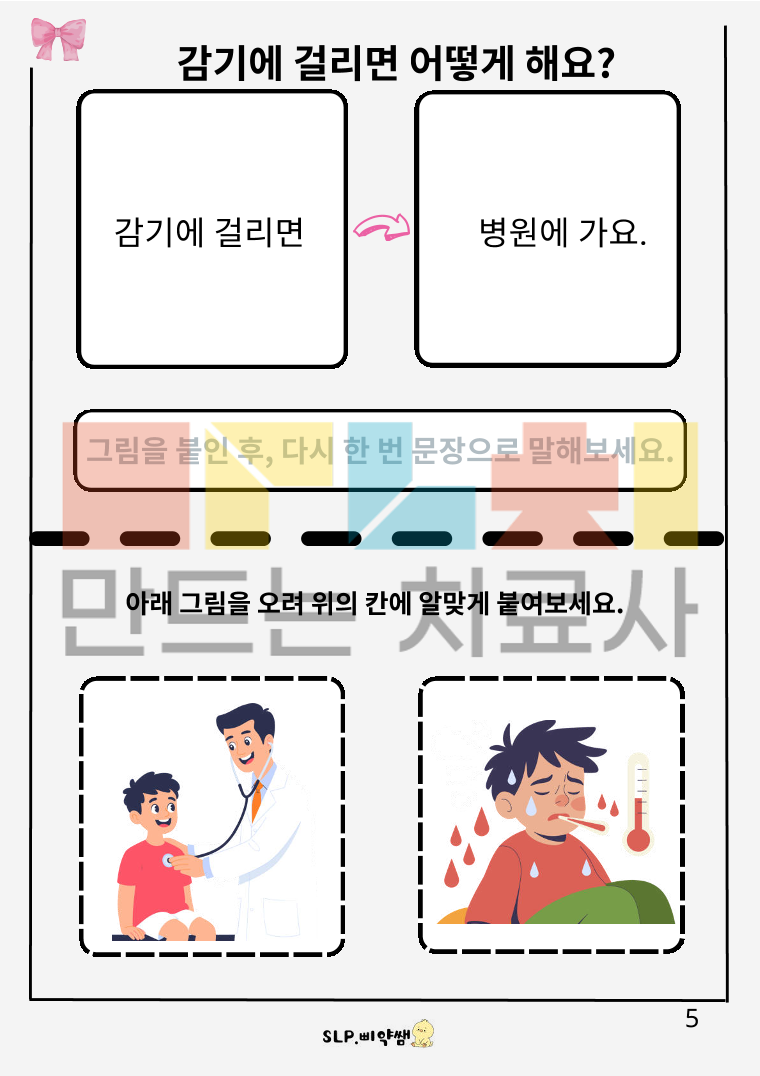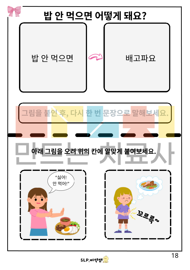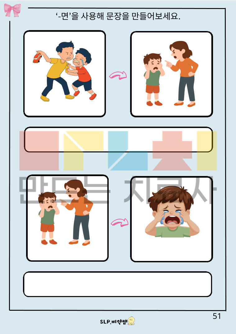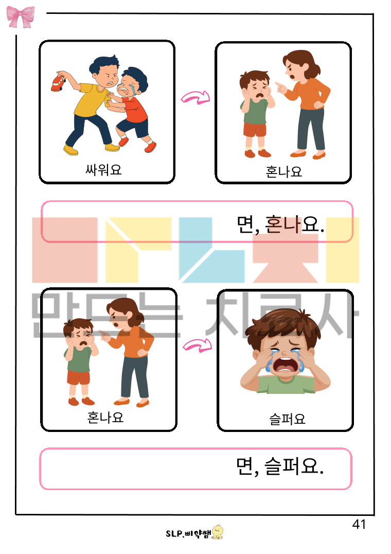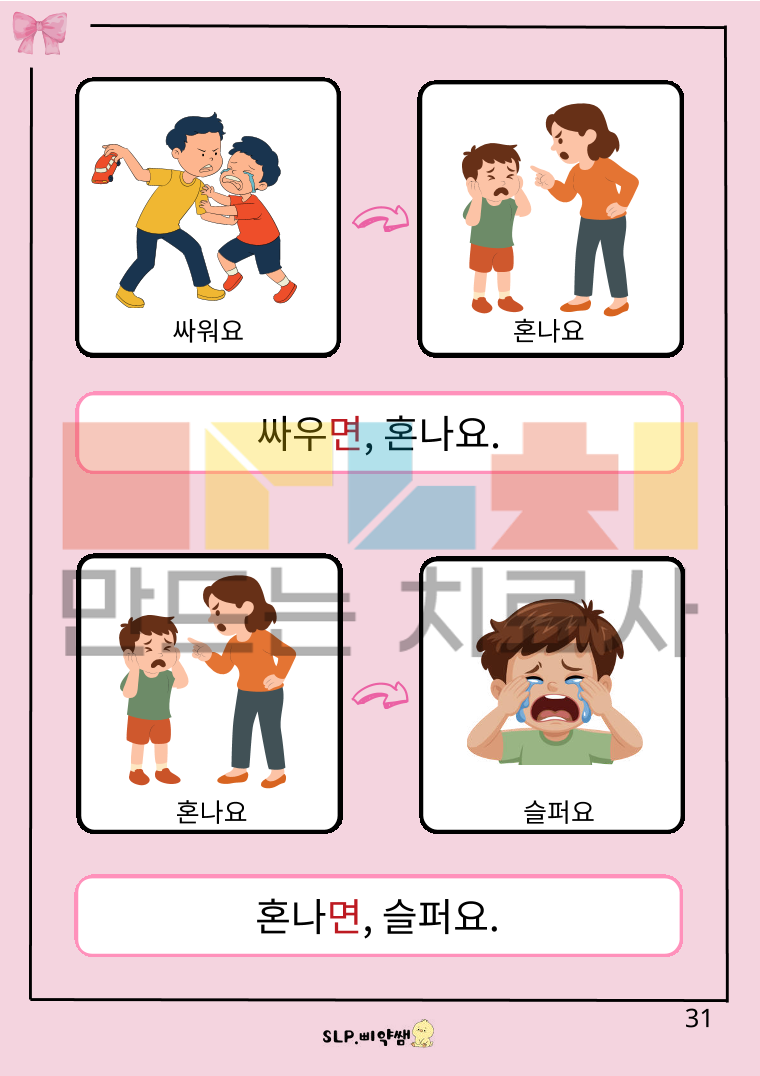연결어미 중에서 '조건' 연결어미인 "-(하)면"을 익힐 수 있는 자료입니다. 1.그림 오려 붙이기 하며 문장 만들기 : 지루하지 않도록 그림 오려서 붙인 후 "~하면 ~해요."문장을 구성할 수 있도록 했어요. 그 중에서도 일상에서 자주 접할 수 있는 내용으로 - “~ 하면 어떻게 해(돼)?” 질문에 대답하기 (총 12개 상황) - “~안 하면 어떻게 해(돼)?”질문에 대답하기(총 6개 상황) 로 구성했습니다. 2.연결된 이야기에서 “~하면 ~해요”문장표현하기: 3컷 시퀀싱 그림에서 "A하면 B해요. B하면 C해요."형태로 문장 만들기를 총 9개 상황으로 구성했습니다. (예:'넘어져요, 피나요, 밴드 붙여요' -> "넘어지면 피나요, 피나면 밴드 붙여요.") 이를 다시 단계별로 -1단계: 처음에는 모든 내용과 연결어미 사용한 문장을 다 제공하여 개념익히기를 할 수 있도록 합니다. -2단계: 2개의 그림을 보고 연결어미 사용하여 문장 만들 수 있돌고 뒷 문장과 '-면'연결어미를 제공합니다. -3단계: 단서 제공 없이 2개씩 그림 보고 자발적으로 문장 만들기를 하도록 합니다. *기대효과 -조건 연결어미 '-(하)면'를 이해할 수 있다. -2어문 조합 문장을 구성하여 말할 수 있다. -의문사 "어떻게"에 적절하게 대답할 수 있다.