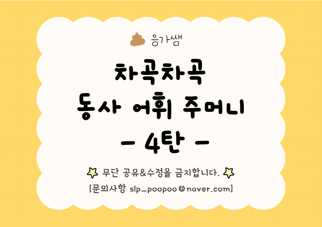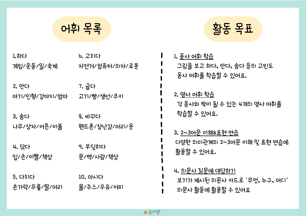 안녕하세요, 응가쌤이에요! ✅ 활동 목표 - 고빈도 동사 어휘와 각 동사별로 자연스럽게 연결될 수 있는 명사 어휘를 학습할 수 있어요. - 다양한 의미관계를 이해하고 2~3어문으로 표현하는 데 활용할 수 있어요. - 보기가 제시된 카드로 의문사 '무엇, 누구, 어디' 이해와 질문에 대답하기를 연습할 수 있어요. ✅ 구성 - 총 52페이지 1) 표지&설명서 2p 2) 동사 어휘 10개(문장 확장 활동지+의문사 활동지) 50p