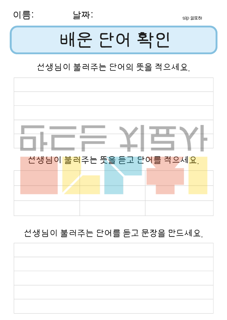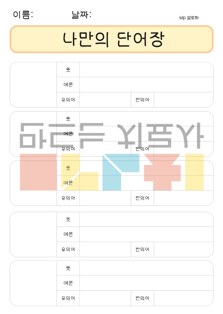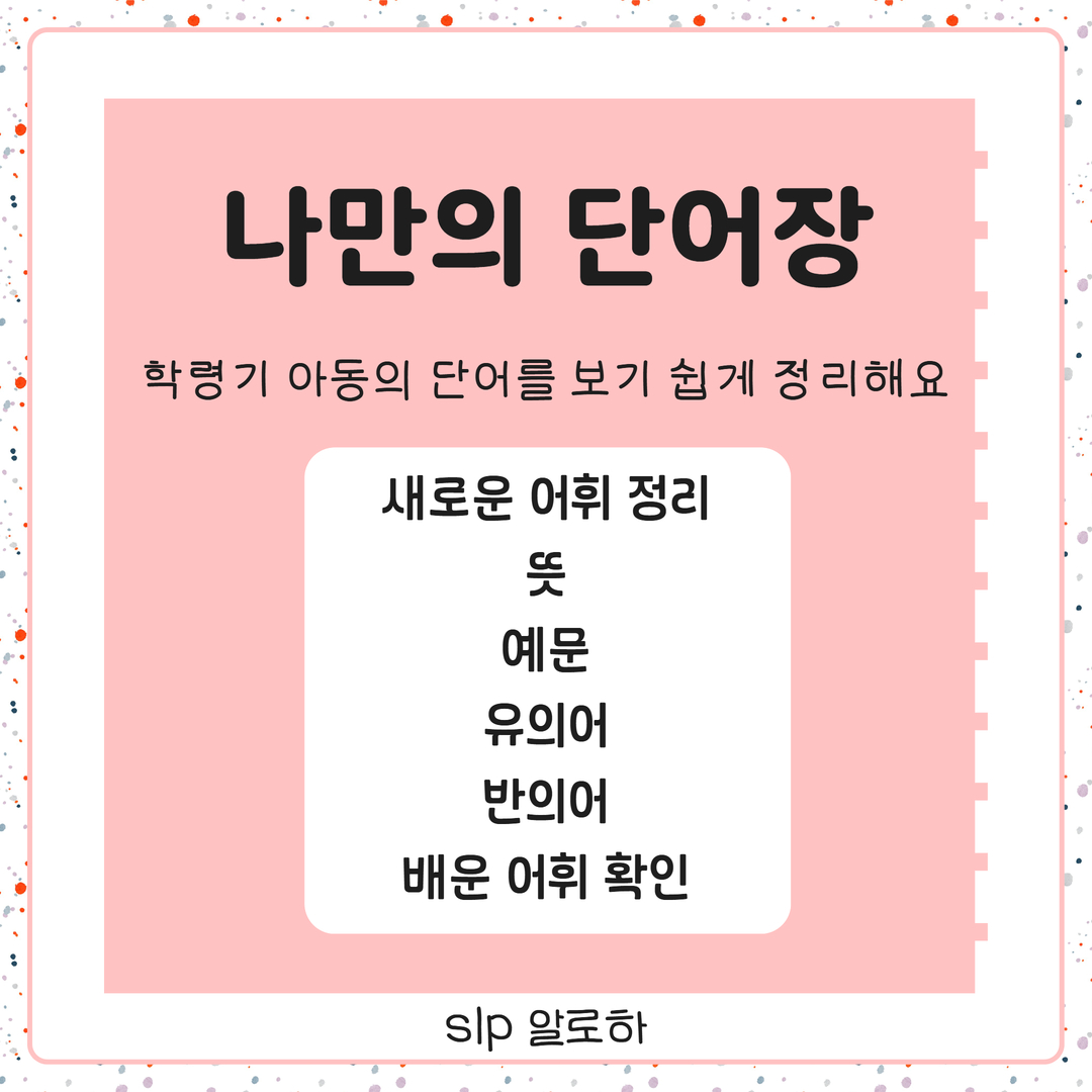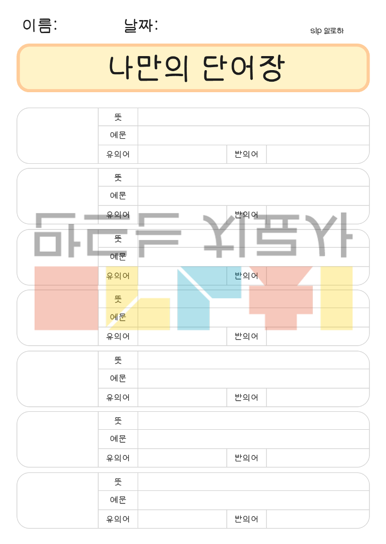 어휘가 부족한 학령기 아동을 위한 단어장 양식입니다. 아동이 알고 있는 어휘의 개수도 중요하지만 얼마나 잘 이해하고 장기기억으로 보존하는가 또한 매우 중요합니다. 아동의 글자 크기를 고려해 한 장에 정리할 수 있는 단어의 수를 5개/ 7개로 나누어 제작하였습니다. 아동이 배운 어휘를 모아 잊지 않도록 아동만의 단어장을 만들어주세요!