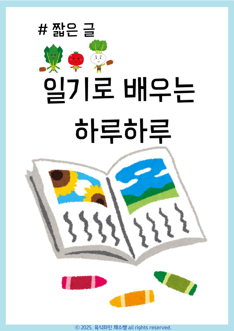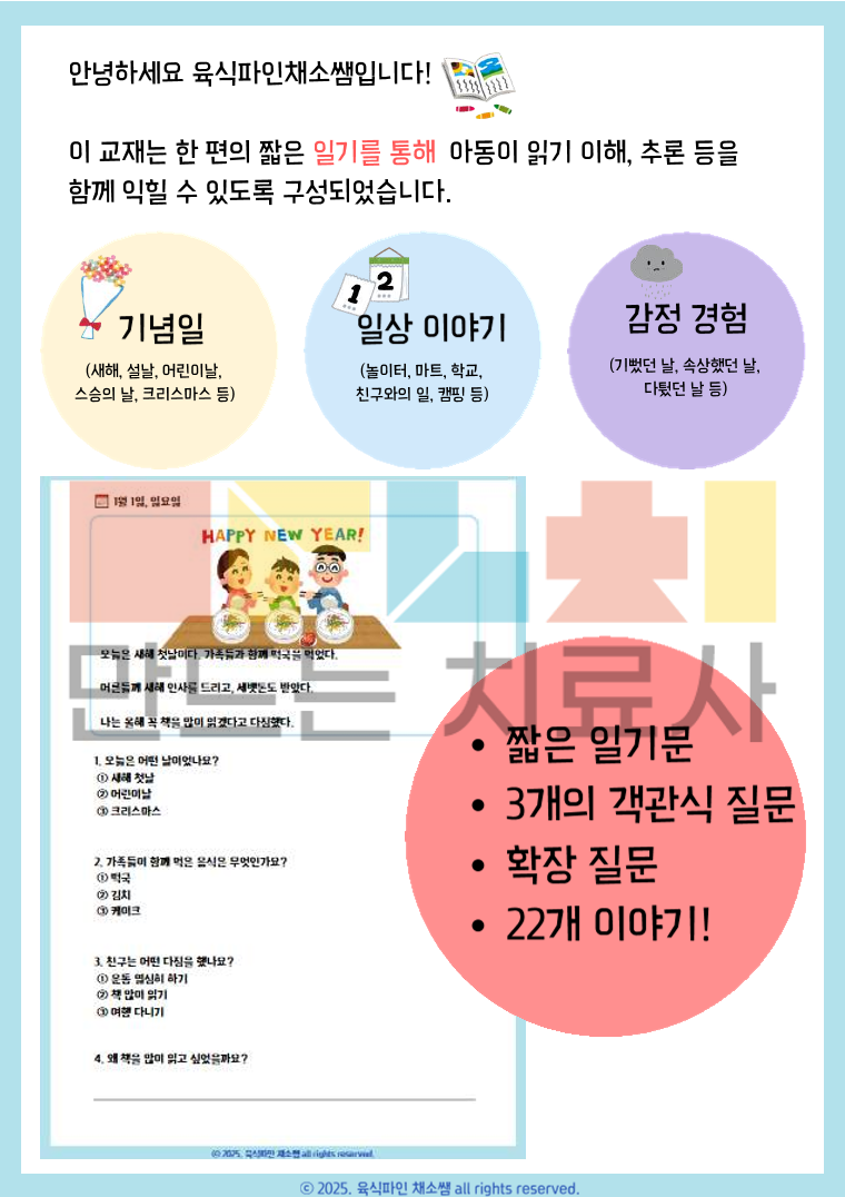 안녕하세요 육식파인채소썜입니다! 이 교재는 한 편의 짧은 일기를 통해 아동이 읽기 이해, 추론 등을 함께 익힐 수 있도록 구성되었습니다. ‘설날, 어린이날, 추석, 크리스마스’ 같은 기념일 이야기와 ‘놀이터, 바다, 학교, 친구와의 일’ 같은 일상 이야기들을 통해 읽기 이해를 키워보아요!