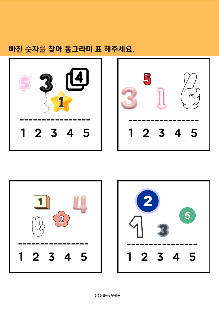 처음 수를 접하는친구들을 위한 다양한 활동입니다. 특히 빠진 수 찾기를 통해 수의 순서화를 정리해 볼 수 있습니다.