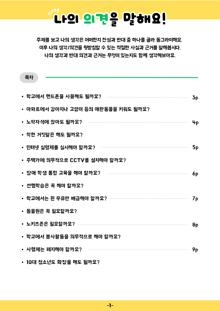 학령기 아이들을 대상으로 찬반 토론을 할 수 있는 다양한 주제들을 제공해요. 제시된 주제로 찬성/반대 의견을 주장하고, 의견을 뒷받침할 수 있는 근거를 나열하도록 도와주세요. 의견과 근거가 어떻게 연결이 되고, 나와 다른 의견을 가진 사람들은 어떠한 생각을 가지고 있는지 서로 토의하고 생각을 나눌 수 있습니다.