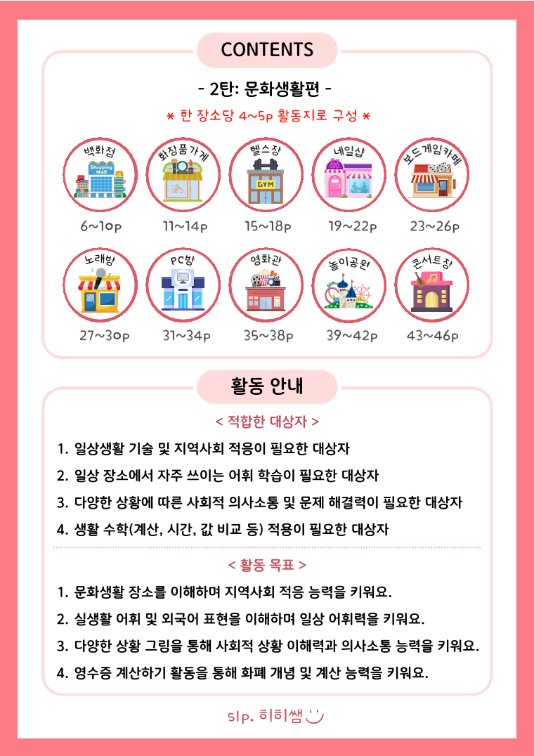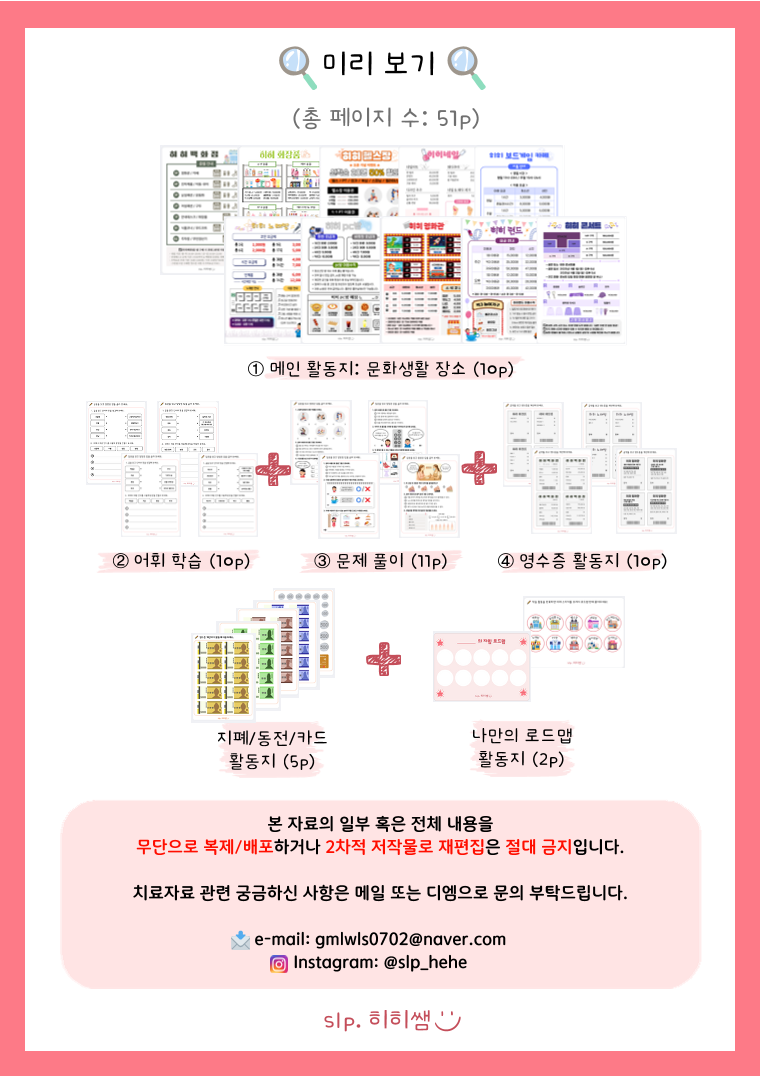 안녕하세요 선생님들! 히히쌤입니다 :) 자립로드맵 2탄 문화생활 편, 1탄과 전체 구성은 비슷하나 문제 풀이 내용을 더 다양하게 제작했습니다. 1탄과 연계하여 사용해 주시면 우리 친구들의 세상이 더 넓어지겠죠🪽 우리가 당연하게 누리는 것들을 우리 친구들도 자유롭게 누릴 수 있는 사회를 기대하며..💌 🔍 학습 point 🔍 - 문화생활 장소를 학습하며 지역사회 적응 능력을 키워요. - 실생활 어휘 및 외국어 표현 학습을 통해 일상 어휘력을 키워요. - 다양한 상황 그림을 통해 사회적 상황 이해력과 의사소통 능력을 키워요. - 영수증 계산하기 활동을 통해 화폐 개념 및 계산 능력을 키워요. 치료자료 관련 궁금하신 사항은 메일 또는 디엠으로 문의 부탁드립니다! 📩 e-mail: gmlwls0702@naver.com 📩 Instagram: @slp_hehe