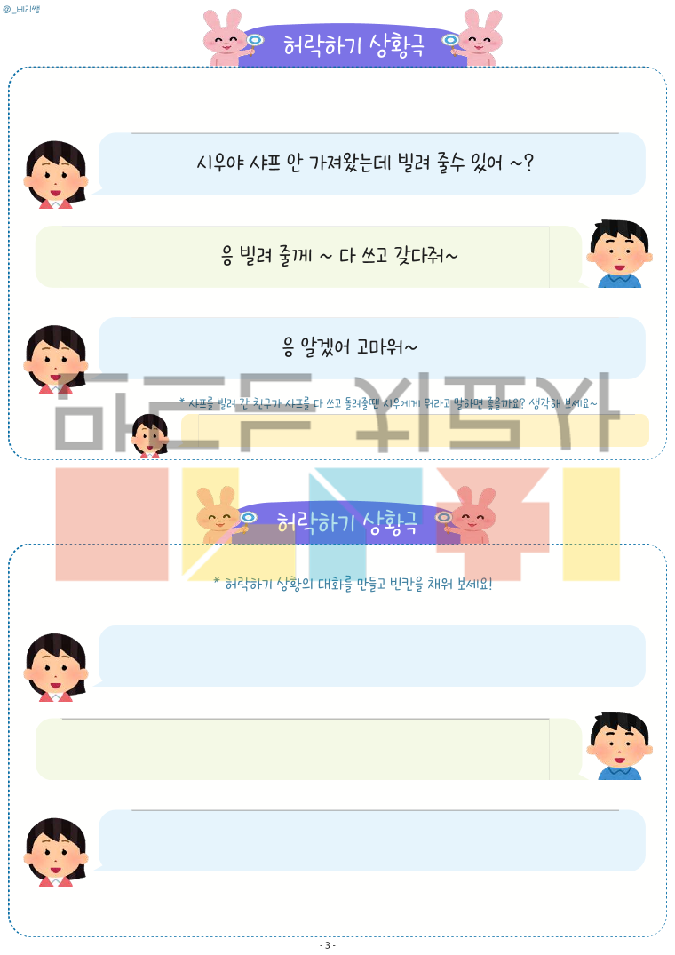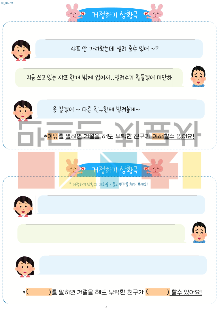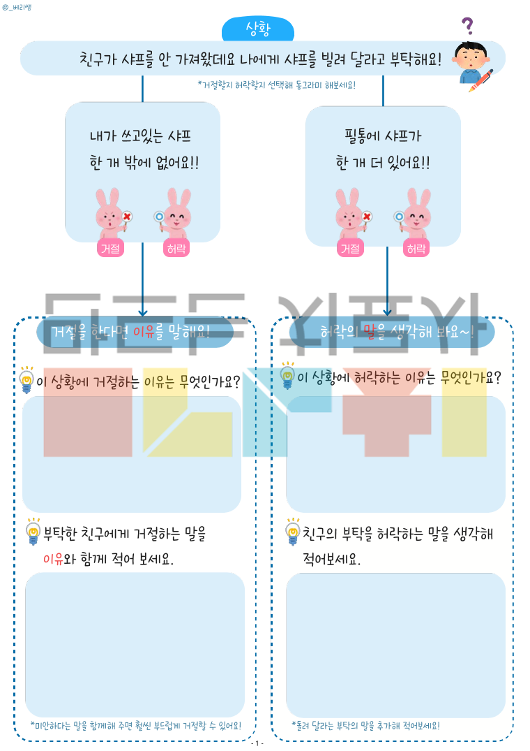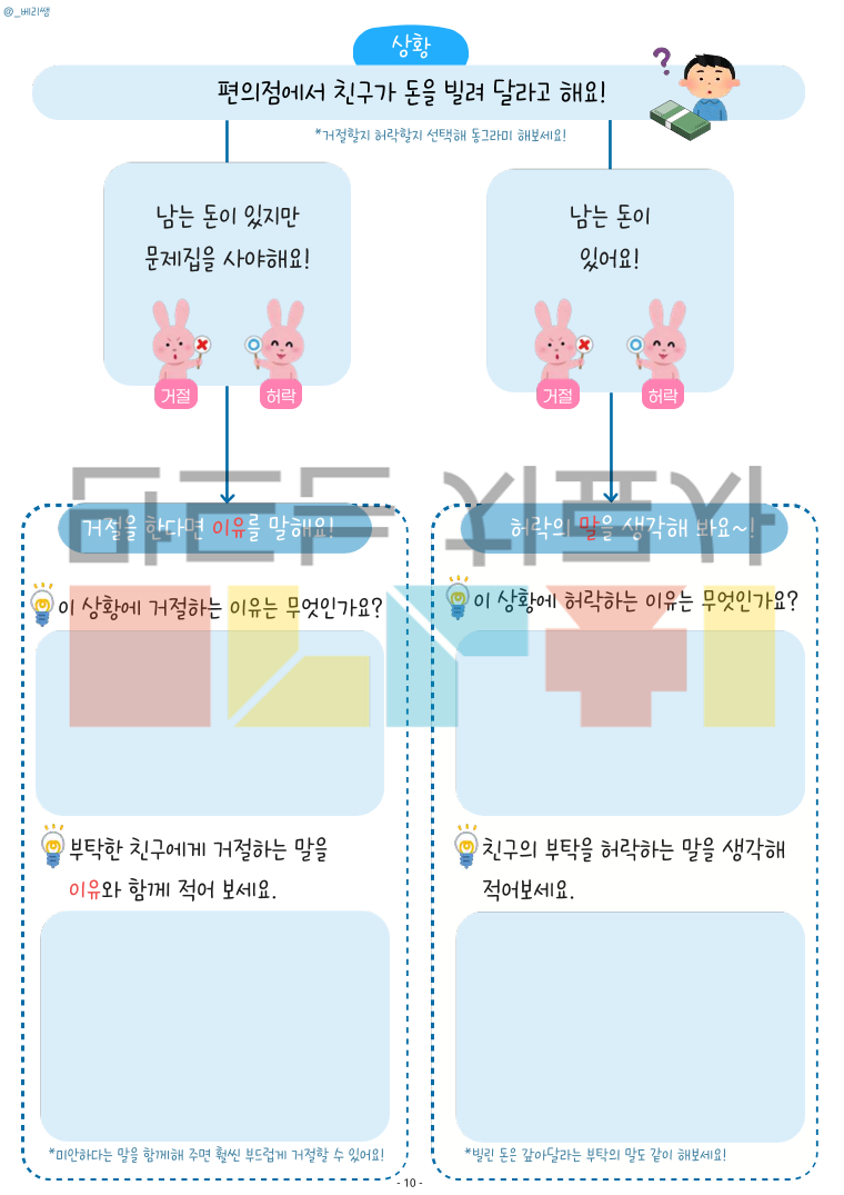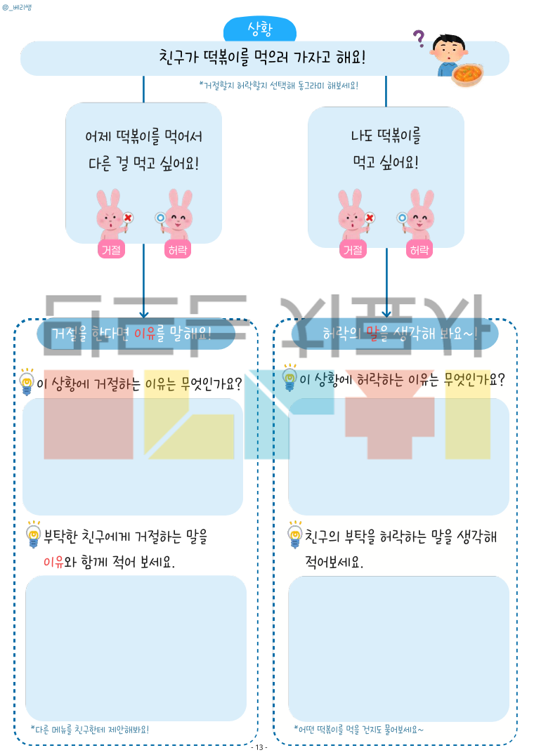🎀 자 료 소 개 🎀 이 워크북은 사회적 상황에서의 적절한 의사소통과 대화 기술을 기르기 위한 활동 자료로, 경계선 지능이나 경도 지적장애 사회성 발달이 느린 학령기 아동이 상황에 따라 ‘거절’할지 ‘허락’할지를 판단하고, 그 이유를 말로 표현하는 연습을 돕습니다. 이 아이들은 종종 상황을 구체적으로 판단하거나 타인의 입장을 고려하여 합리적인 선택을 내리는데 어려움을 겪습니다. 또한 거절을 해야 할 때 상대가 이해할 수 있도록 이유를 명확히 설명하는 언어적 기술이 부족해, 불필요한 오해나 관계의 어려움을 겪기도 합니다. 이 워크북은 이러한 어려움을 보완하기 위해, 도식화 된 시각적 상황 제시와 대화 연습을 통해 아동이 자신의 입장을 표현하고, 이유를 덧붙여 설명하며, 상황에 맞는 사회적 판단을 연습할 수 있도록 구성되었습니다. 🔖구성 - 18가지 상황 수록 - 1가지 상황당 거절, 허락 두 개의 상황극 제시 - 총 54PDF파일