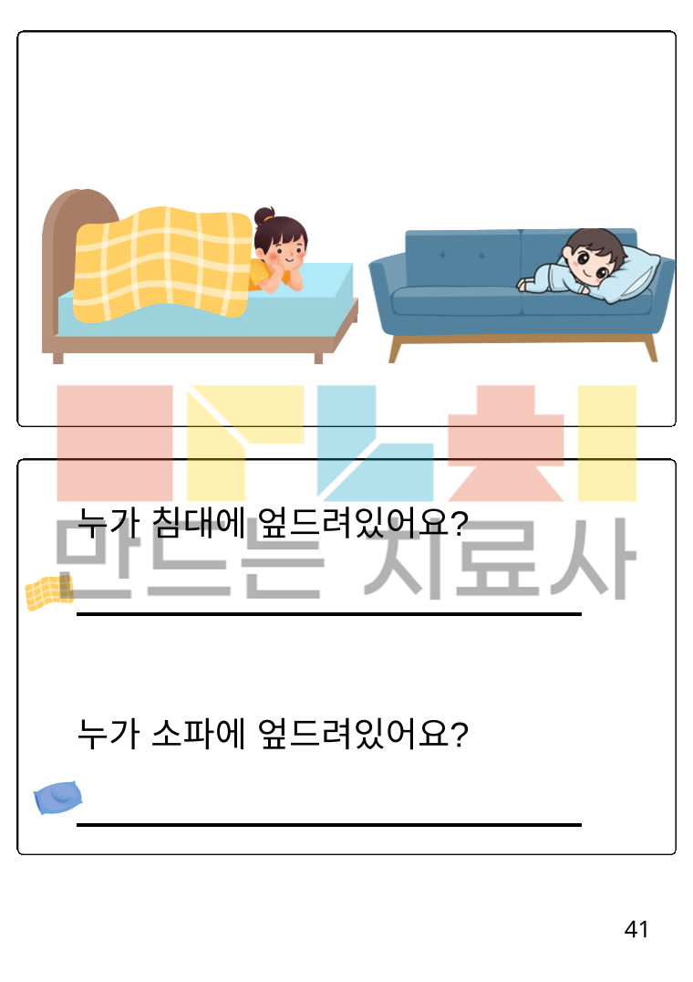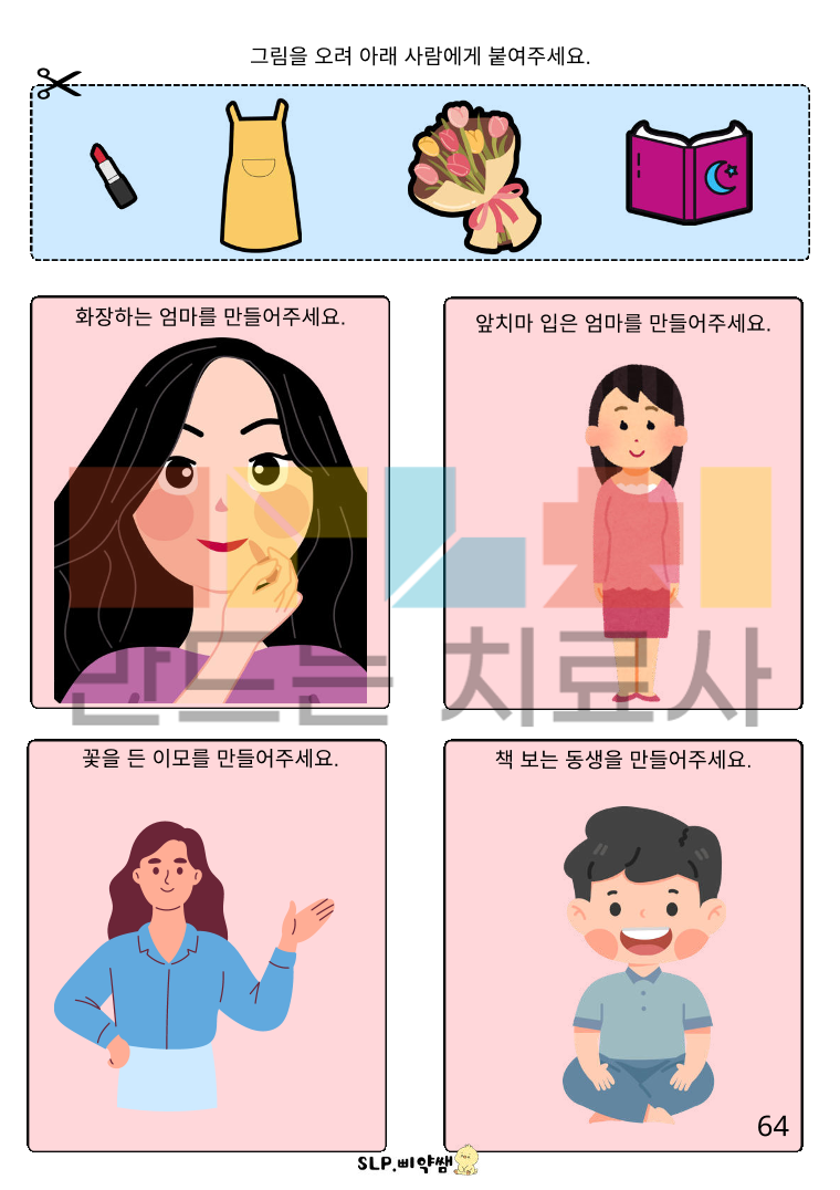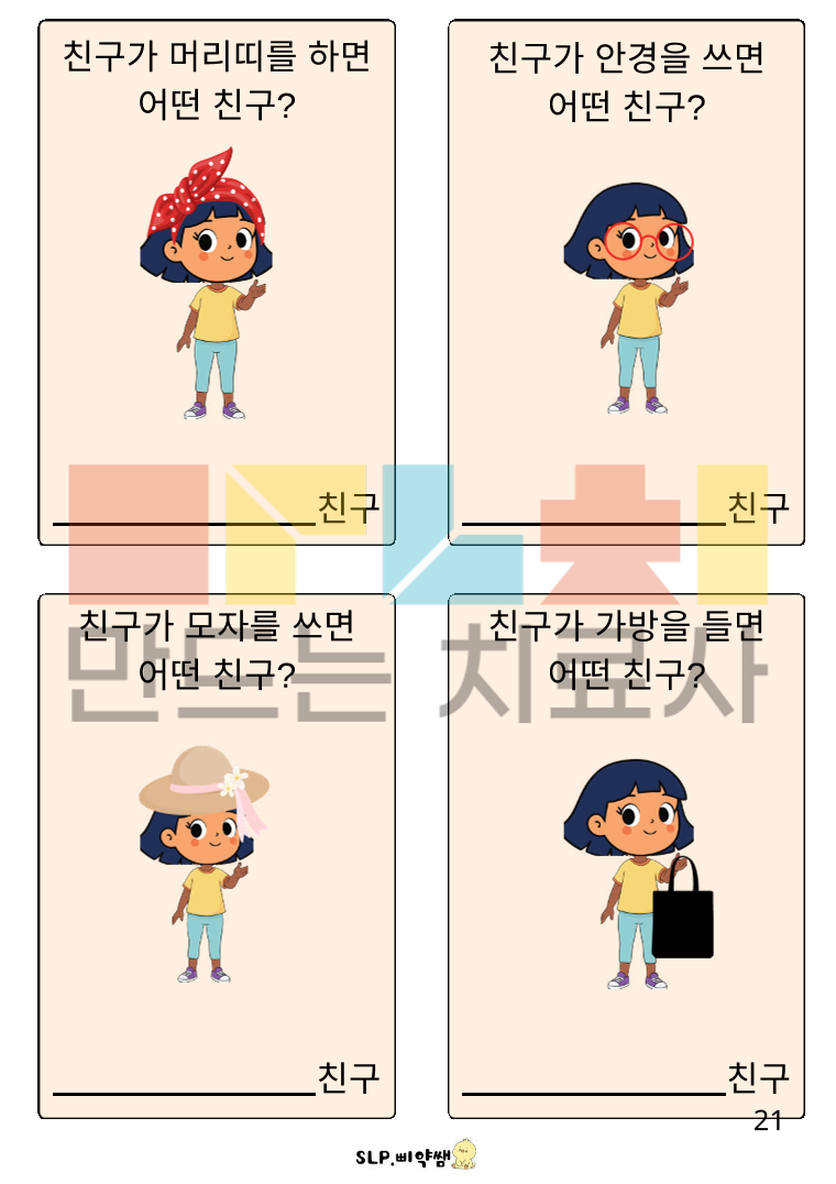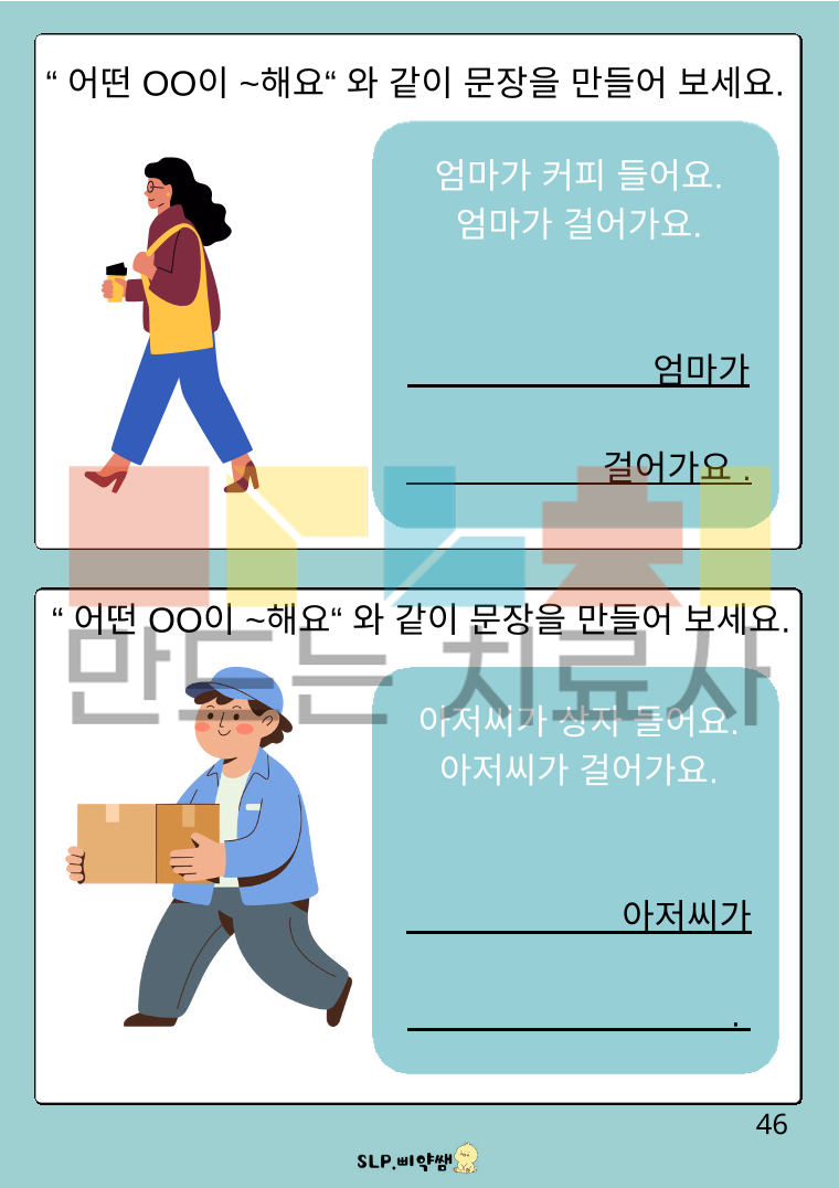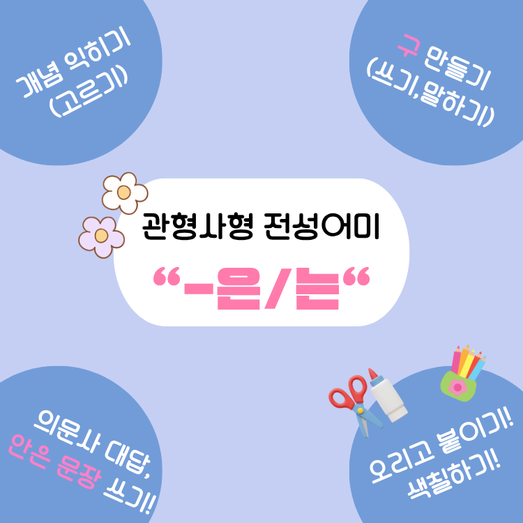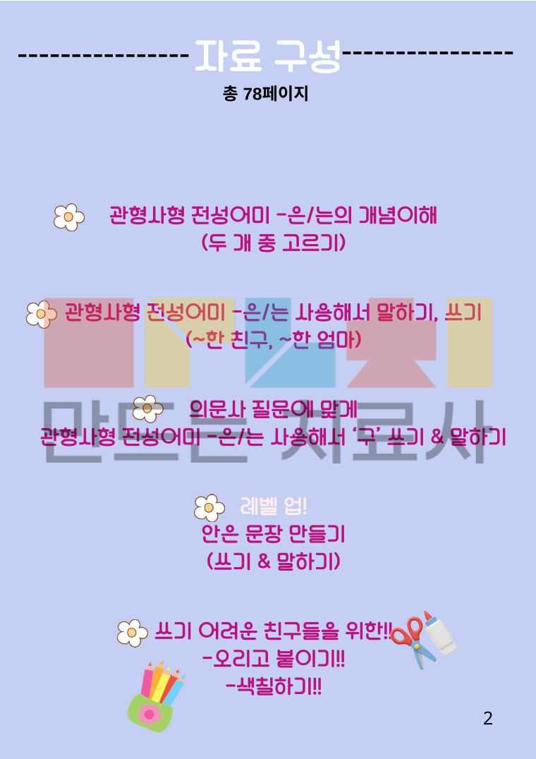 안녕하세요, 삐약쌤입니다. 관형사형 전성어미 '은,는' 자료를 가져왔습니다. 아이들에게 "누가 했어?"라고 물어보면 그냥 "친구, 동생, 엄마, 아빠"이렇게 단순하게 대답하는 경우가 많죠. 심지어 같은 그림에 온통 다 친구들인 경우에도 그냥 "친구"라고 표현합니다. 그럼 선생님들이 다시 "어떤 친구?"하고 되묻게 되지요... 그런 경우에 우리 아이들은 어떻게 말할 지 몰라 주고 받기가 끝나는 경우가 대부분입니다. 좀 더 자세하게 설명할 수 있도록" ~한 친구"와 같이 관형사형 전성어미를 사용한 구문으로 말할 수 있도록 여러가지 구성으로 준비하였습니다. 조금 더 능력이 된다면, "구"를 넘어 "복문(안은 문장)" 문장으로까지 확장할 수 있도록 하였습니다. 아직 글 쓰기, 읽기가 미숙한 친구들을 위해 색칠하면서 구문 만들기, 오리고 붙이면서 구문 만들기 자료를 함께 만들었으니 선생님들께서 알맞게 조절해서 사용하시면 좋을것 같습니다. 다양하게 준비하였으니, 전부 혹은 일부를 아동에게 맞춰서 유용하게 사용될 수 있기를 바랍니다. 목차나 내용은 아래 미리보기에 포함시켰습니다. 감사합니다.