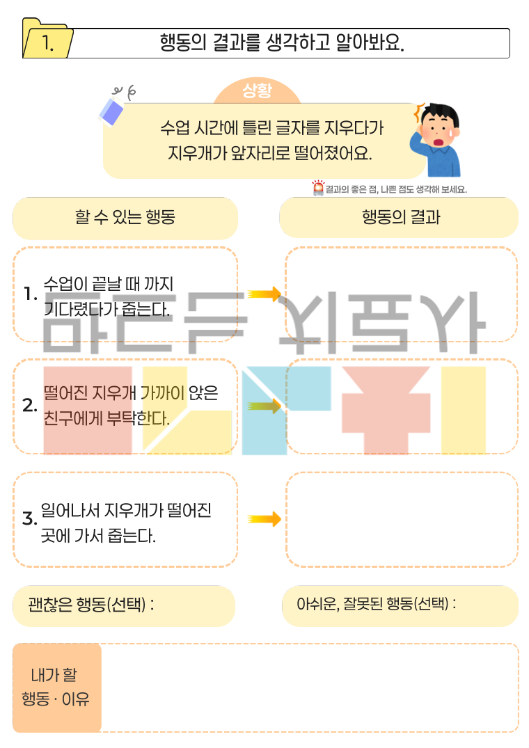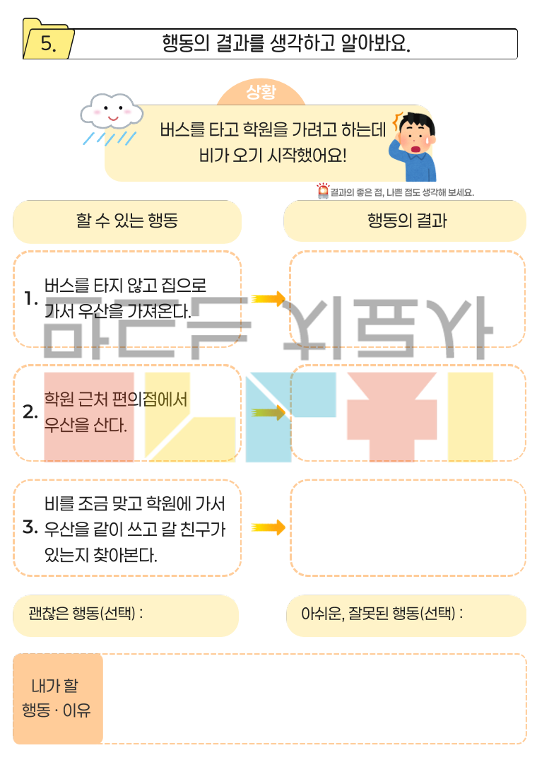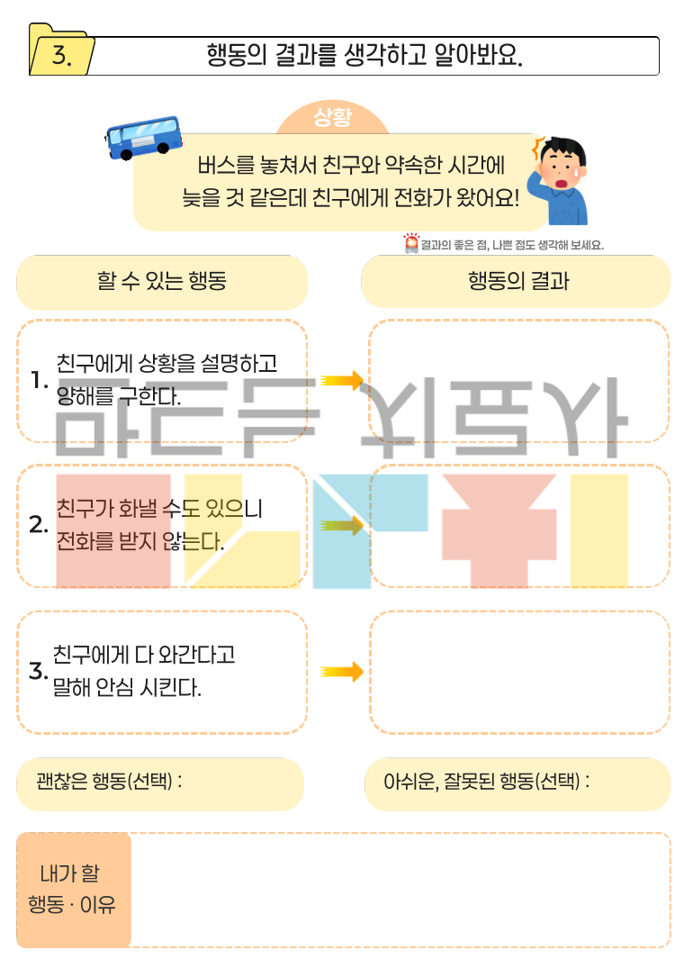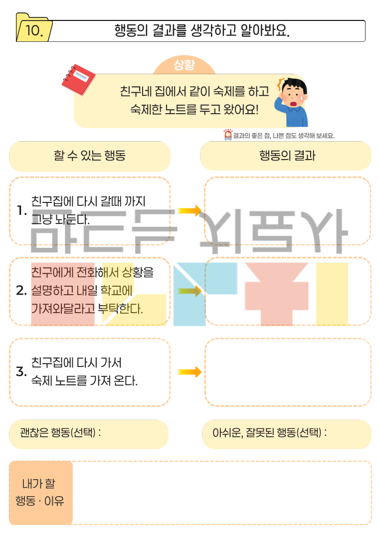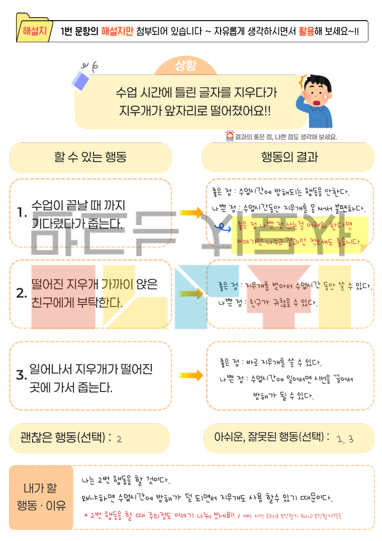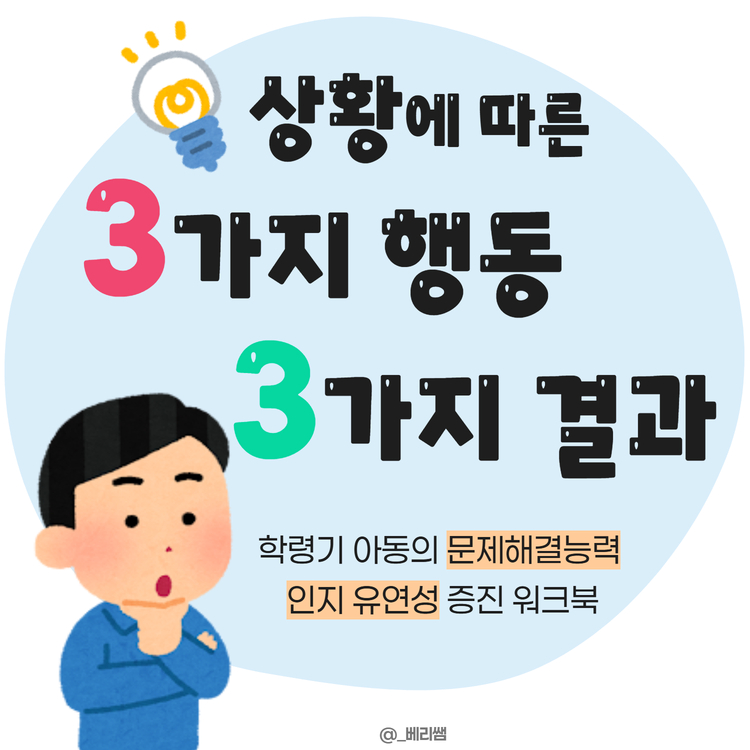 🎀자 료 소 개 🎀 이 워크북은 학령기 아동이 일상에서 마주하는 다양한 상황을 통해 할 수 있는 여러 행동을 비교하고, 그 행동이 가져올 결과를 스스로 예측하는 능력을 기르도록 돕습니다. 경계선 지능, 경도 지적장애, 고기능 자폐 아동처럼 상황에서 적절한 판단이나 유연한 선택이 어려운 친구들이 괜찮은 선택과 아쉽고 부적절한 선택을 구분하고, 왜 그 행동이 더 나은지 자연스럽게 이해할 수 있도록 구성되었습니다. 본 자료는 아동의 문제해결력, 인지 유연성, 상황 판단력, 결과 예측 능력을 단계적으로 확장하며 학교·가정·치료 환경에서 실제 행동으로 이어질 수 있는 사고 연습을 목표로 합니다. - 제시된 상황을 파악하고 할 수 있는 행동 3가지 예시 보기 - 각 행동의 결과를 예측해 보고 결과의 좋은 점 나쁜 점 떠올리기 - 떠올린 결과를 바탕으로 괜찮은 선택, 아쉬운 선택을 변별하기 - 내가 할 행동 선택하고 이유 생각하고 써보기 - 제시된 행동을 어떤 식으로 할 것인지도 질문하며 사고 확장하기 🔖자 료 구 성 40가지 상황 : 40P 해설지 : 1P(1번 문항만 첨부) 총 합 : 41P (PDF)