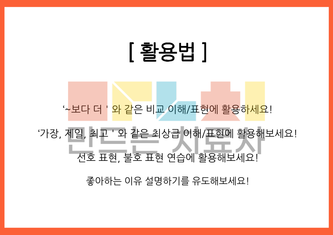 ‘~보다 더'와 같은 비교 이해/표현에 활용하세요! ‘가장, 제일, 최고'와 같은 최상급 이해/표현에 활용해보세요! 선호 표현, 불호 표현 연습에 활용해보세요! 강한 이유, 귀여운 이유 설명하기를 유도해보세요!