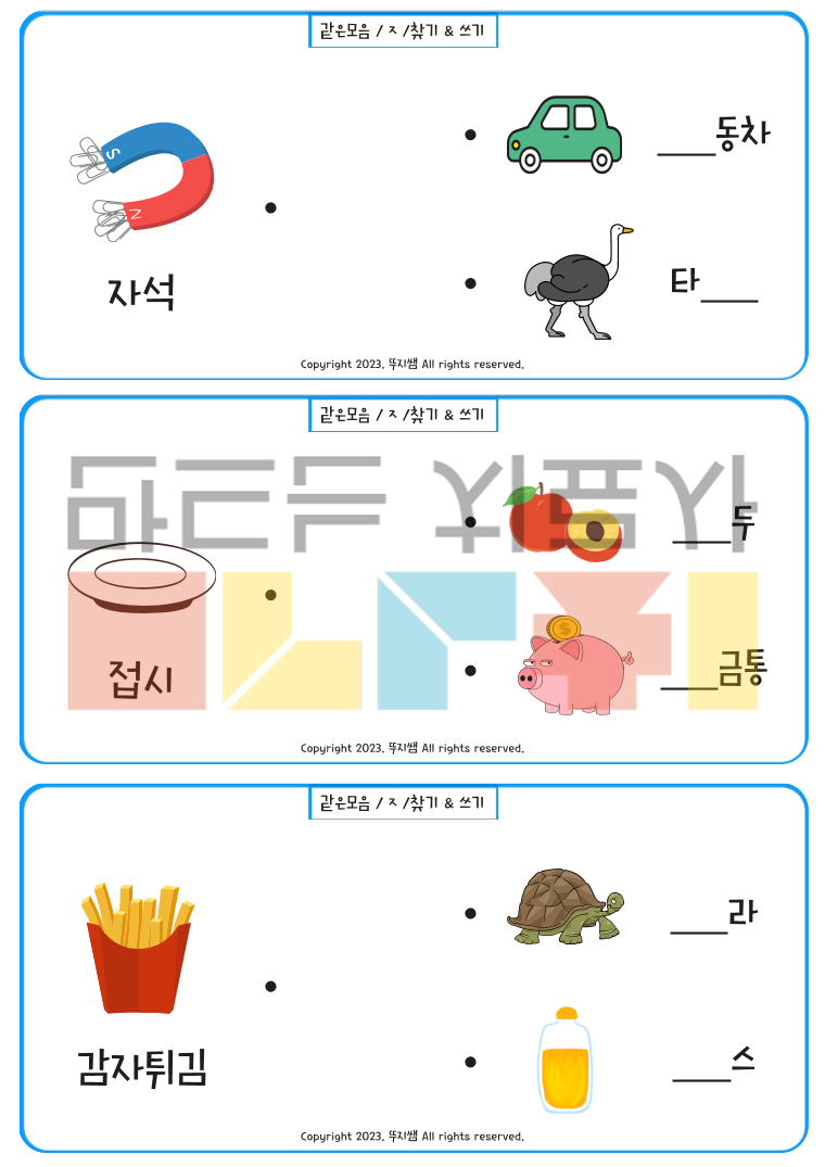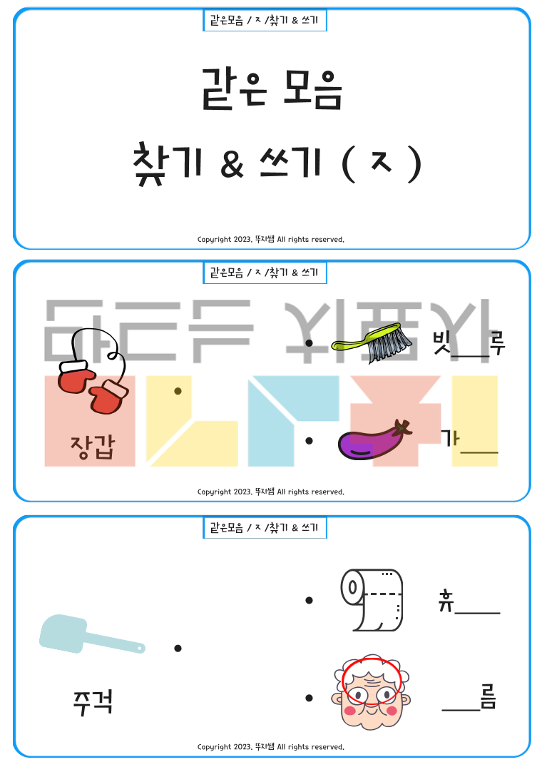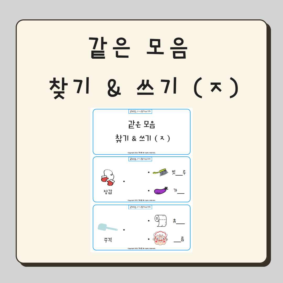 '같은 모음 찾기 & 쓰기 (ㅈ)' 자료는 주어진 그림 단어 중 /ㅈ/뒤에 연결 된 모음과 동일한 모음을 가진 단어를 찾아 연결해보고 어떤 단어가 들어가야 할지에 대해 정조음 해볼 수 있는 활동 자료 입니다 페이지수 : 8페이지 (24장의 카드형식)