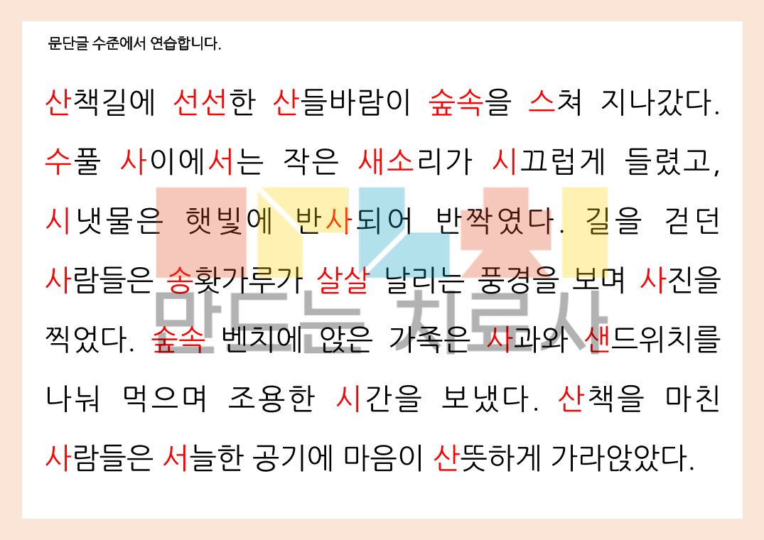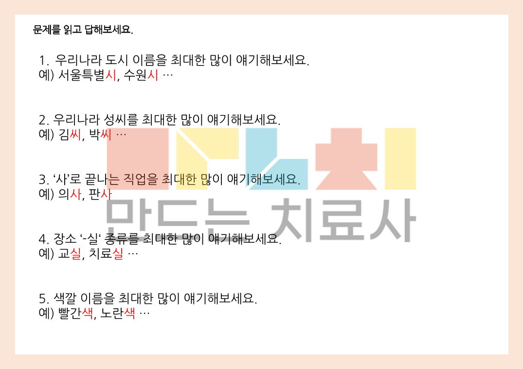 그림 없이 글자로 이루어진 활동지입니다. 아동 보다 학령기 이상의 학생이나 마비말장애 성인 대상자에게 적합하도록 구성되어 있습니다.