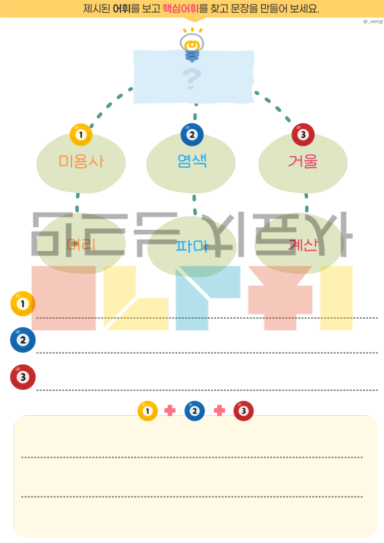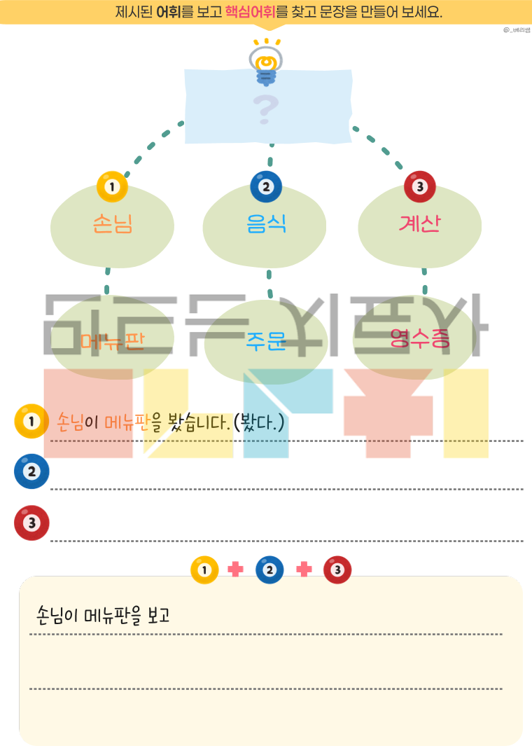 🎀 자 료 소 개 🎀 이 워크북은 학령기 경계선 지능 및 경도 지적장애 아동에게 자주 나타나는 어휘 연상 어려움, 단어 인출 지연, 문장 구성의 불안정성을 개선하기 위한 학습 자료입니다. 제시된 단어에서 핵심어를 찾고, 그 핵심어와 관련된 어휘를 활용해 자연스럽게 이어지는 문장을 구성하도록 설계되어 아동의 어휘 접근성, 의미 범주 확장, 표현 조직화 능력, 문장 산출 안정성을 강화합니다. 또한 초성 힌트 연상 활동과 무초성 연상 활동 페이지를 통해 아동이 핵심어에서 하위어를 떠올리고, 초성 단서를 사용해 보고, 이후 단서를 점차 소거해 나가면서 단어 인출과 어휘 연상 능력을 단계적으로 강화하도록 구성하였습니다. 🔖자료 구성🔖 20가지 핵심 단어 : 40P 활용예시 : 1P(1번 문항만 첨부) 총 합 : 41P (PDF)
