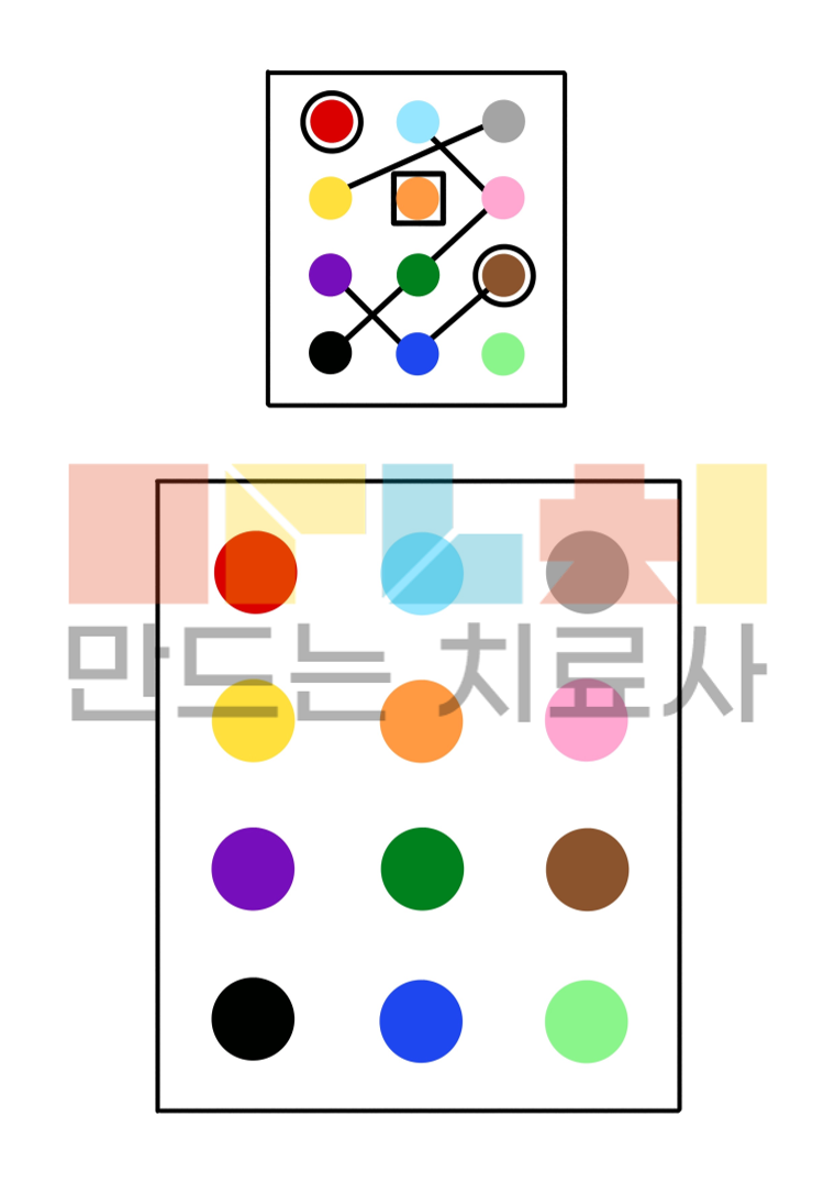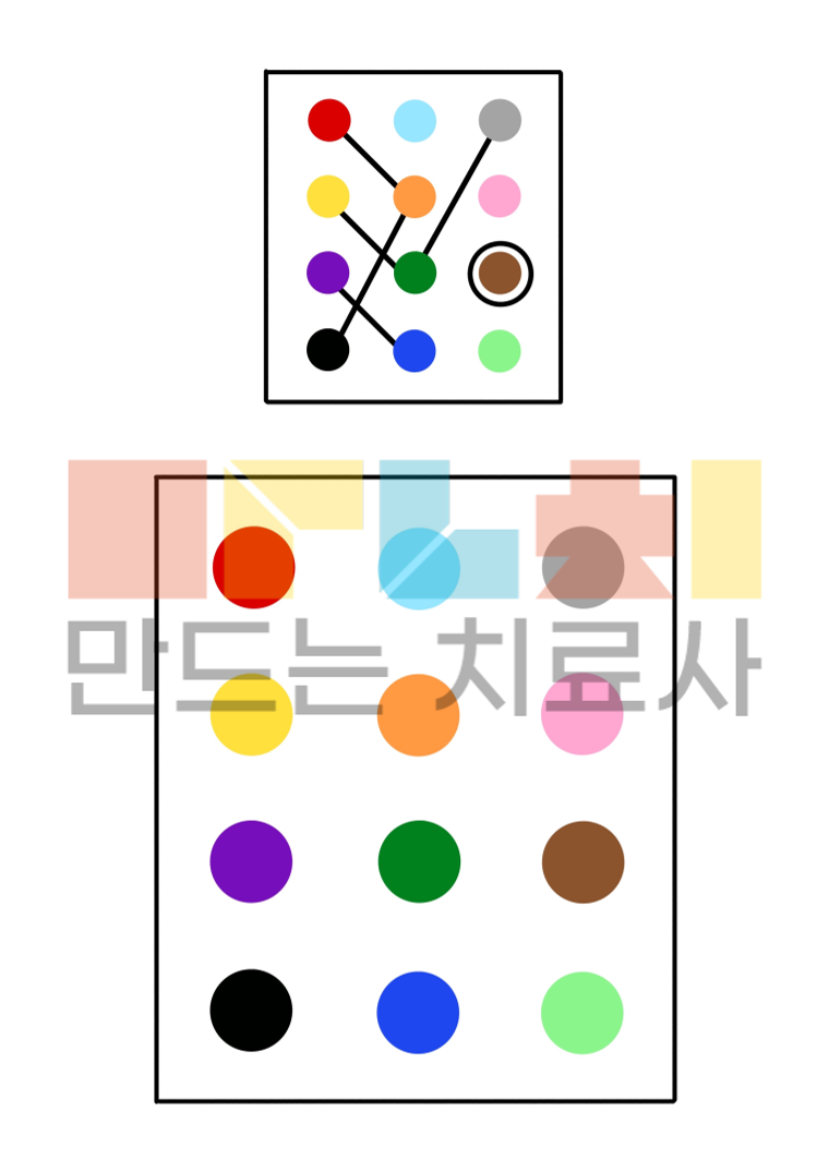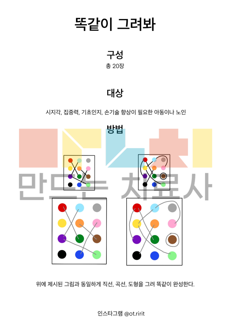위에 제시된 그림과 똑같이 직선, 곡선, 도형을 그리며 손기술 향상과 눈손협응, 시지각, 공간지각을 향상할 수 있습니다.