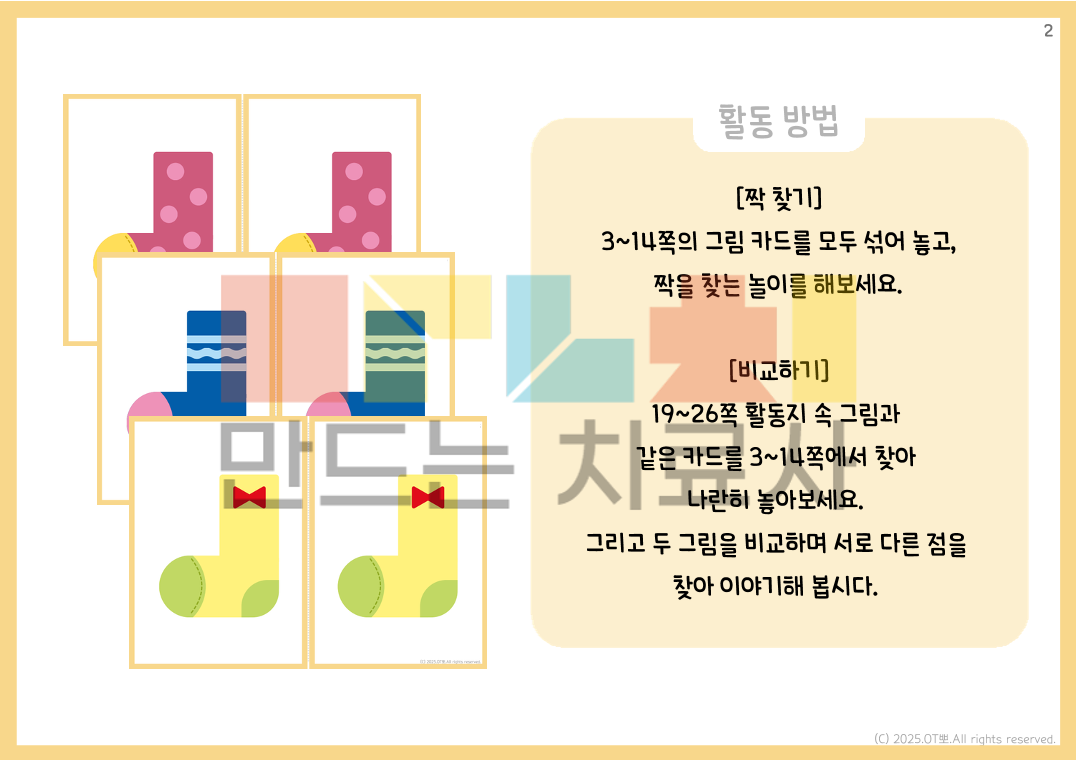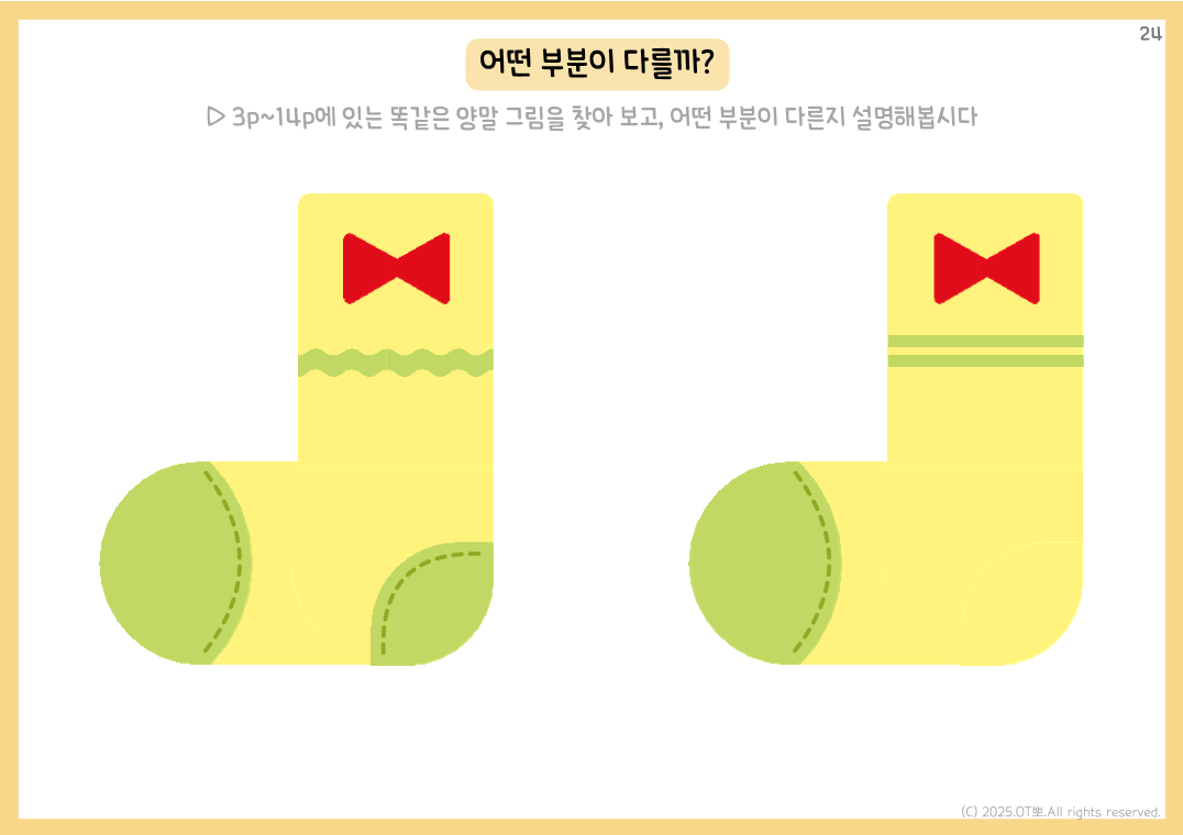 *자료 구성 : 총 26p / PDF 파일 *자료 설명 : 비교, 작업기억, 시지각, 주의집중 향상을 목표로 제작되었습니다 : 짝 찾기 활동지 : 비교하며 서로 다른 점 이야기하는 활동지