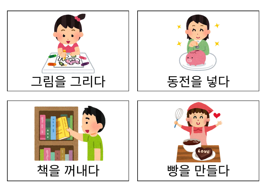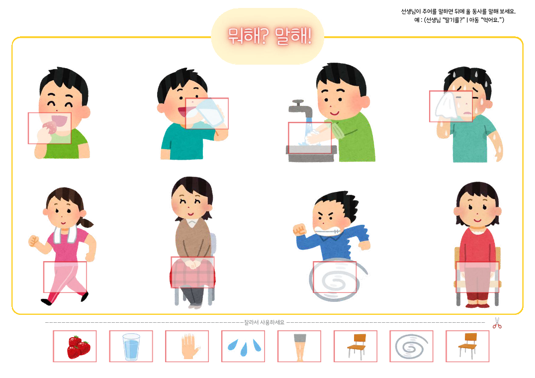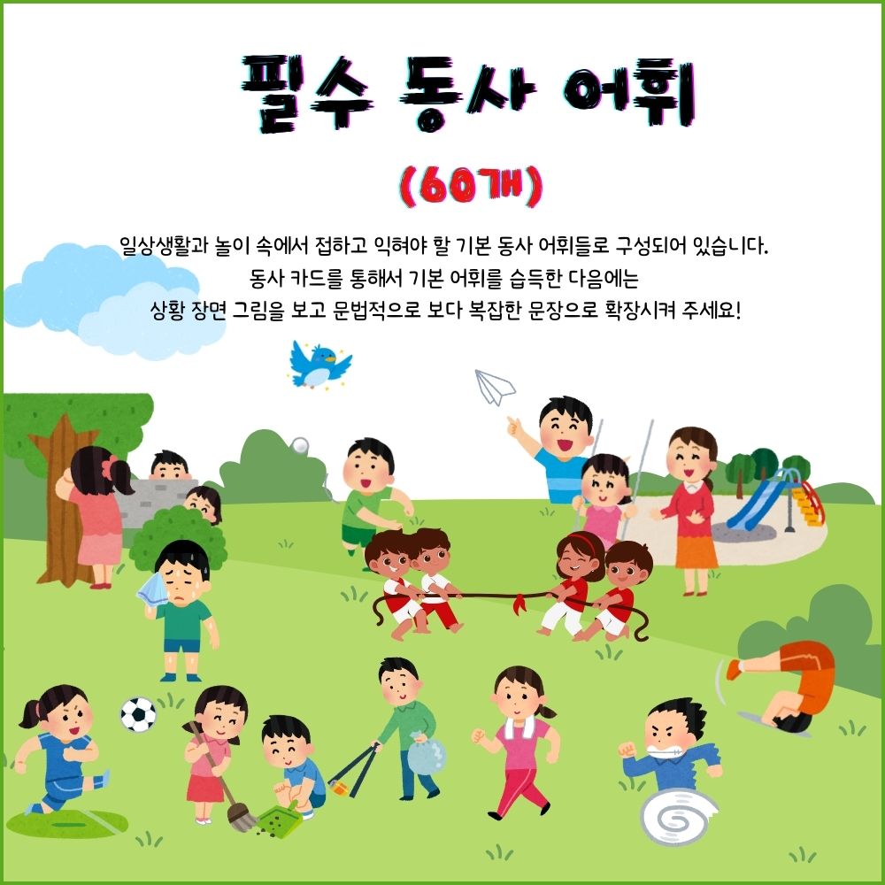 일상생활과 놀이 속에서 접하고 익혀야 할 기본 동사 어휘들로 구성되어 있습니다. 동사 카드를 통해서 기본 어휘를 습득한 다음에는 상황 장면 그림을 보고 문법적으로 보다 복잡한 문장으로 확장시켜 주세요!