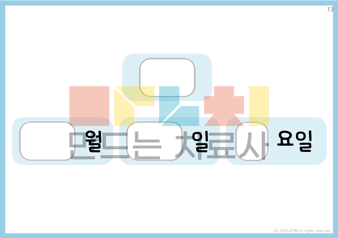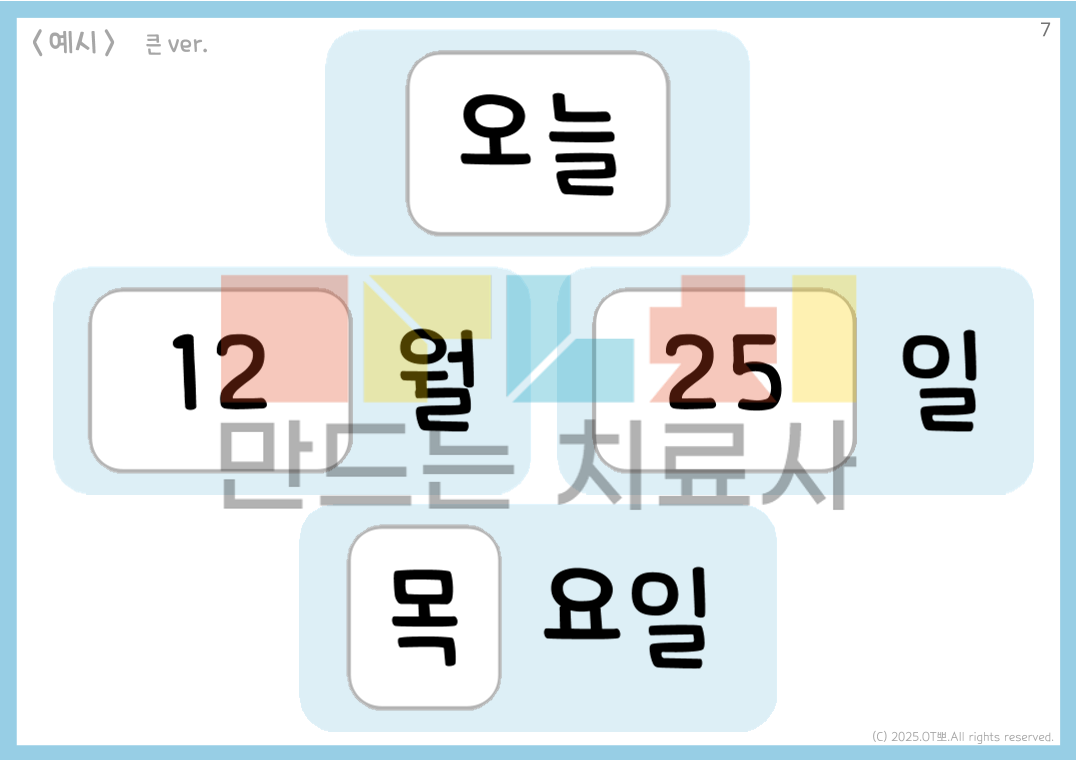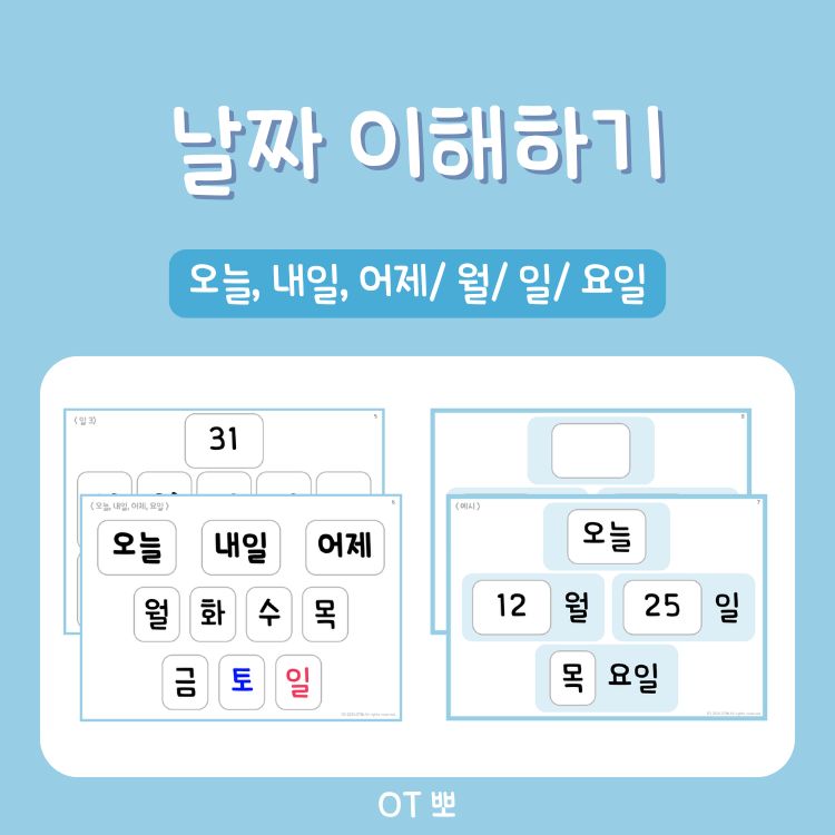 *자료 구성 :PDF파일 :총 13p *자료 설명 : 날짜 이해를 목표로 제작되었습니다 : 오늘, 내일, 어제/ 월/ 일/ 요일을 이해하며 붙이거나 적어서 활용할 수 있습니다.