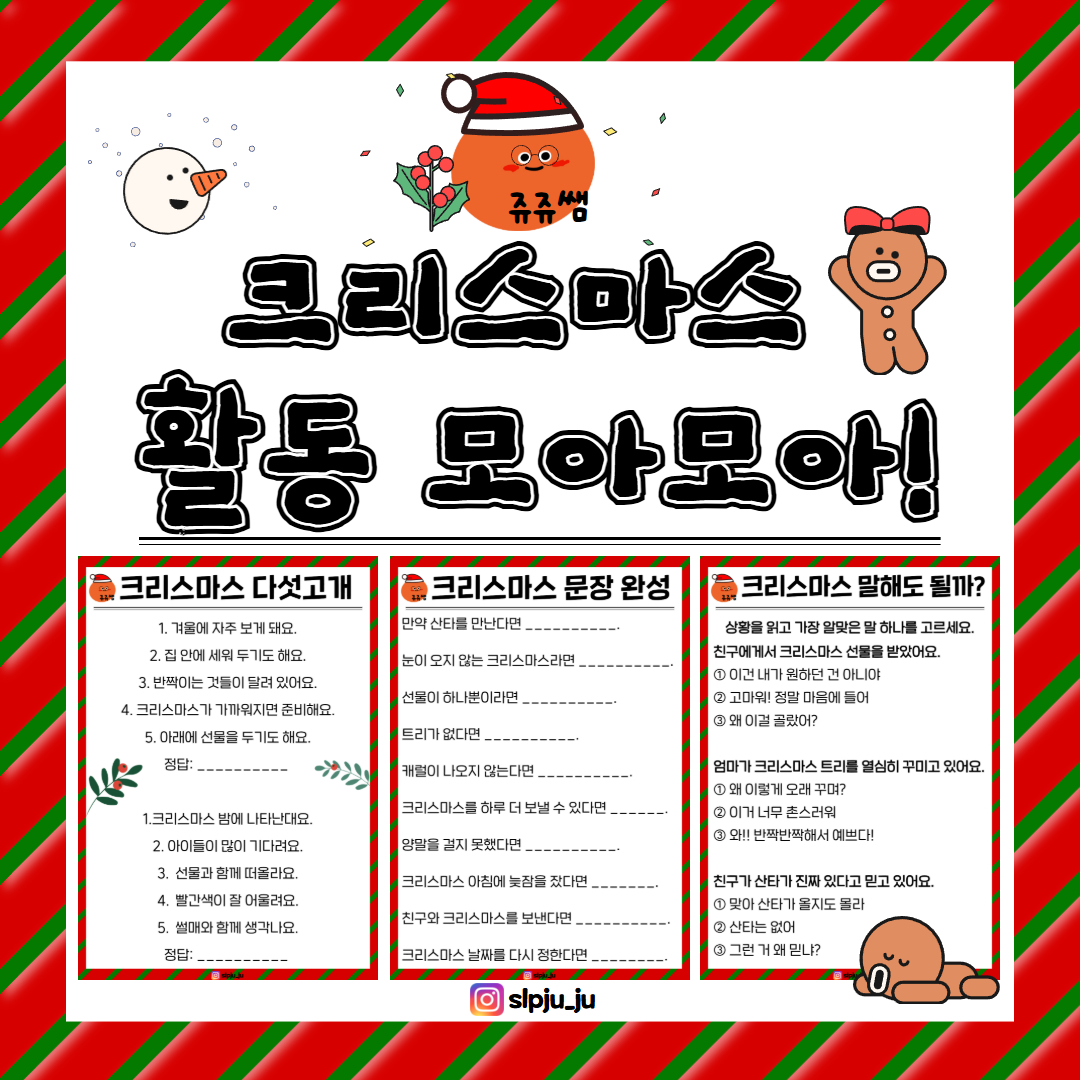 안녕하세요 쥬쥬쌤입니다, 다섯고개 문장완성 문장 만들기 문장 고치기 ‘말해도 될까?’ 어휘 이해·추론·화용 판단을 통합적으로 훈련합니다. 크리스마스 맥락 속에서 상황 이해와 적절한 언어 선택 능력을 자연스럽게 강화할 수 있는 언어치료 자료입니다.