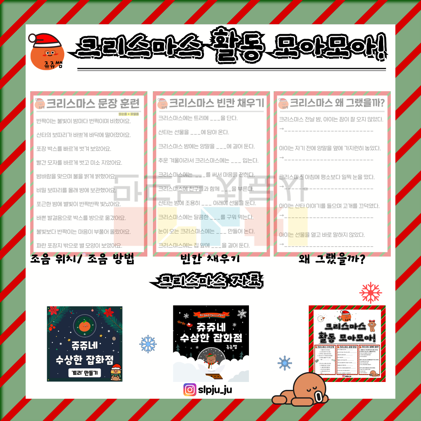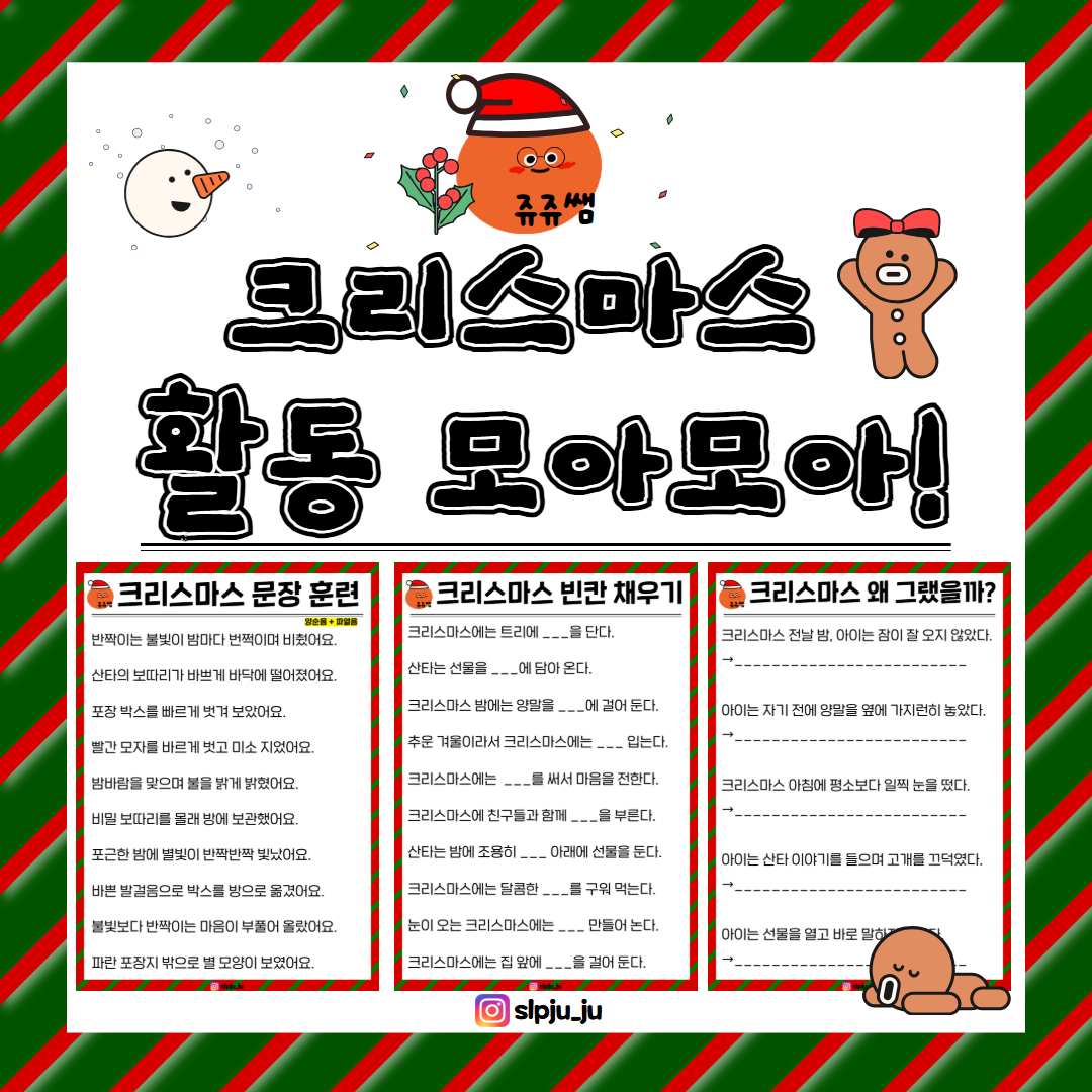 안녕하세요 쥬쥬쌤입니다. 크리스마스 맥락 속에서 문장 훈련, 빈칸 채우기, 이유 추론 활동을 통해 어휘 이해·문장 의미 파악·추론 능력을 강화합니다. 단순 문장 산출을 넘어 상황에 따른 생각과 이유를 언어로 설명하는 능력을 목표로 합니다.