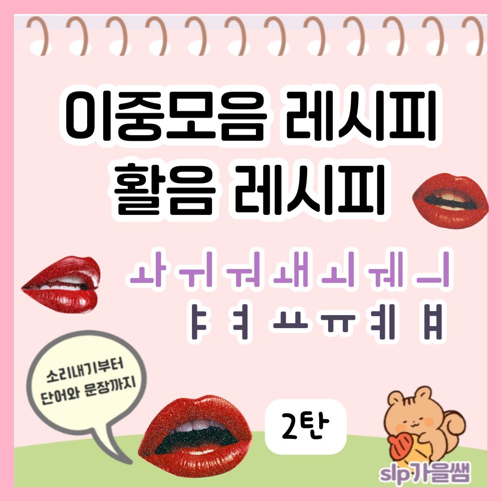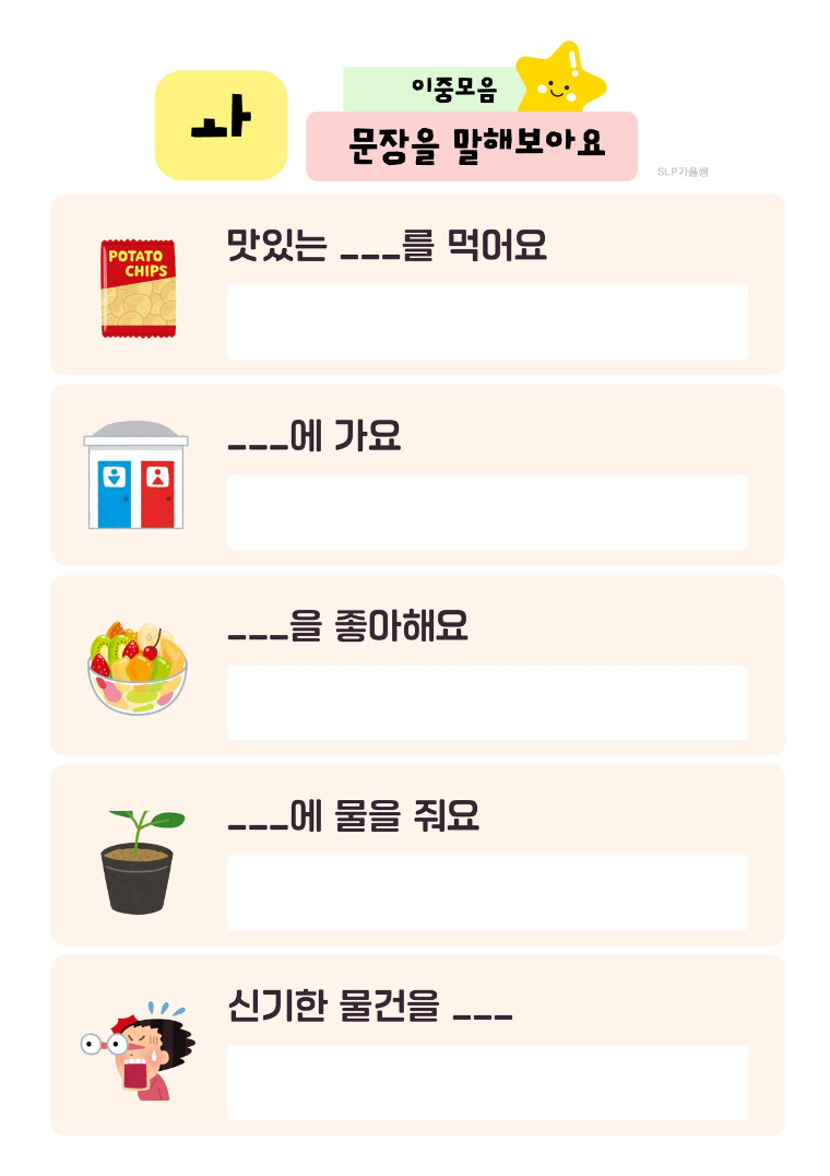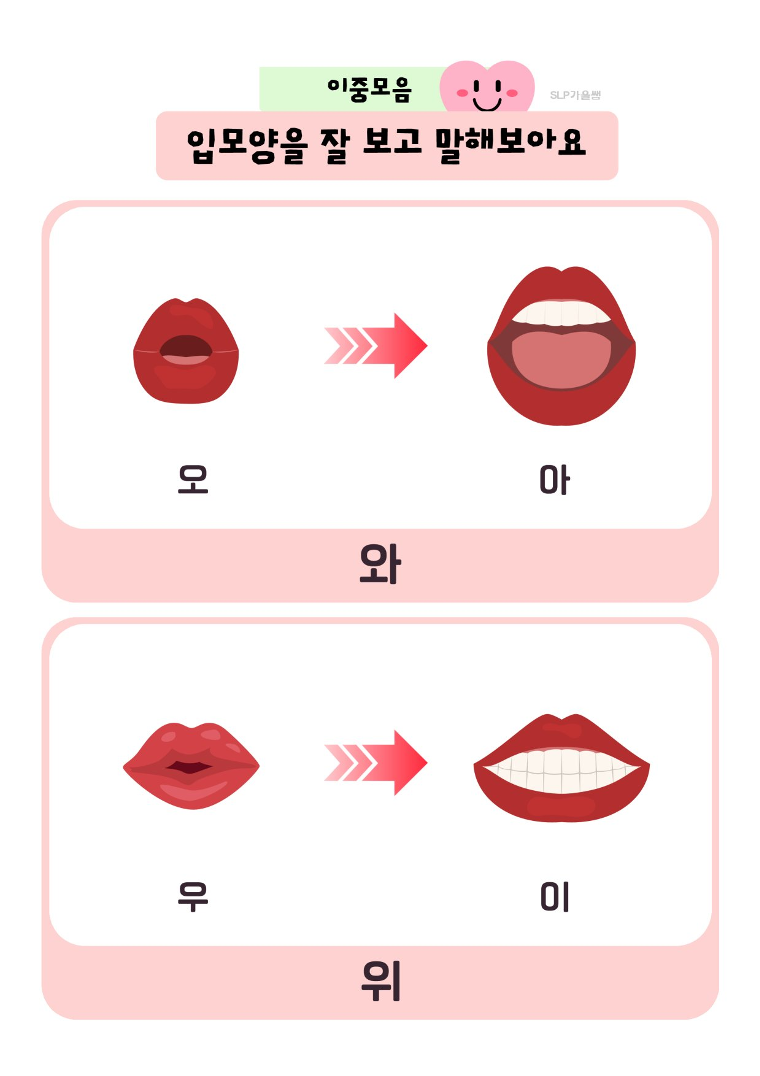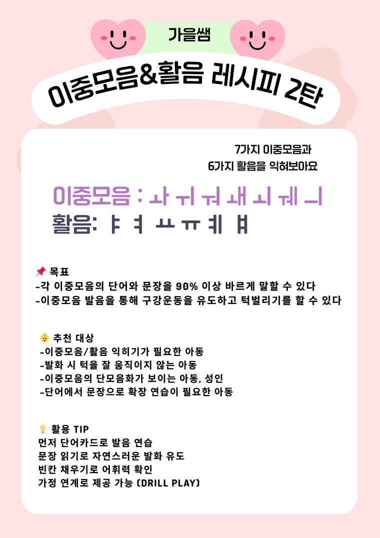 이중모음 : ㅘ ㅟ ㅝ ㅙ ㅚ ㅞ ㅢ 활음: ㅑ ㅕ ㅛ ㅠ ㅖ ㅒ 📌 목표 각 이중모음의 단어와 문장을 90% 이상 바르게 말할 수 있다 이중모음 발음을 통해 구강운동을 유도하고 턱벌리기를 할 수 있다 👶 추천 대상 이중모음 익히기가 필요한 아동 발화 시 턱을 잘 움직이지 않는 아동 이중모음의 단모음화가 보이는 아동, 성인 단어에서 문장으로 확장 연습이 필요한 아동 💡 활용 TIP 먼저 단어카드로 발음 연습 문장 읽기로 자연스러운 발화 유도 빈칸 채우기로 어휘력 확인 가정 연계로 제공 가능 (drill play) #이중모음 #언어치료 #언어치료학습지 #이중모음레시피 #단어학습 #문장연습 #슬기로운언어치료생활 #slp가을샘 #언어재활사 #언어치료사 #조음음운치료