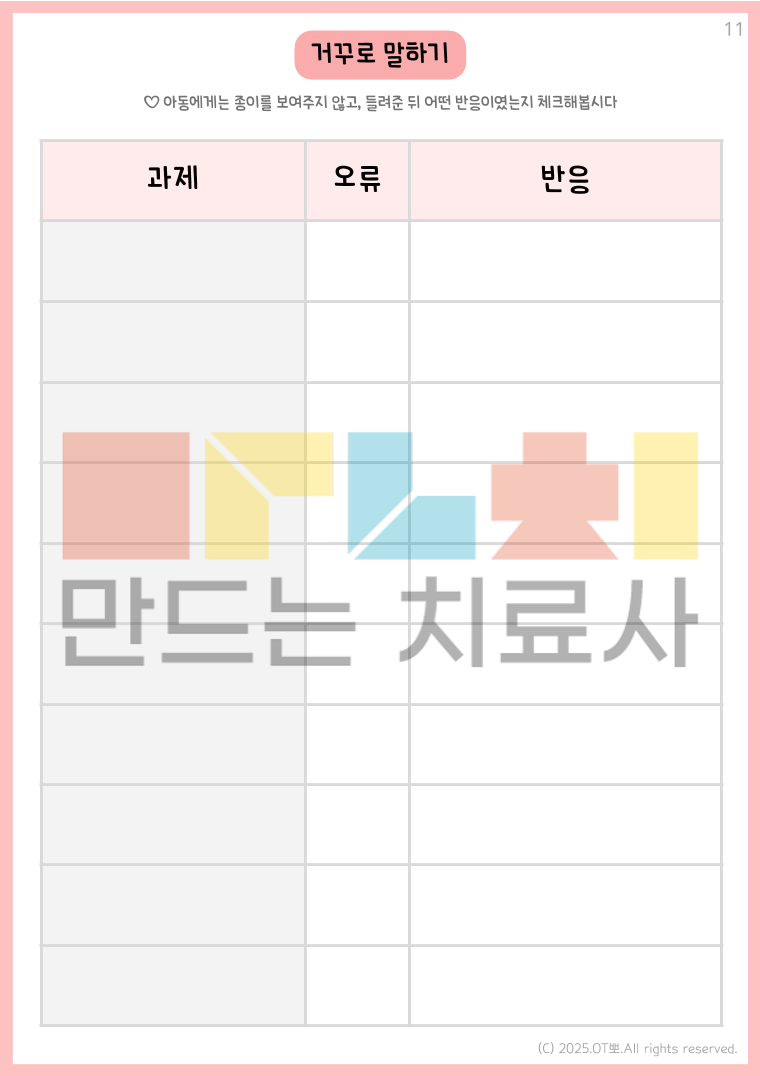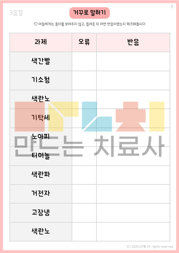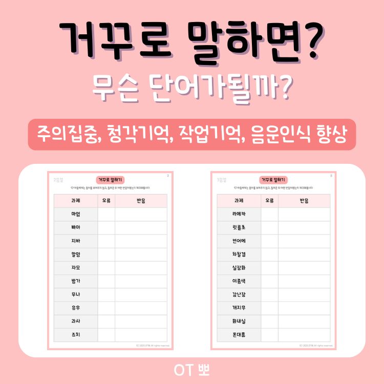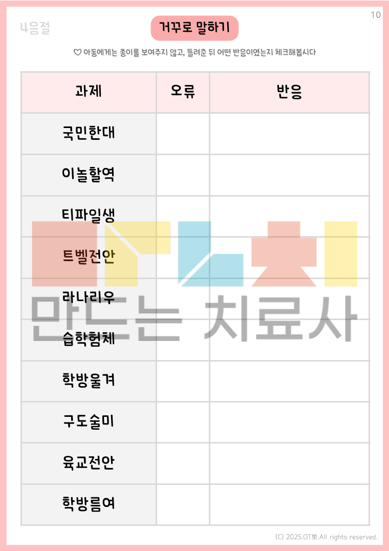 *자료 구성 : 총 11p / PDF 파일 *자료 설명 : 주의집중, 청각기억, 작업기억, 음운 인식 향상을 목표로 제작 되었습니다 : 2음절(4장)/ 3음절(3장)/ 4음절(2장)/ 자유롭게 활용할 수 있는 워크지(1장)