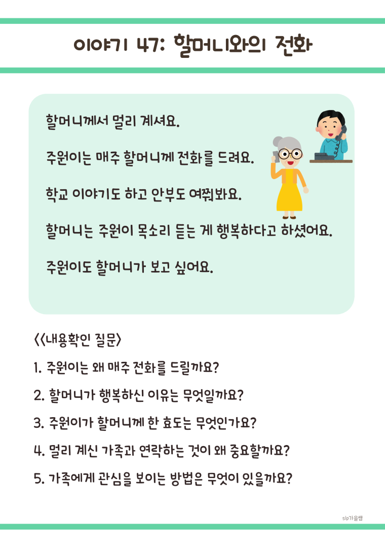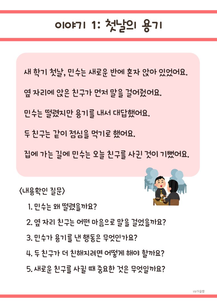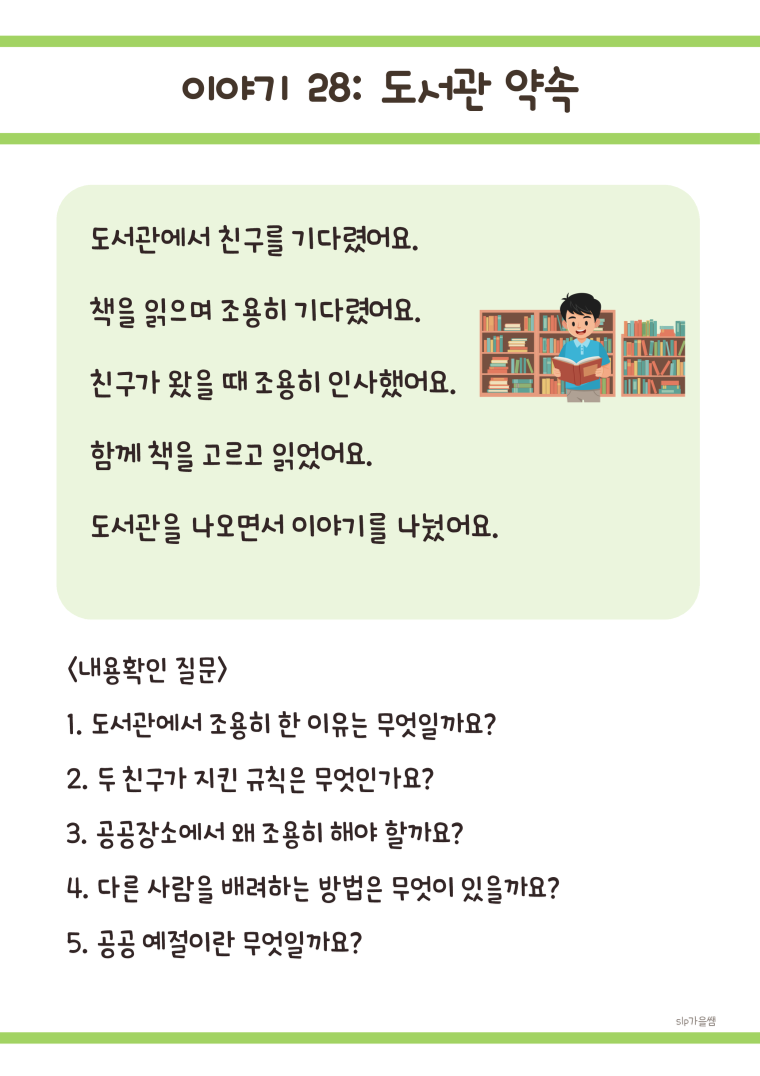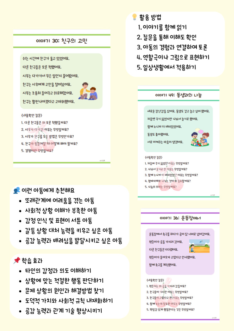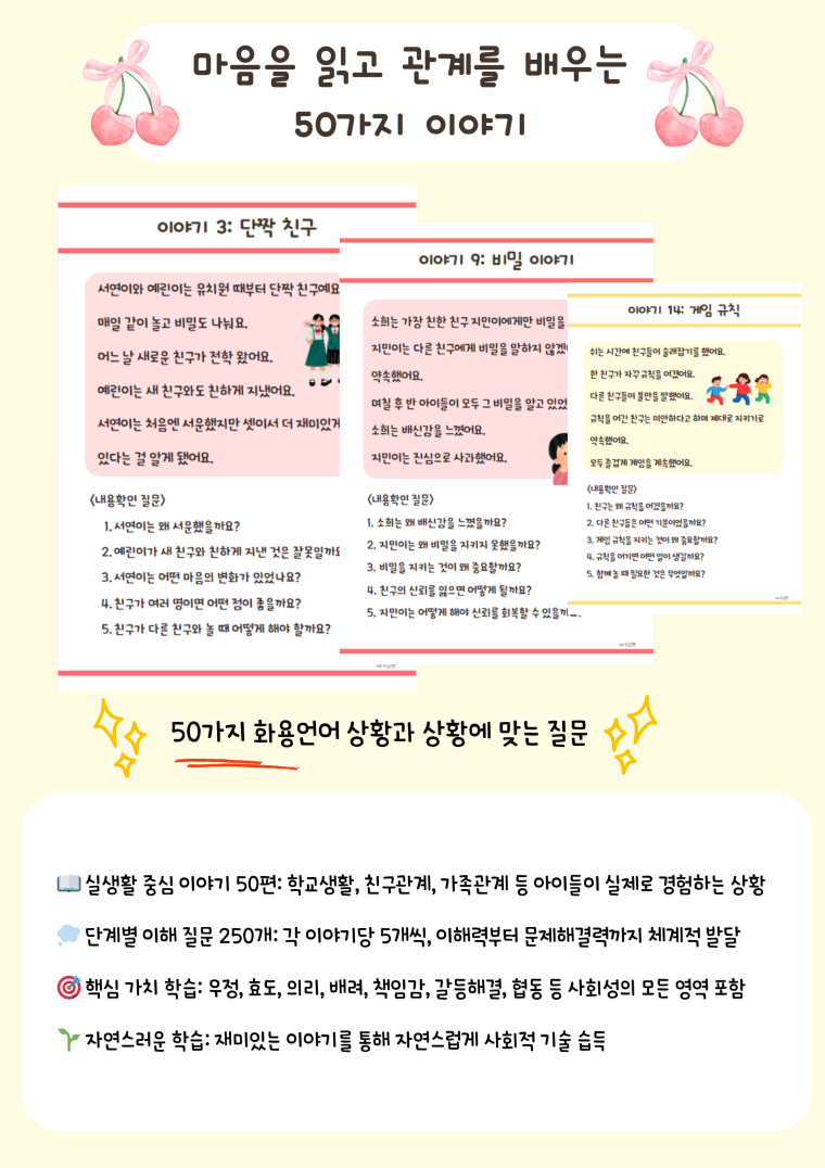 50가지 화용언어 상황과 상황에 맞는 질문 📖 실생활 중심 이야기 50편: 학교생활, 친구관계, 가족관계 등 아이들이 실제로 경험하는 상황 💭 단계별 이해 질문 250개: 각 이야기당 5개씩, 이해력부터 문제해결력까지 체계적 발달 🎯 핵심 가치 학습: 우정, 효도, 의리, 배려, 책임감, 갈등해결, 협동 등 사회성의 모든 영역 포함 🌱 자연스러운 학습: 재미있는 이야기를 통해 자연스럽게 사회적 기술 습득 💡 활용 방법 이야기를 함께 읽기 질문을 통해 이해도 확인 아동의 경험과 연결하여 토론 역할극이나 그림으로 표현하기 일상생활에서 적용하기 👥 이런 아동에게 추천해요 또래관계에 어려움을 겪는 아동 사회적 상황 이해가 부족한 아동 감정 인식 및 표현이 서툰 아동 갈등 상황 대처 능력을 키우고 싶은 아동 공감 능력과 배려심을 발달시키고 싶은 아동 📌 학습 효과 타인의 감정과 의도 이해하기 상황에 맞는 적절한 행동 판단하기 문제 상황의 원인과 해결방법 찾기 도덕적 가치와 사회적 규칙 내재화하기 공감 능력과 관계 기술 향상시키기