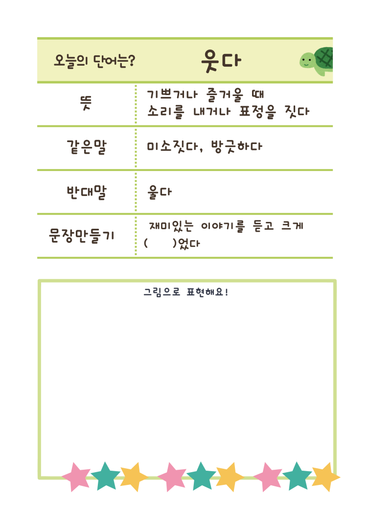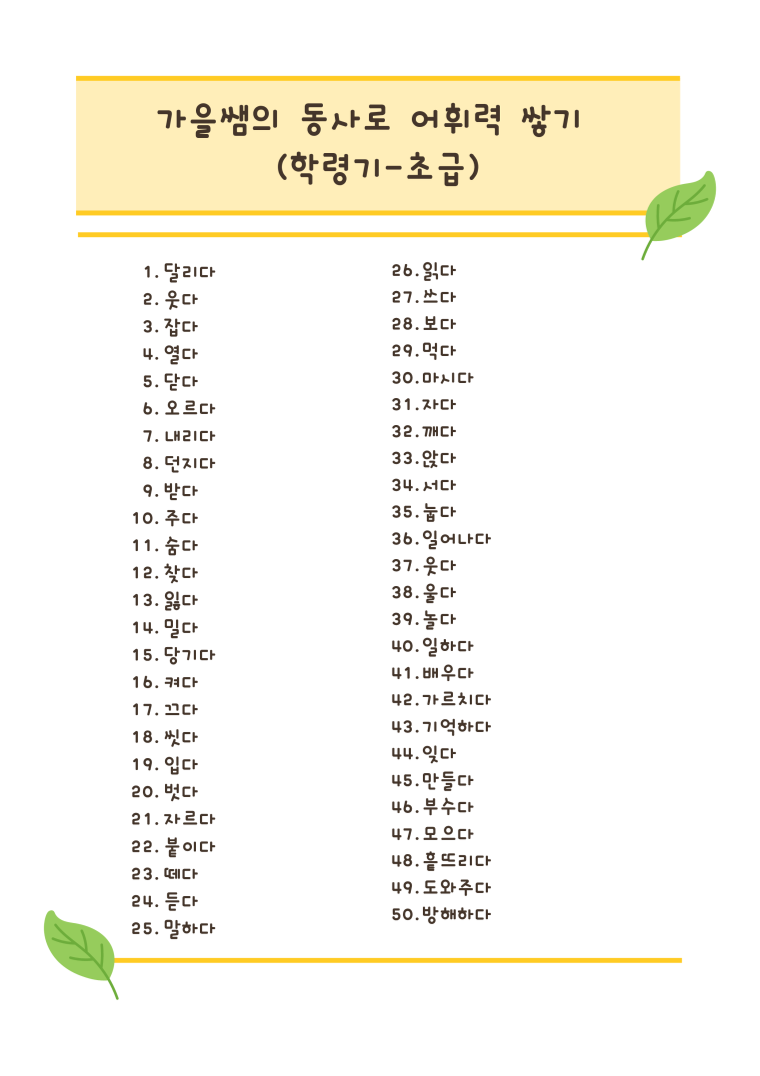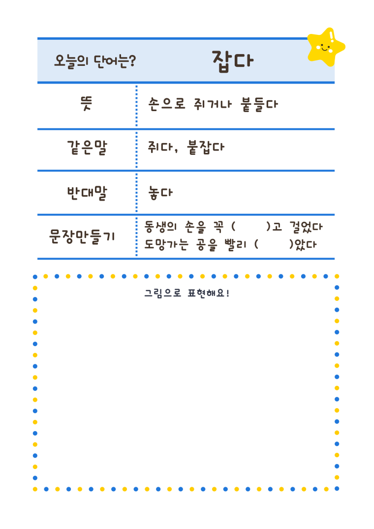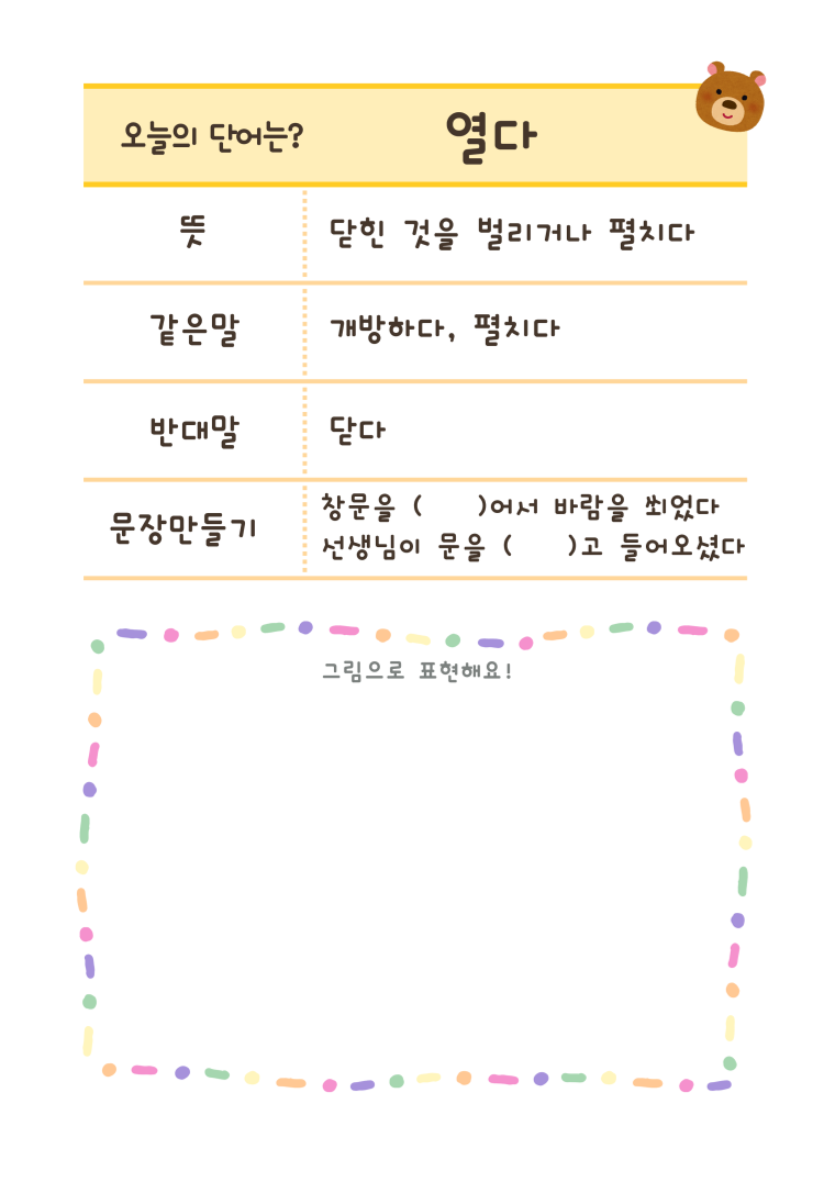 [언어치료사가 알려주는 효과적인 어휘 학습법] 안녕하세요, 가을쌤입니다☆ 오늘은 '동사 익힘표' 학습지를 소개하며, 왜 이런 구성이 필요한지 말씀드리려고 해요~ 🔍 어휘력, 4단계로 완성됩니다 많은 부모님들이 "단어 뜻만 알면 되는 거 아닌가요?"라고 물으세요. 하지만 언어치료 현장에서 보면, 뜻만 아는 아이들이 실제 대화에서는 그 단어를 못 쓰는 경우가 많습니다. 진짜 어휘력은 이 4가지가 모두 필요해요: ✅ 1단계: 뜻 이해하기 - 단어의 정확한 의미 파악 - 개념의 핵심 이해 ✅ 2단계: 같은말 배우기 - 유사 어휘 학습으로 표현력 확장 - "달리다 = 뛰다 = 질주하다"처럼 다양한 표현 익히기 ✅ 3단계: 반대말 알기 - 대조 개념 학습으로 의미 명확화 - 개념의 경계를 뚜렷하게 이해 ✅ 4단계: 문장 만들기 - 실생활 적용 능력 키우기 - '아는 단어'를 '쓸 수 있는 단어'로 전환 🎨 그리고 특별한 장치: 그림으로 표현하기 각 학습지마다 '그림으로 표현하기' 칸을 넣었어요. 이게 왜 중요할까요? 1. 능동적 학습 - 수동적 암기 → 능동적 상상 - 아이가 스스로 단어를 해석하고 표현 2. 시각적 기억 - 언어 정보 + 시각 이미지 통합 - 장기기억으로 전환되는 효과 ↑ 3. 창의적 사고 - "달리다"를 어떻게 그릴까? - 다리? 사람? 동물? → 사고 확장 4. 멀티모달 학습 - 읽기(시각) + 쓰기(운동) + 그리기(시각+운동) - 여러 감각을 활용한 통합 학습 📚 50개 핵심 동사로 구성 일상생활에서 꼭 필요한 동사 50개를 이 체계로 모두 학습할 수 있도록 만들었습니다. 언어치료 현장과 가정에서 모두 활용 가능한 자료예요. 우리 아이 어휘력, 이제 제대로 키워보세요! 💙 #언어치료 #어휘력 #학습지 #언어발달 #초등국어