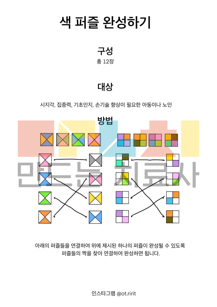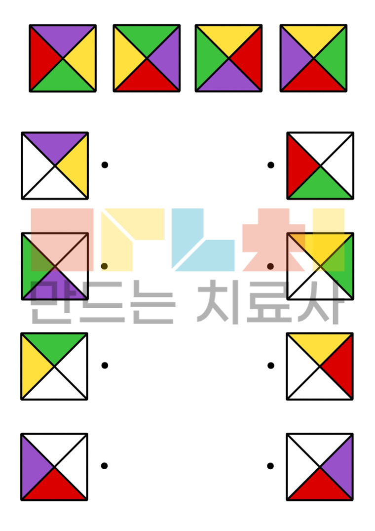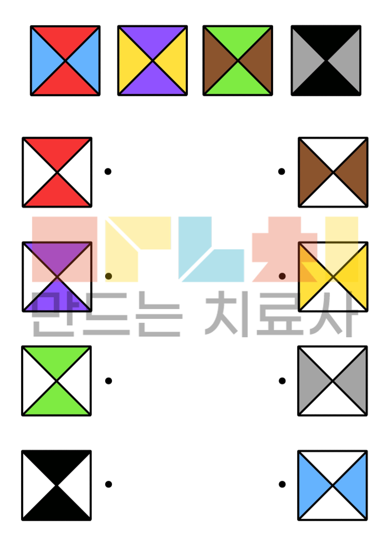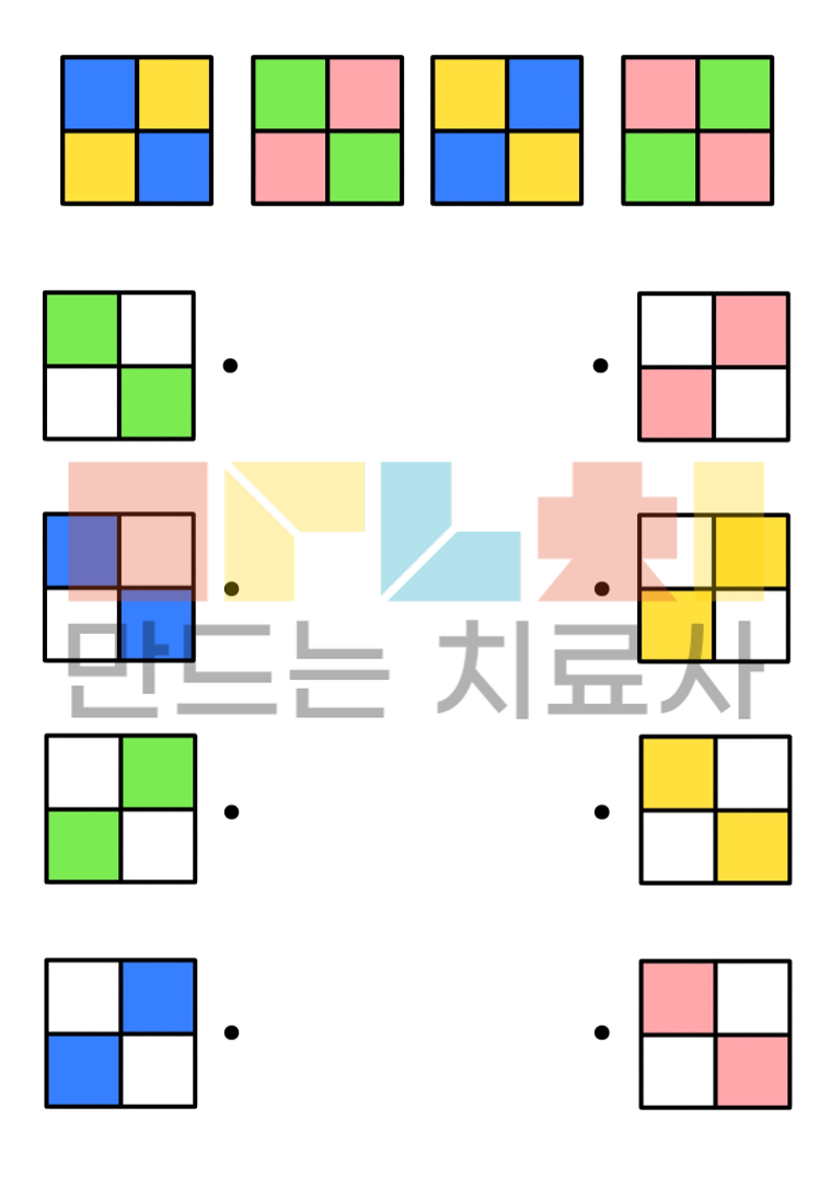 아래의 퍼즐을 연결하여 위에 제시된 색 퍼즐들을 완성할 수 있도록 연결하면 됩니다.