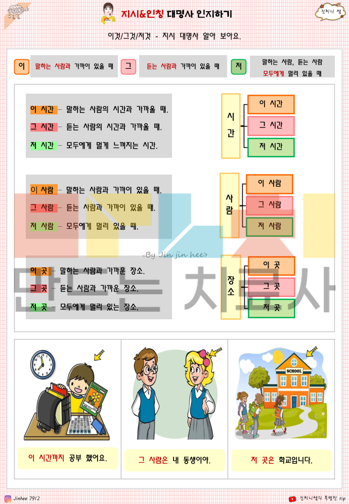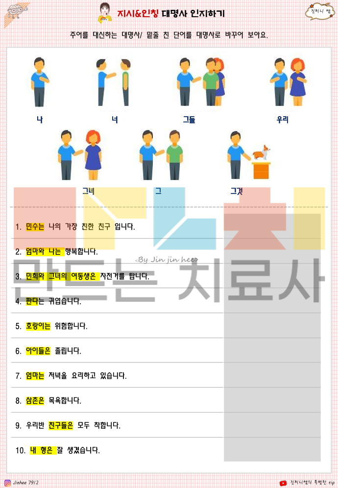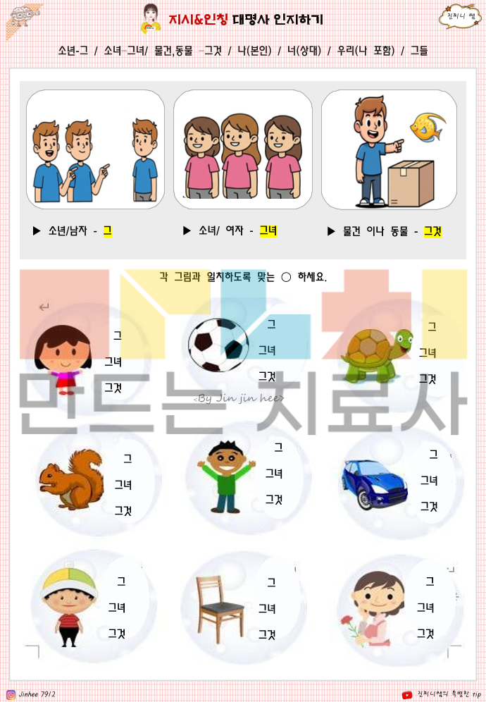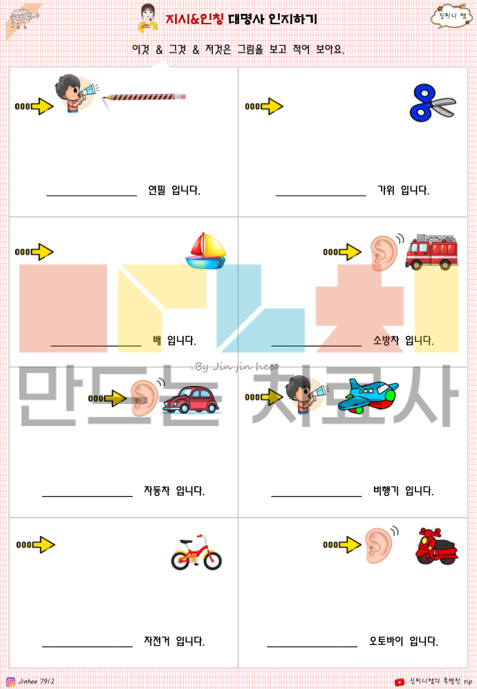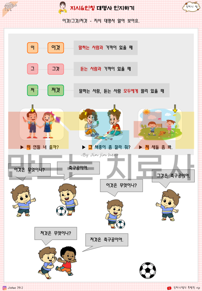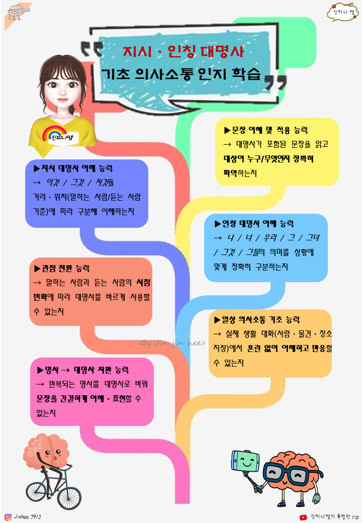 질문인지1 에 이어 2권입니다. 예전 업그레이드 버전이구요. 1. 지시 대명사 이해 능력 → 이것 / 그것 / 저것을 거리·위치(말하는 사람/듣는 사람 기준)에 따라 구분해 이해하는지 2. 인칭 대명사 이해 능력 → 나 / 너 / 우리 / 그 / 그녀 / 그것 / 그들의 의미를 상황에 맞게 정확히 구분하는지 3. 관점 전환 능력 → 말하는 사람과 듣는 사람의 시점 변화에 따라 대명사를 바르게 사용할 수 있는지 4. 문장 이해 및 적용 능력 → 대명사가 포함된 문장을 읽고 대상이 누구/무엇인지 정확히 파악하는지 5. 명사 → 대명사 치환 능력 → 반복되는 명사를 대명사로 바꿔 문장을 간결하게 이해·표현할 수 있는지 6. 일상 의사소통 기초 능력 → 실제 생활 대화(사람·물건·장소 지칭)에서 혼란 없이 이해하고 반응할 수 있는지 한줄 요약하면 이 책은 아동이 ‘누구를, 무엇을, 어느 기준에서 말하는지’를 이해하는 기초 문법·의사소통 인지 능력을 평가하고 강화하는 자료입니다.