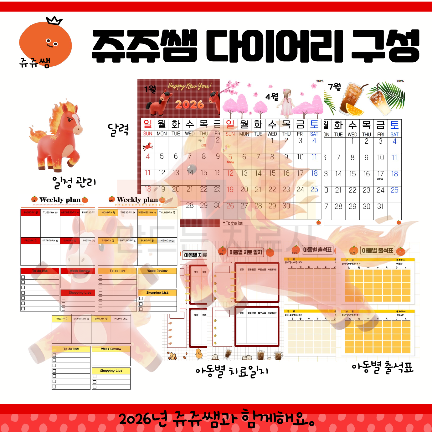 안녕하세요 쥬쥬쌤입니다. 연말이 되면 새로운 달력, 다이어리, 스케줄러를 찾아서 여기저기 유목하는 선생님들 많으시죠? 쥬쥬쌤 언어치료 다이어리로 함께해요~ 2026년은 ‘붉은 말의 해’ 병오년입니다. 쥬쥬쌤의 언어치료 다이어리는 치료할 때 필요한 달력, 회기 기록, weekly plan, 대상자의 목표, 목표, 출석, 결석, 보강 관리까지 편하게 활용할 수 있는 다이어리입니다.