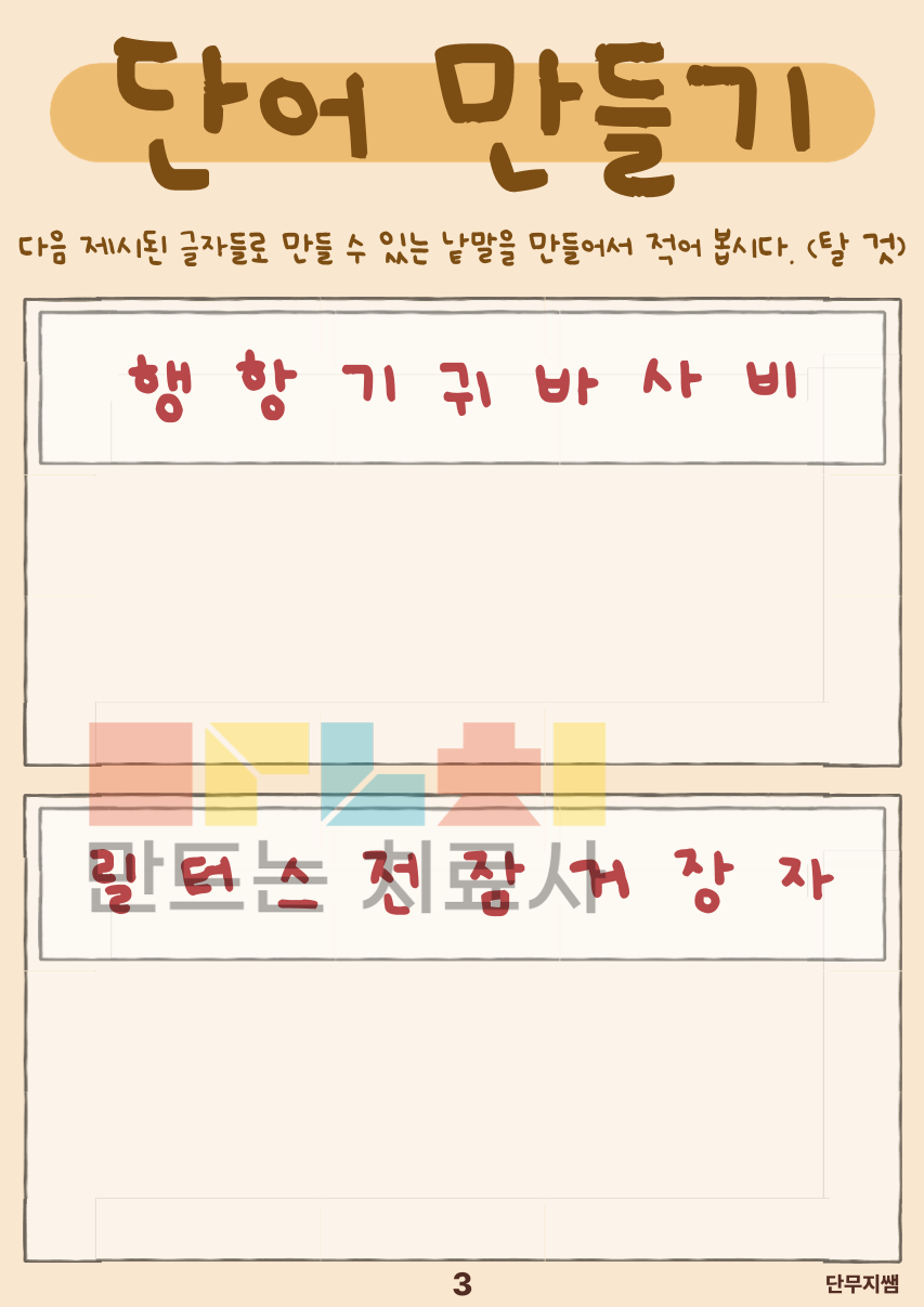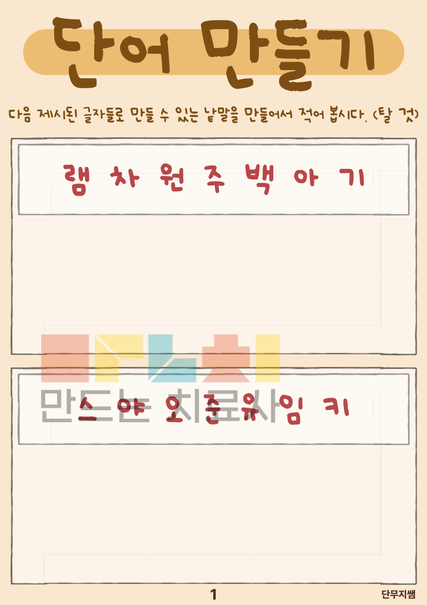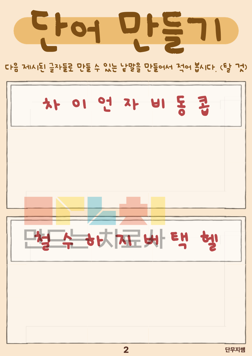주어진 글자를 조합하여 새로운 단어를 만들어 보는 활동을 통해 언어적 사고와 인지적 조직 능력을 동시에 자극하고, 스스로 생각하고 완성하는 경험을 통해 자신감과 과제 수행 지속력을 기르는 것을 목표로 합니다.