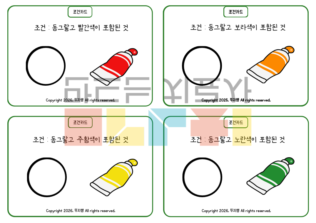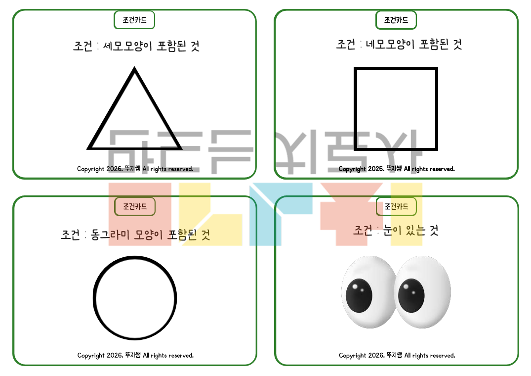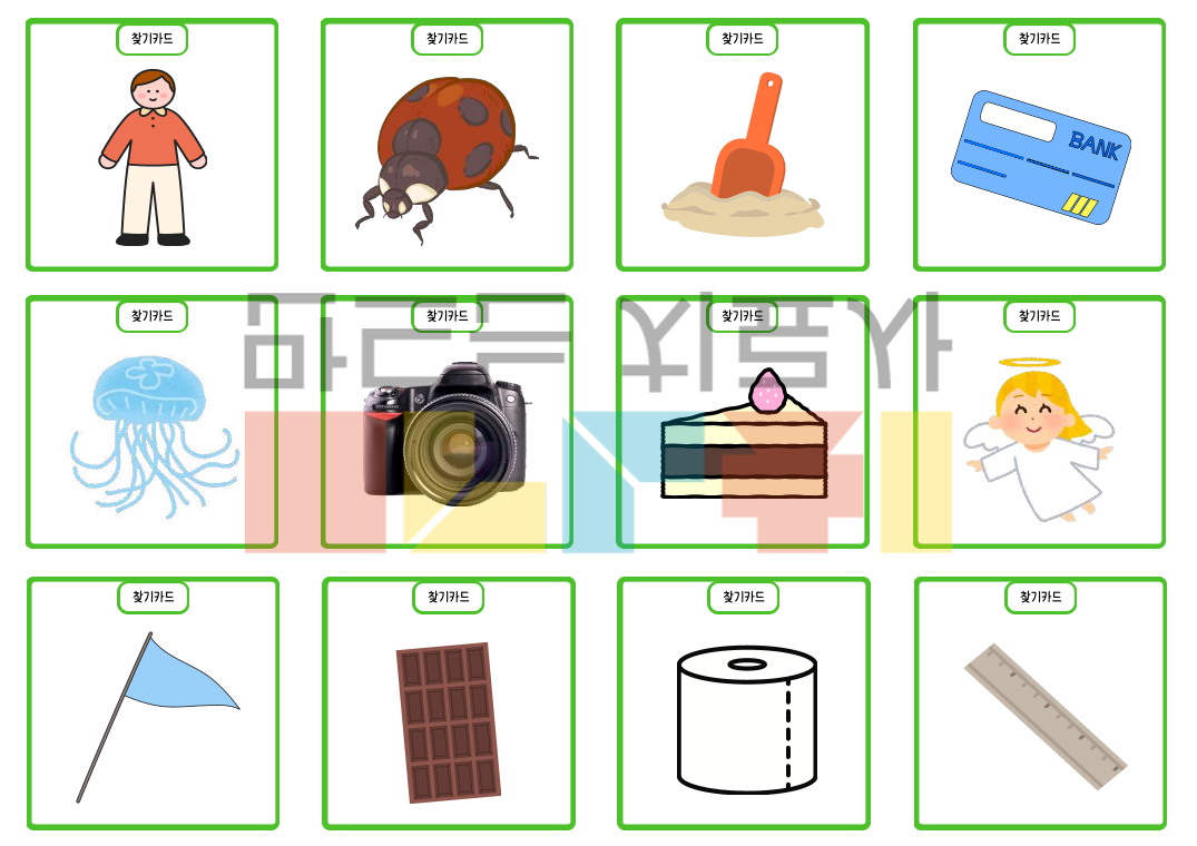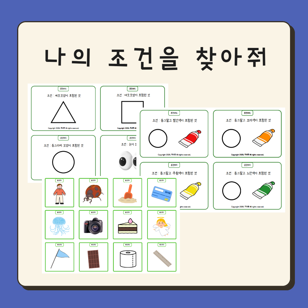 '나의 조건을 찾아줘' 자료는 1가지 조건부터 그 이상의 조건을 듣고 부합하는 어휘카드를 찾아내는 활동자료 입니다 조건을 이해하고 이에 해당하는 어휘를 모두 찾도록 합니다 * 활동 방법* 1. 조건을 읽고 해당하는 어휘 찾아내기 2. 제한 시간내에 최대한 많은 어휘 찾기 페이지수 : 21페이지 (조건카드-60장, 찾기카드-72장)