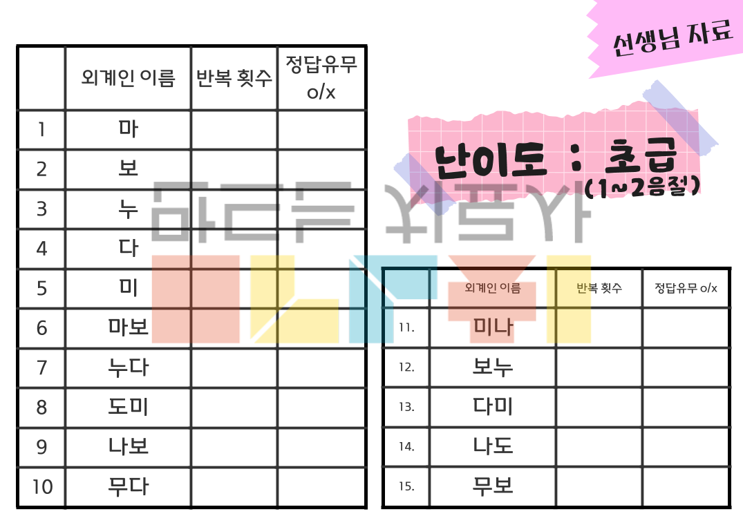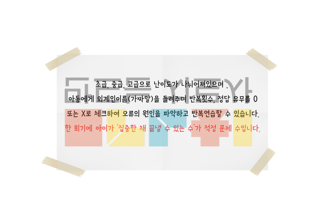 이 활동지는 ‘의미를 쓰지 않고 소리를 기억하는 힘’을 기르는 것을 목표로 한다. 1. 의미 개입 없이 순수 음운기억을 평가·훈련합니다. 2. 청각으로 입력된 음운 정보를 단기간 저장·유지하는 능력을 강화합니다. 3. 시각 자극은 주의 고정용으로만 사용하여 음운 처리의 정확성을 높입니다. 4. 이후 청각 작업기억으로의 전이를 위한 기초 능력을 형성하도록 돕습니다.
