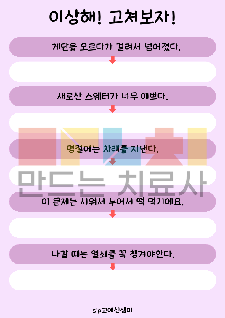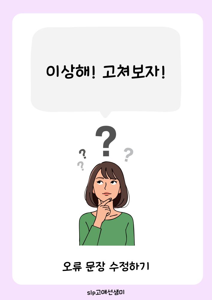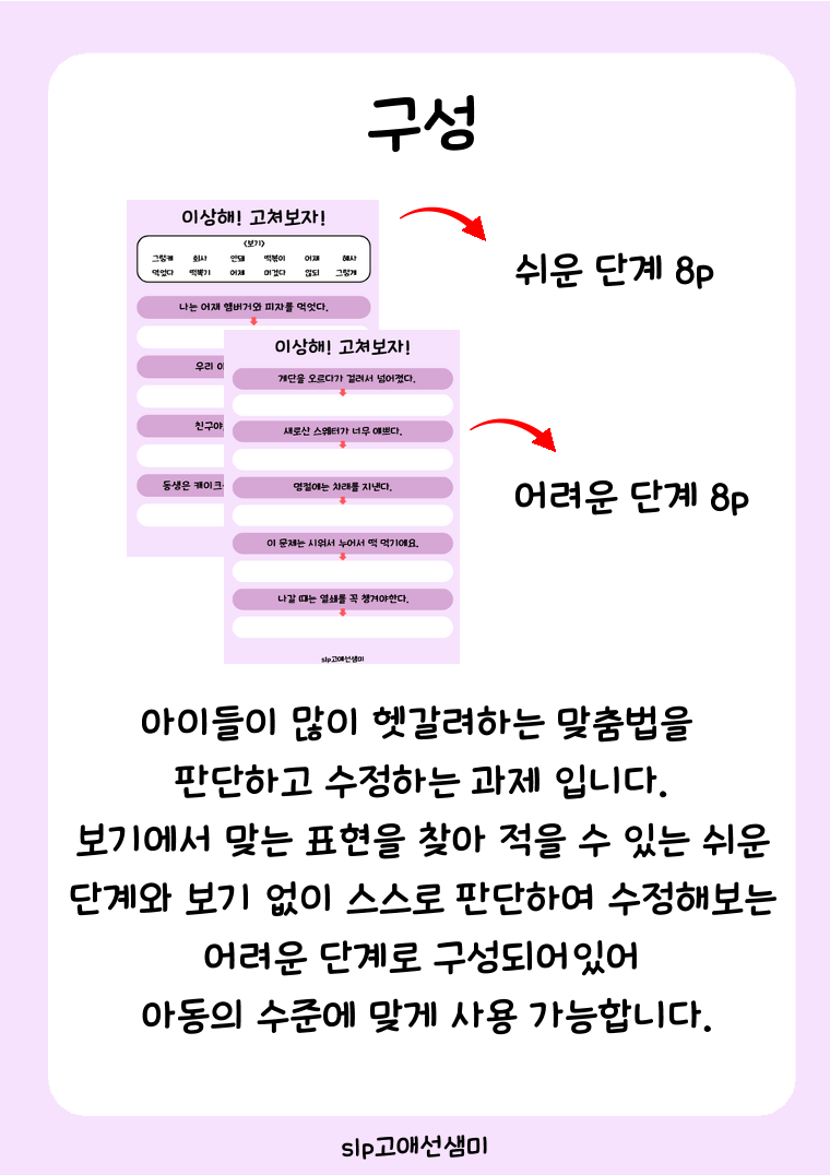 아이들이 많이 헷갈려하는 맞춤법을 판단하고 수정하는 과제 입니다. 보기에서 맞는 표현을 찾아 적을 수 있는 쉬운 단계와 보기 없이 스스로 판단하여 수정해보는 어려운 단계로 구성되어있어 아동의 수준에 맞게 사용 가능합니다.