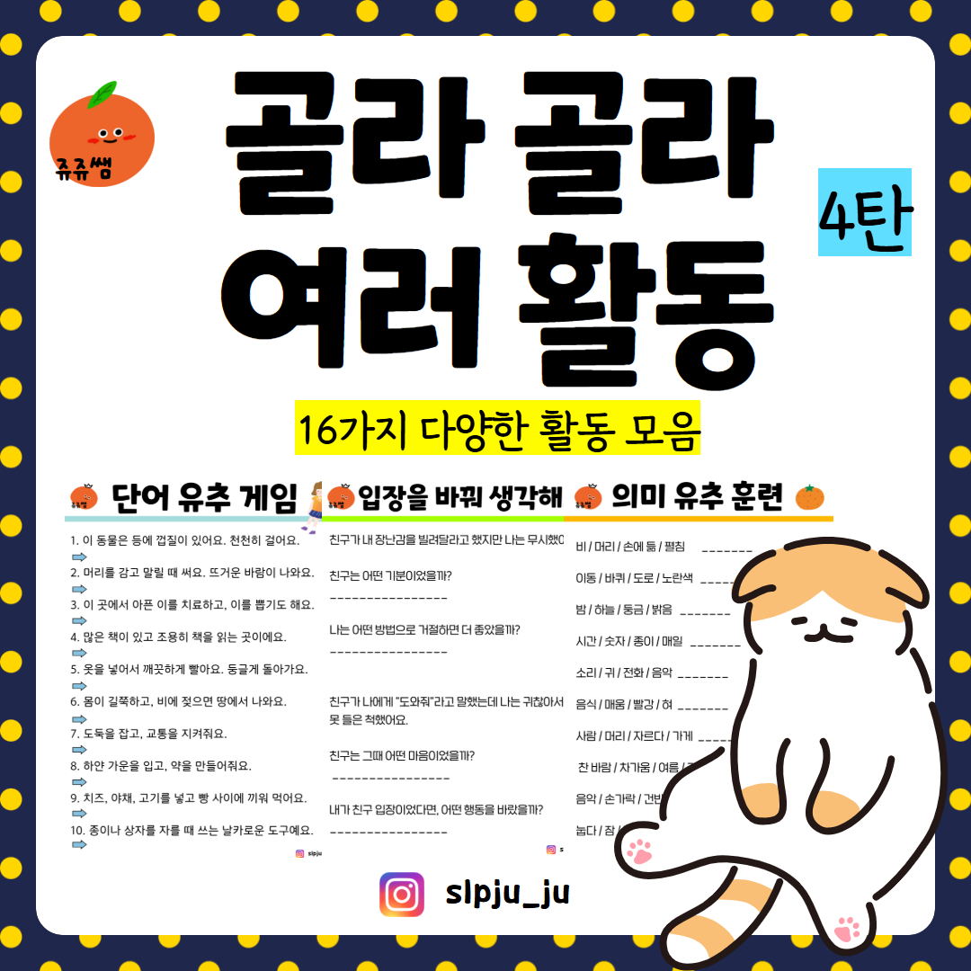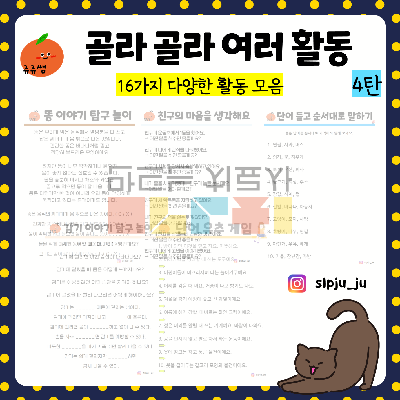 안녕하세요 쥬쥬쌤입니다. 1. 감기 이야기 탐구 놀이 2. 금 이야기 탐구 놀이 3. 단어 듣고 순서대로 말하기 4. 단어 유추 게임 5. 듣고 순서대로 말하기 6. 똥 이야기 탐구 놀이 7. 문장 속 빈칸 채우기 8. 문장 속 빈칸 채우기 2탄 9. 의미 유추 훈련 10. 입장을 바꿔 생각해요 11. 친구의 마음을 생각해요 12. 친구의 마음을 생각해요 2탄 13. 커피 이야기 탐구 놀이 14. 문장 듣고 맞으면 O, 틀리면 X 15. 단어 유추 게임 2탄 16. 지시에 따라 표시하기