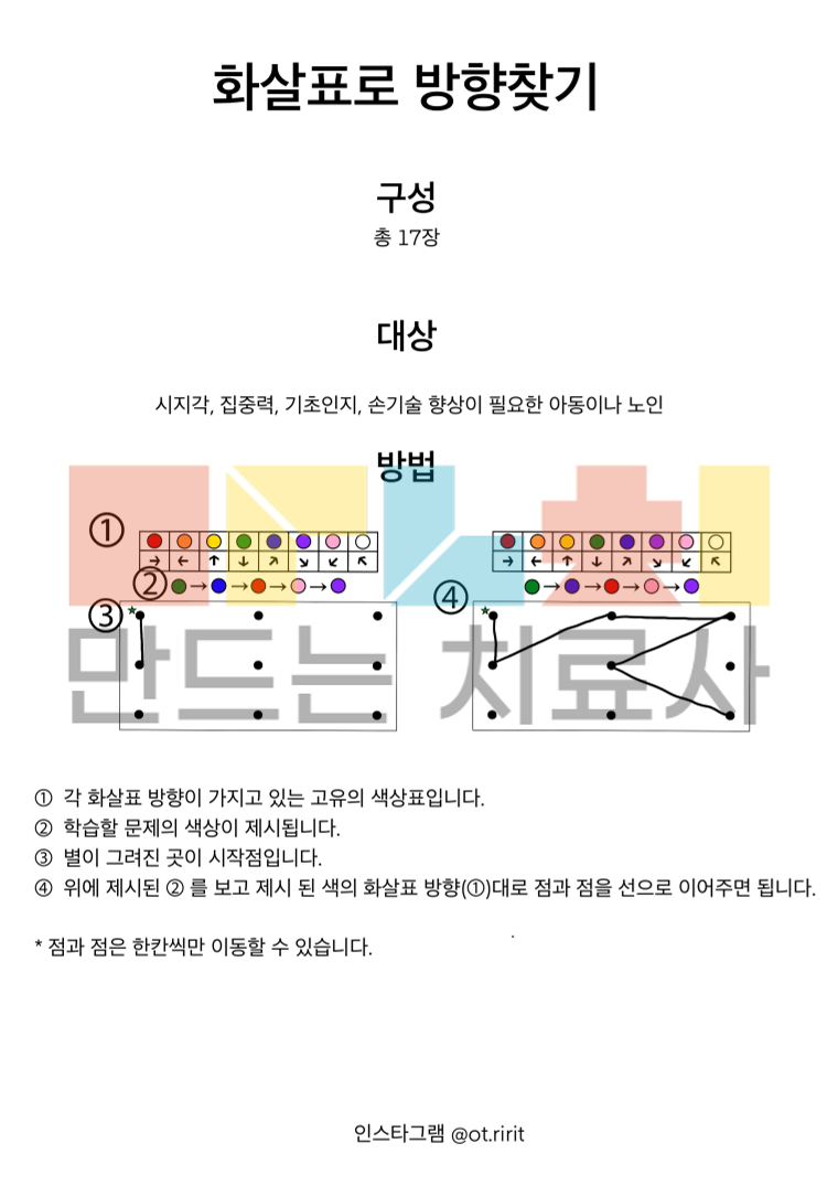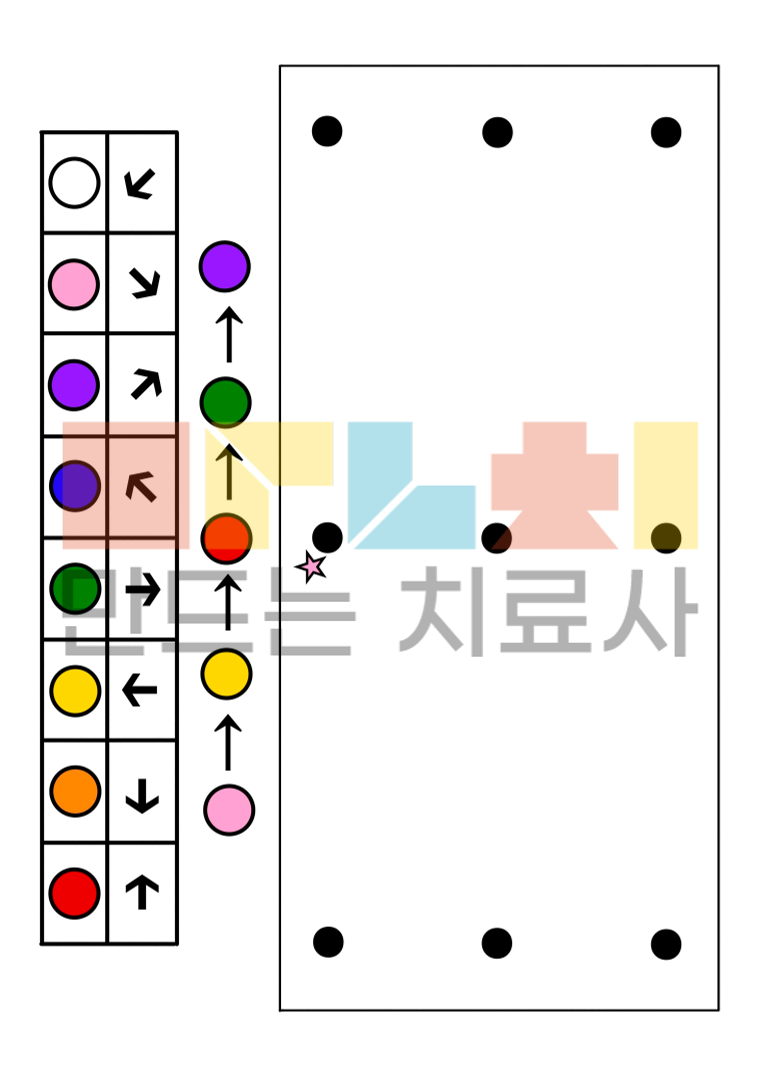 가로형태의 페이퍼입니다. 색이 칠해진 원형을 순서대로 보고 그 원형의 색이 가지고 있는 화살표의 방향대로 밑에 점들을 선으로 연결하면 됩니다.