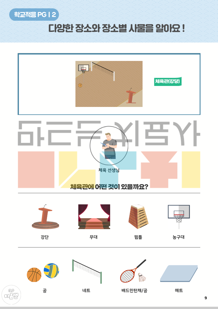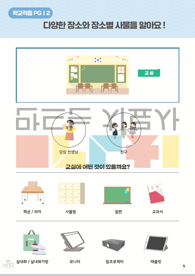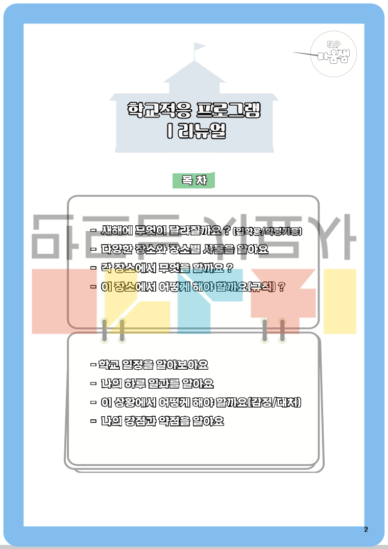 <학교적응PG 구성> 1. 새해에 무엇이 달라질까요? 2. 다양한 장소와 장소별 사물을 알아요 3. 각 장소에서 무엇을 할까요? 4. 이 장소에서 어떻게 해야 할까요(규칙) 5. 학교 일정을 알아보아요 6. 나의 하루 일과를 알아요 7. 이 상황에서 어떻게 해야 할까요(감정/대처) 8. 나의 강점과 약점을 알아요 <어떻게 리뉴얼되었나요?> 1. 활동 구성 보안 - 보다 다양한 학교 환경을 경험할 수 있도록 활동 구성을 확장 - 학교생활과 관련된 다양한 이야기 상황을 제시하고, 각 상황에 대한 구체적이고 단계적인 대처 방법을 학습할 수 있도록 구성 - 아동의 강점과 어려움을 함께 탐색하고, 이를 바탕으로 한 대처 연습을 통해 실질적인 학교 적응을 지원 2. 학교 현장 흐름 반영 - 최근 학교 운영 흐름을 반영하여 방과후학교 및 돌봄교실 관련 활동 새롭게 추가 3. 어휘 구성 강화 - 학교 적응에 필수적인 핵심 어휘를 보다 풍성하고 체계적으로 포함 (학교 내 장소·사물, 학교 규칙, 생활 표현 등) 4. 시각 자료 개선 - 기존보다 현실과 유사한 표현의 그림체를 적용하여 아동이 실제 학교 상황을 보다 쉽게 이해하고 몰입할 수 있도록 함 - 전반적인 그림체의 통일감과 완성도를 높임