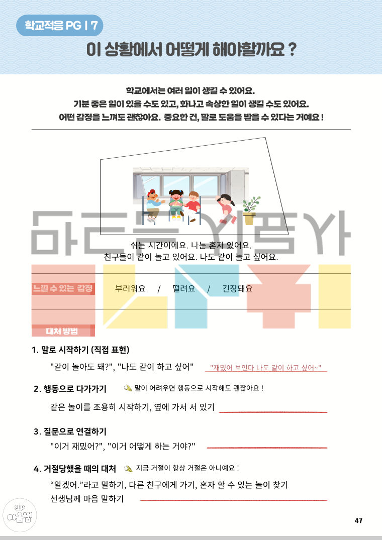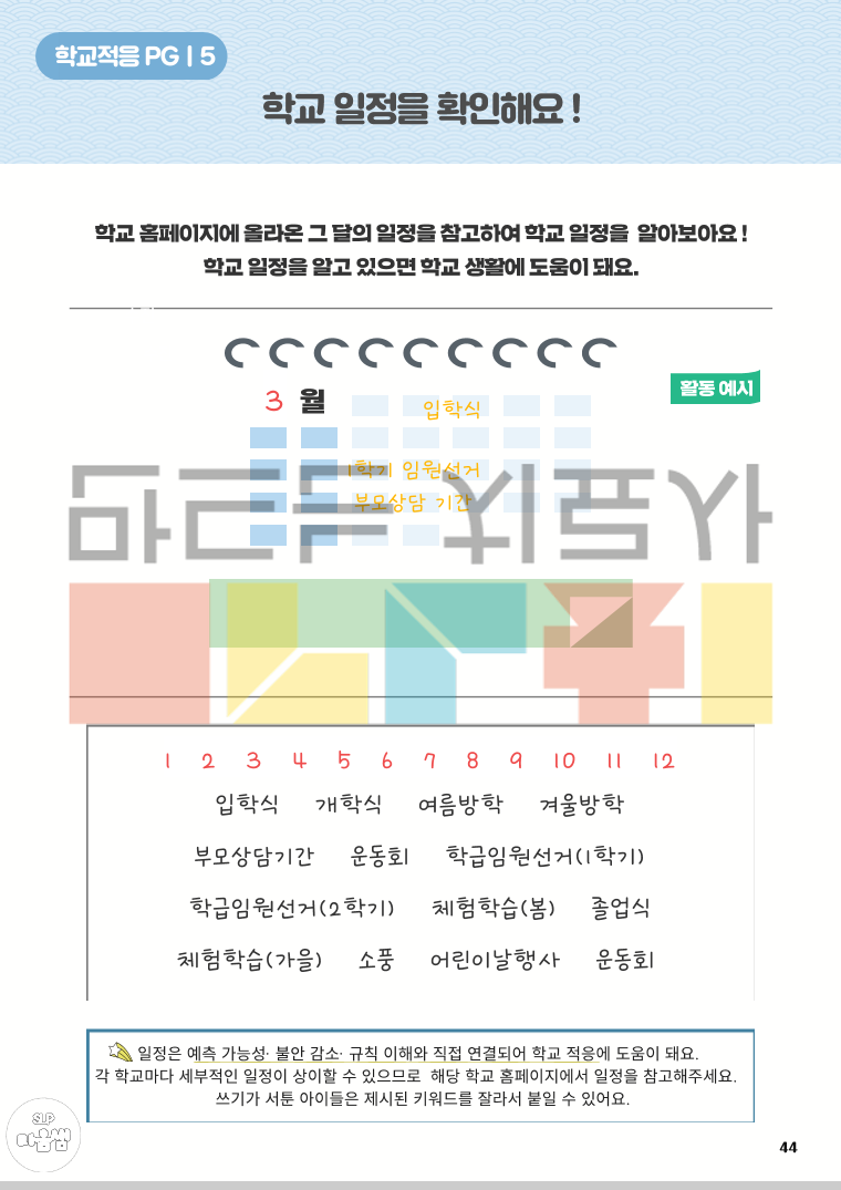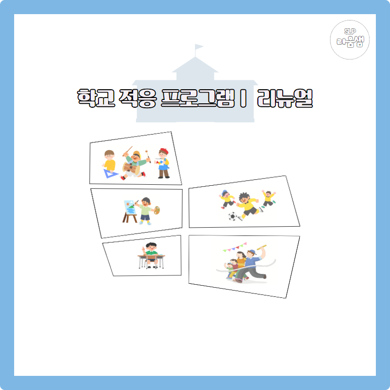<학교적응PG 구성> 1. 새해에 무엇이 달라질까요? 2. 다양한 장소와 장소별 사물을 알아요 3. 각 장소에서 무엇을 할까요? 4. 이 장소에서 어떻게 해야 할까요(규칙) 5. 학교 일정을 알아보아요 6. 나의 하루 일과를 알아요 7. 이 상황에서 어떻게 해야 할까요(감정/대처) 8. 나의 강점과 약점을 알아요 <어떻게 리뉴얼되었나요?> 1. 활동 구성 보안 - 보다 다양한 학교 환경을 경험할 수 있도록 활동 구성을 확장 - 학교생활과 관련된 다양한 이야기 상황을 제시하고, 각 상황에 대한 구체적이고 단계적인 대처 방법을 학습할 수 있도록 구성 - 아동의 강점과 어려움을 함께 탐색하고, 이를 바탕으로 한 대처 연습을 통해 실질적인 학교 적응을 지원 2. 학교 현장 흐름 반영 - 최근 학교 운영 흐름을 반영하여 방과후학교 및 돌봄교실 관련 활동 새롭게 추가 3. 어휘 구성 강화 - 학교 적응에 필수적인 핵심 어휘를 보다 풍성하고 체계적으로 포함 (학교 내 장소·사물, 학교 규칙, 생활 표현 등) 4. 시각 자료 개선 - 기존보다 현실과 유사한 표현의 그림체를 적용하여 아동이 실제 학교 상황을 보다 쉽게 이해하고 몰입할 수 있도록 함 - 전반적인 그림체의 통일감과 완성도를 높임