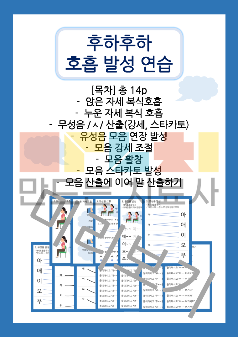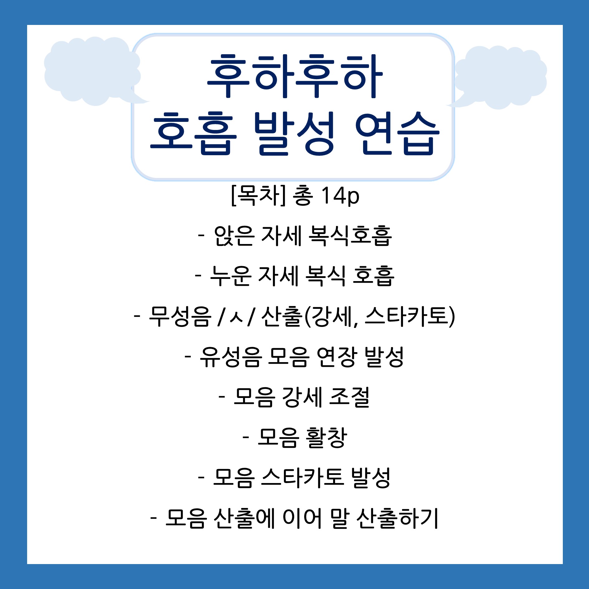 호흡과 발성 연습 활동이 담긴 활동지 입니다! 치료사의 지시와 함께 제시 한 후 가정 과제로 배부하기 좋은 자료입니다!