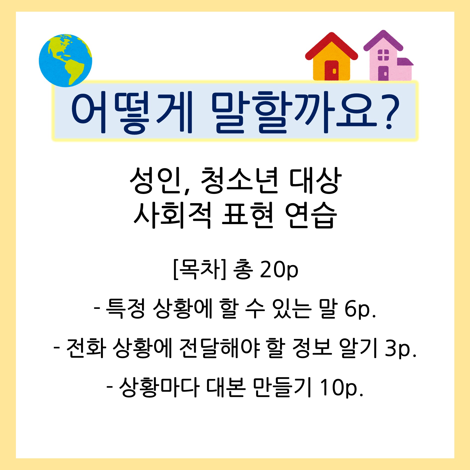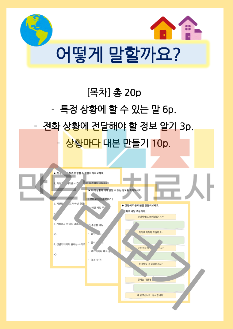 성인과 청소년 대상으로 지역사회에 나가 실질적으로 사용할 수 있는 표현 연습을 위해 만들어진 활동지 입니다!