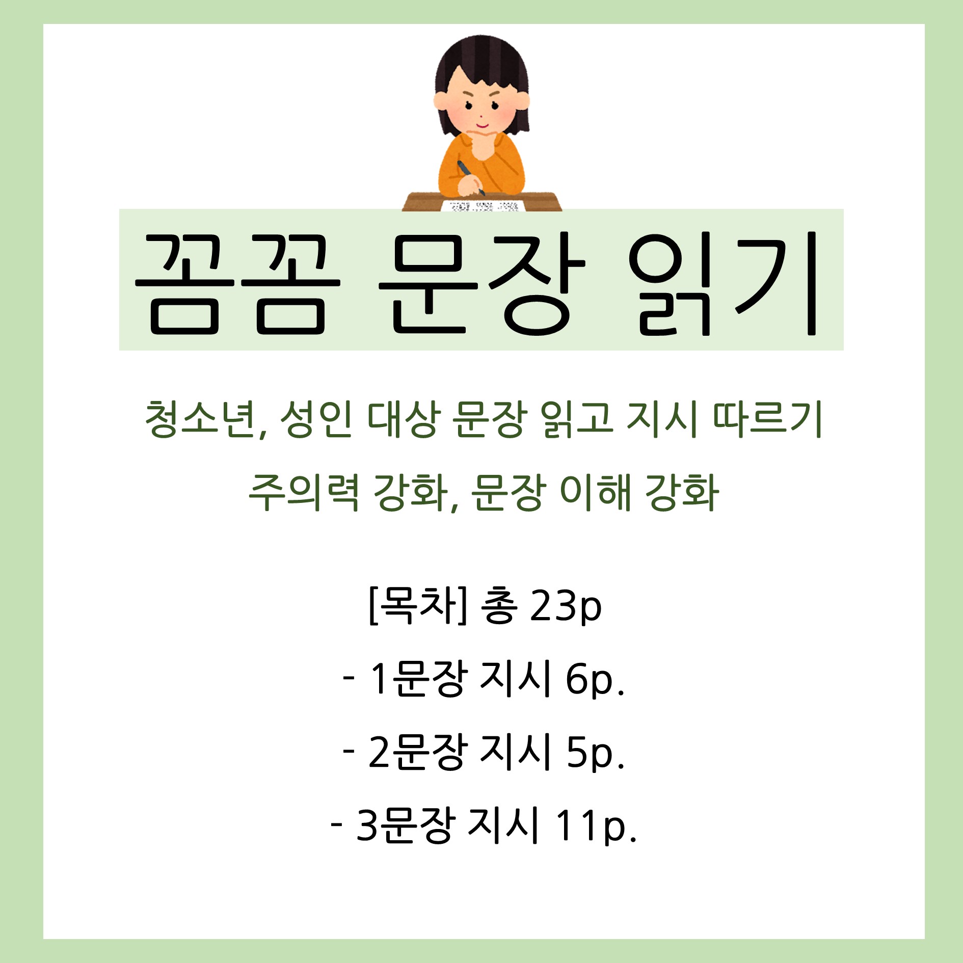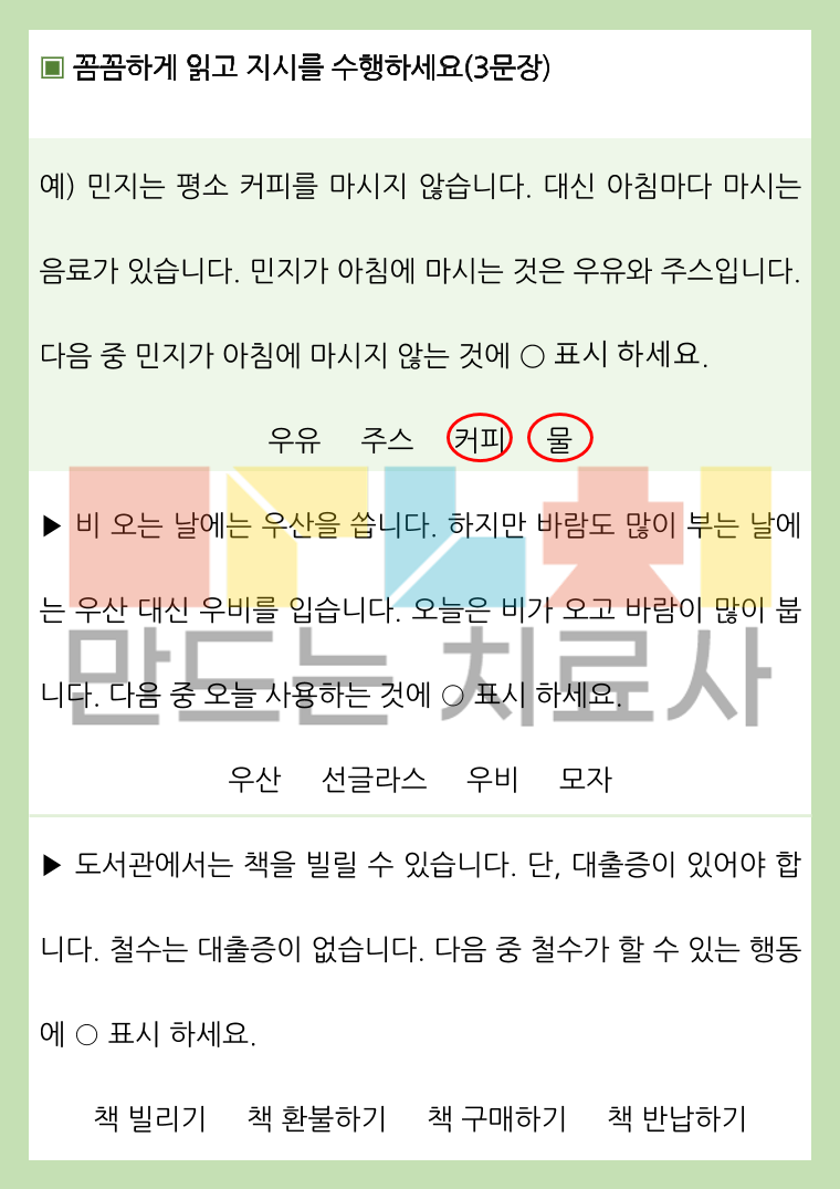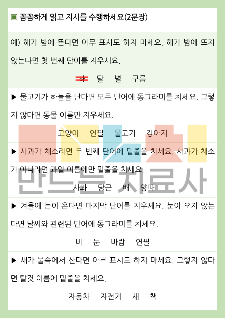 성인과 청소년 대상 1~3문장 읽고 이해하여 지시를 수행하는 활동지입니다!