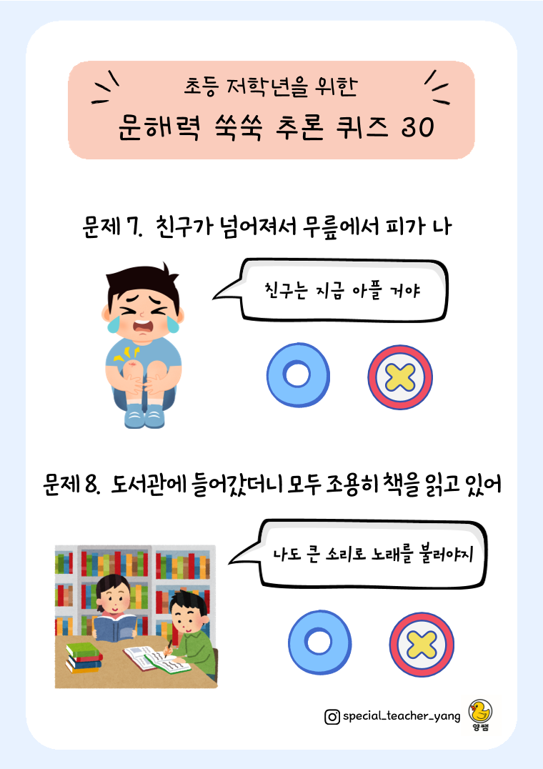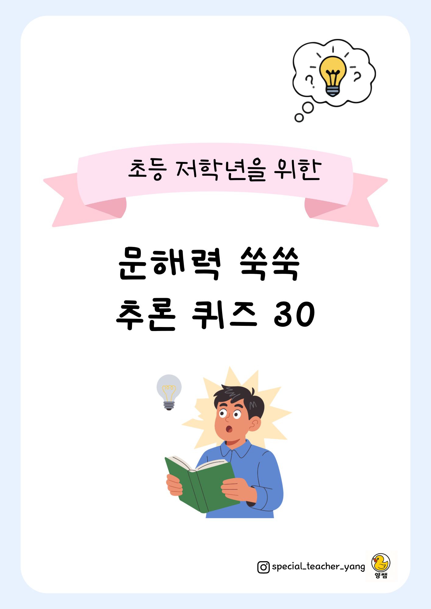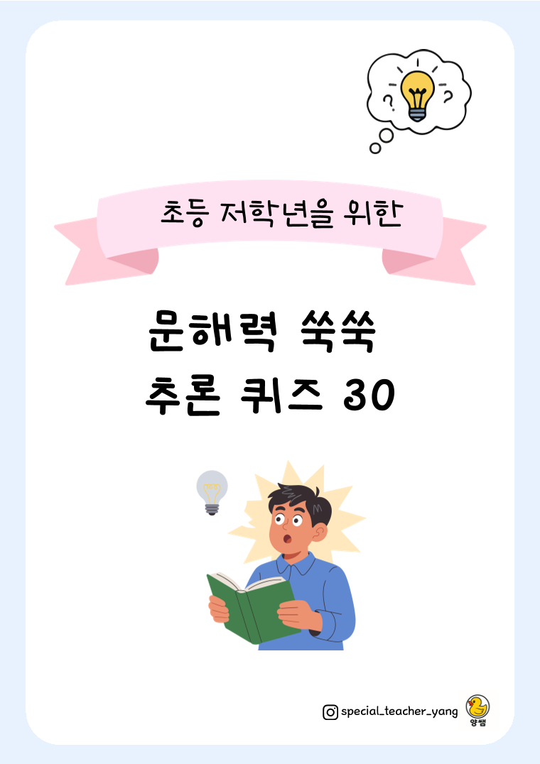 한 문장을 읽고 추론한 내용에 대해 옳고 그름을 고르는 활동지입니다. 초등 저학년 (1~2학년) 어휘를 사용하였고 쉬운 난이도입니다. 이 활동지 이후에 저학년 심화버전, 고학년 기본버전, 고학년 심화버전도 업로드 할 예정입니다.