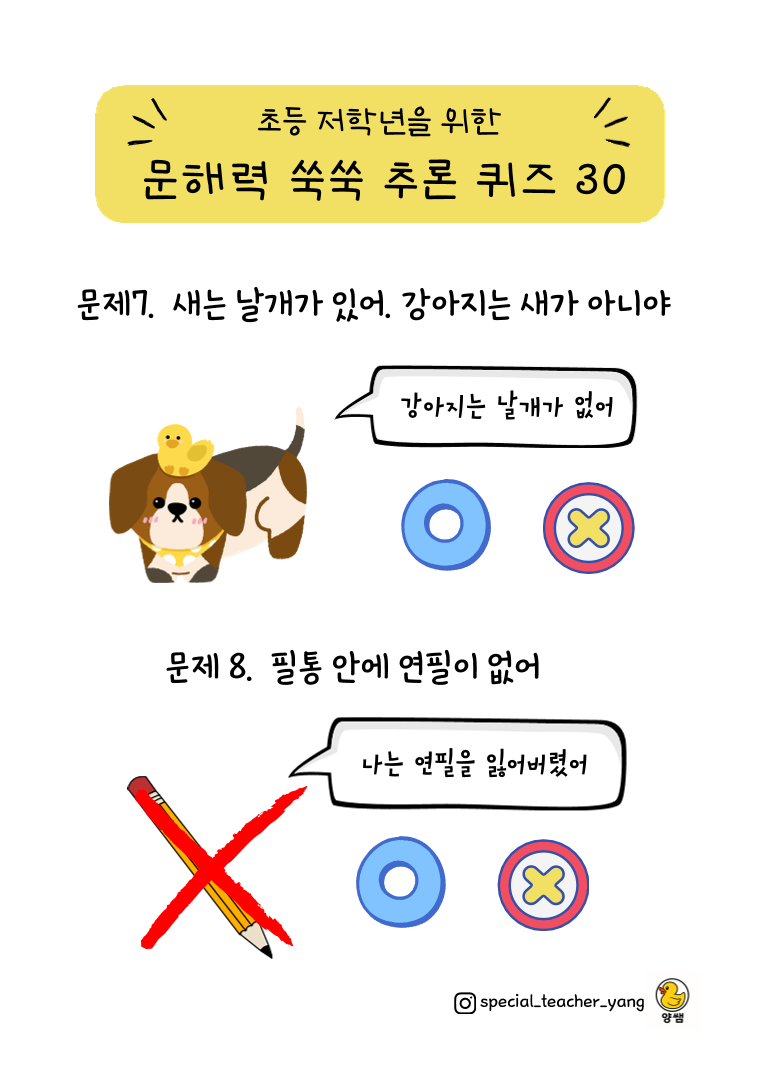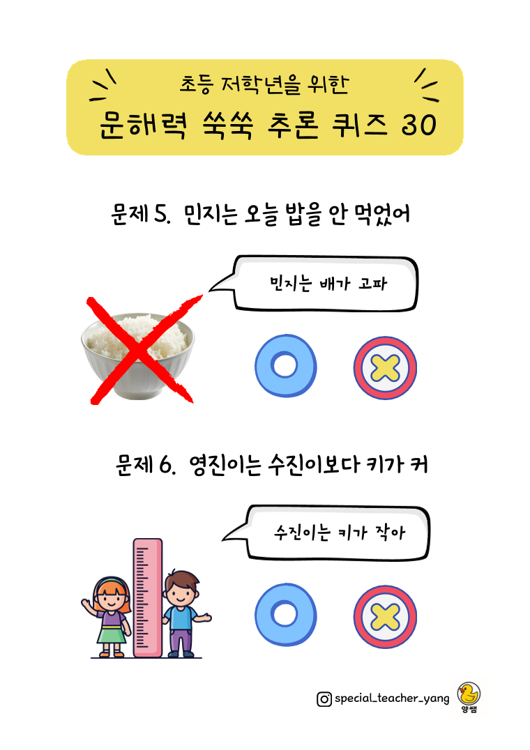 한 문장을 읽고 추론한 내용에 대해 옳고 그름을 고르는 활동지입니다. 초등 저학년 (1~2학년) 어휘를 사용하였고 심화버전입니다. 기존 쉬운 난이도보다는 조금 더 어렵고 확실하게 맞는 것(O)과 맞을 수도 있고 아닐 수도 있는 것(X)를 구분하는 문제입니다.